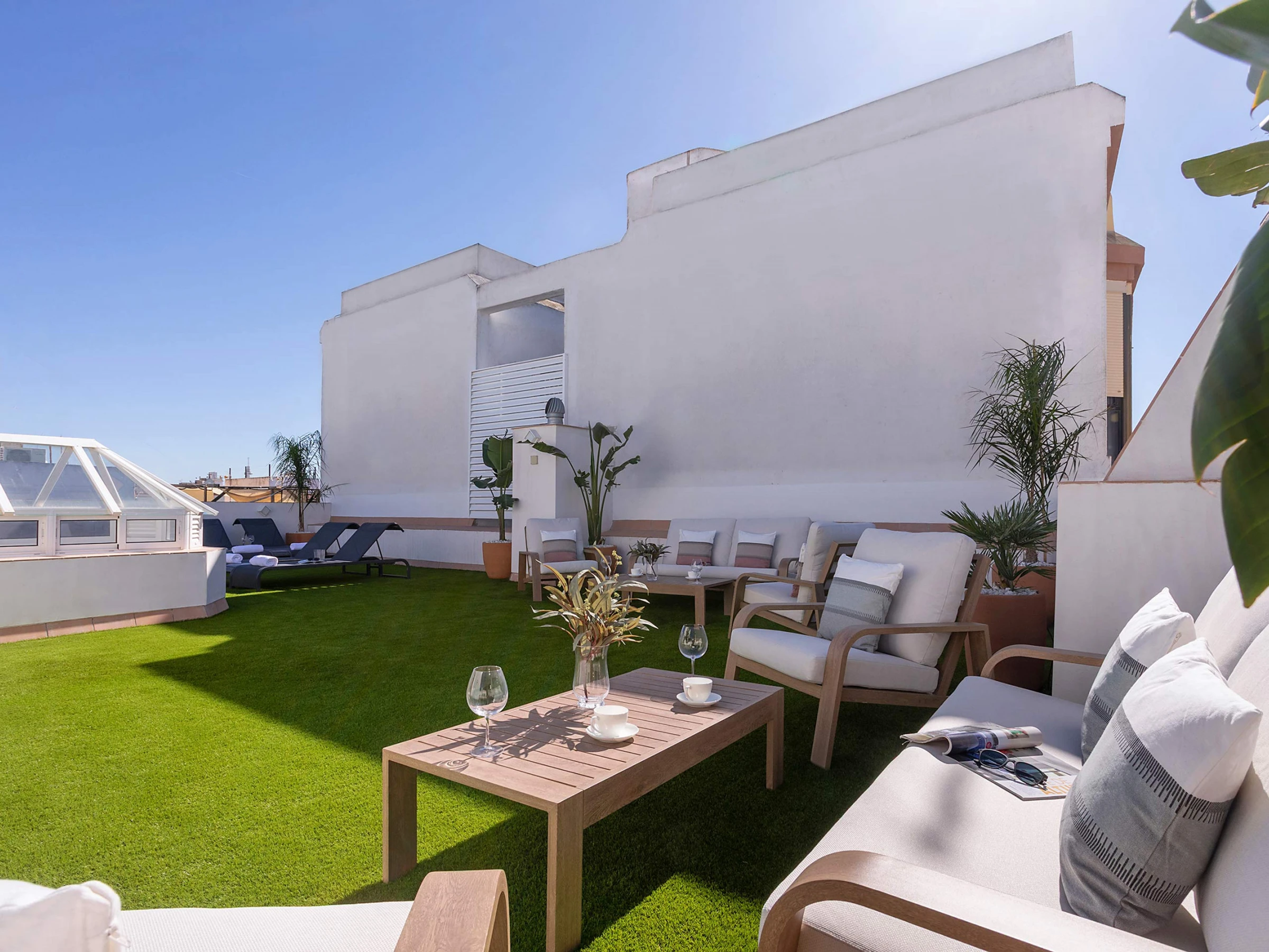 Para disfrutar del sol y de las vistas, los huéspedes tienen acceso a la terraza/solárium comunitaria en la tercera planta, de 136 m², equipada con hamacas, mesa, sillas y césped artificial, un espacio perfecto para relajarse al aire libre.