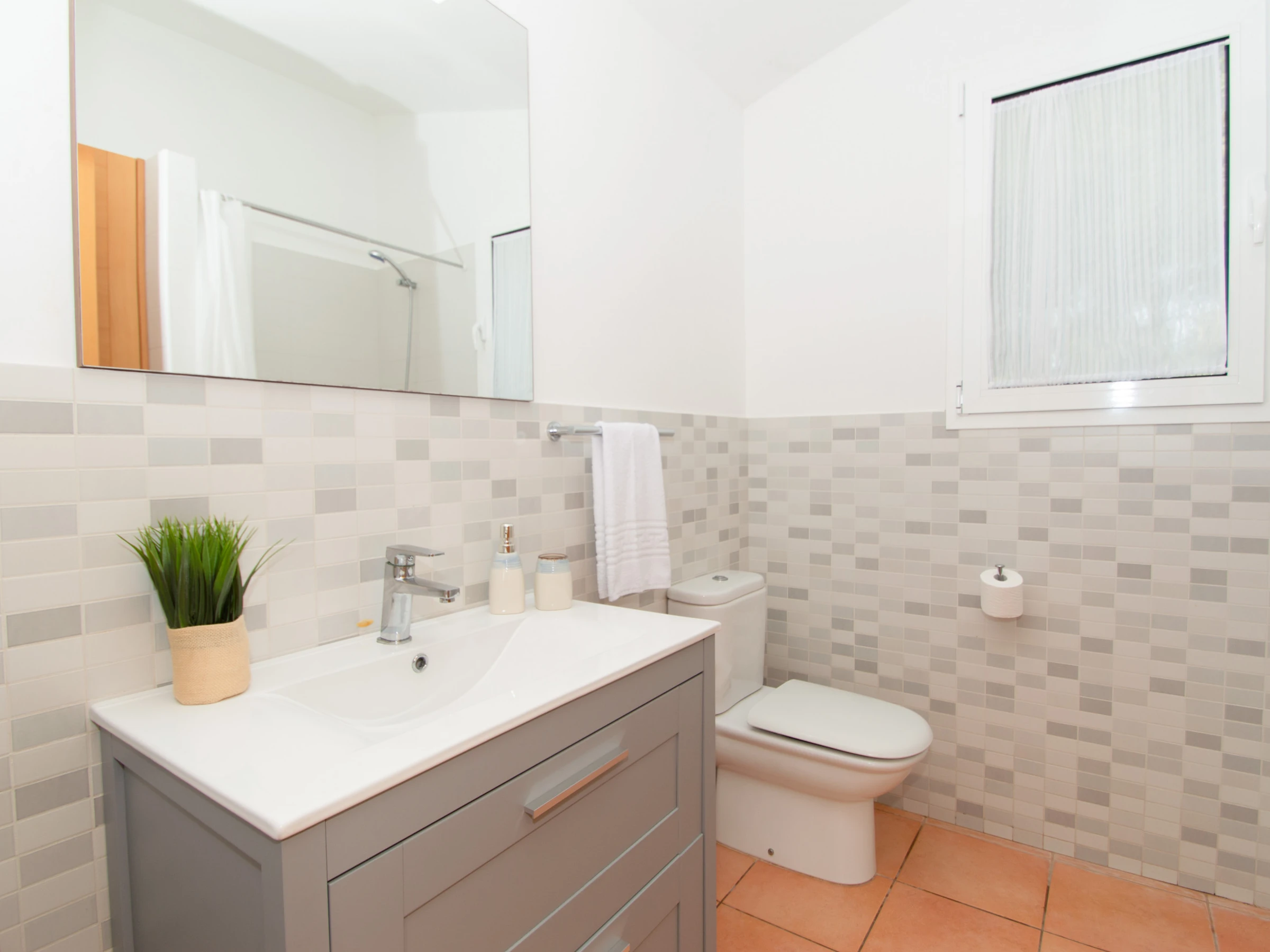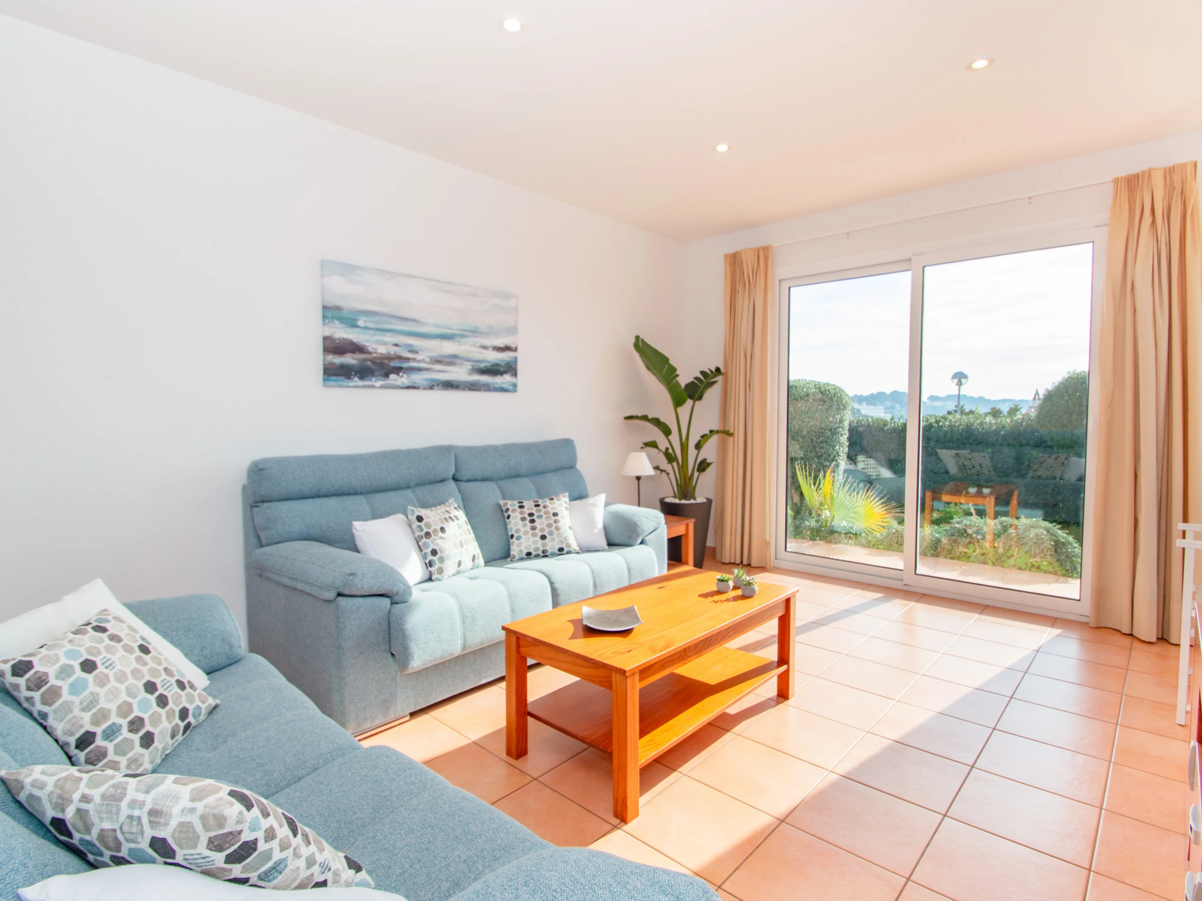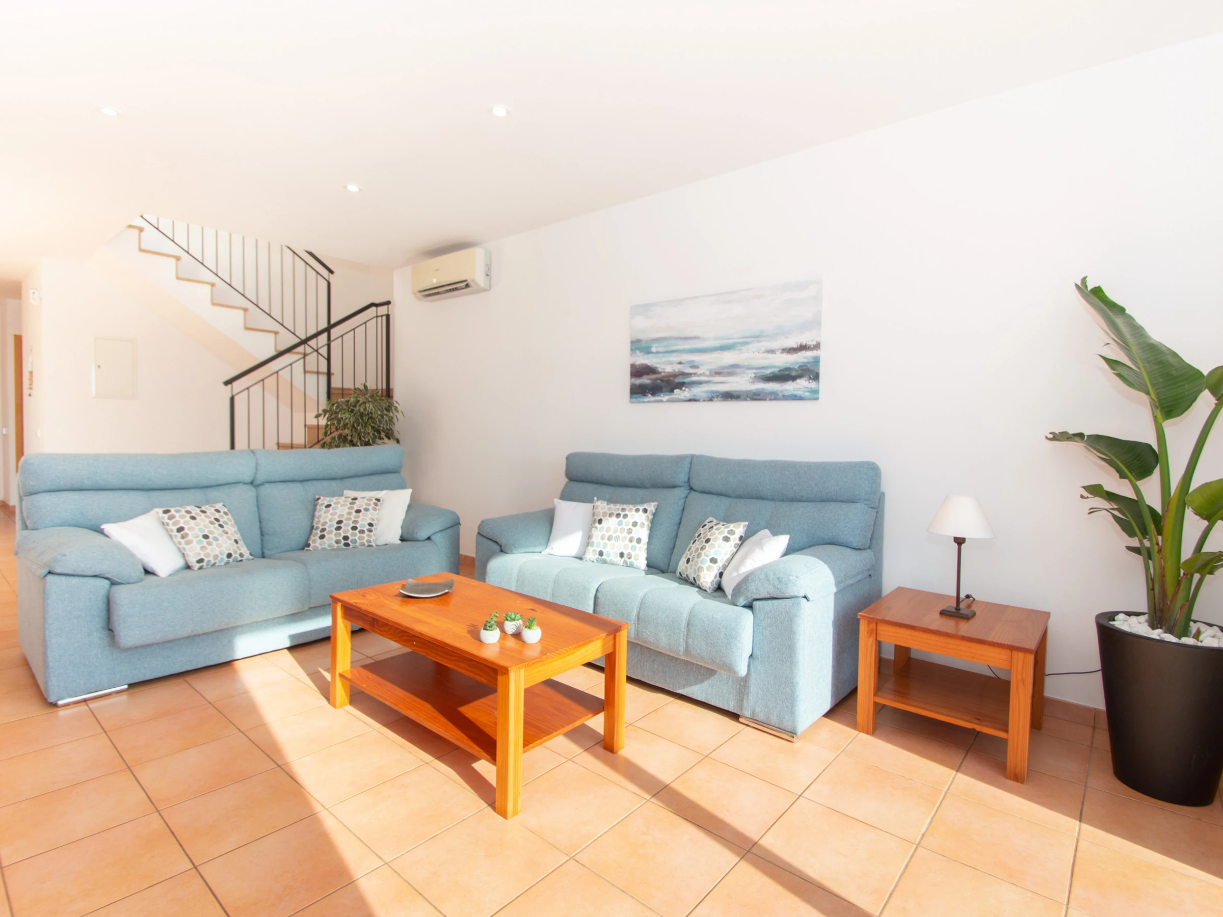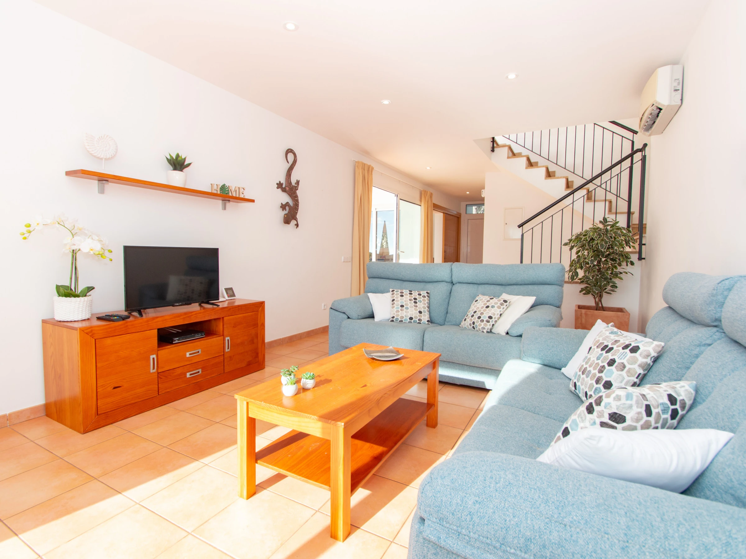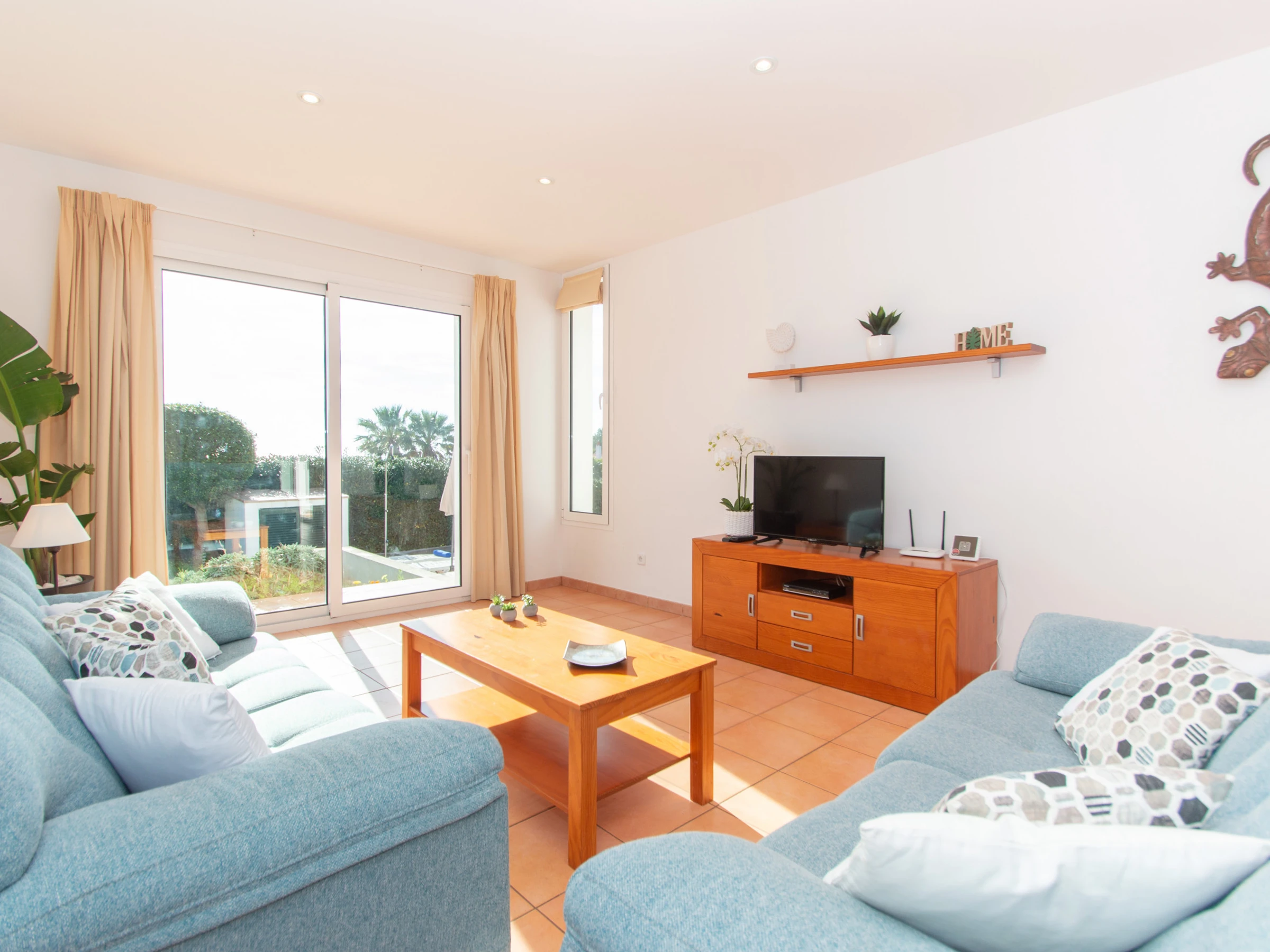 El salón dispone de dos cómodos sofás, TV por satélite, DVD, aire acondicionado y tiene acceso directo a la terraza dónde se encuentra la piscina y las hamacas. En la planta baja, también encontramos el lavadero, equipado con la lavadora, los utensilios de limpieza, plancha y tabla de planchar.