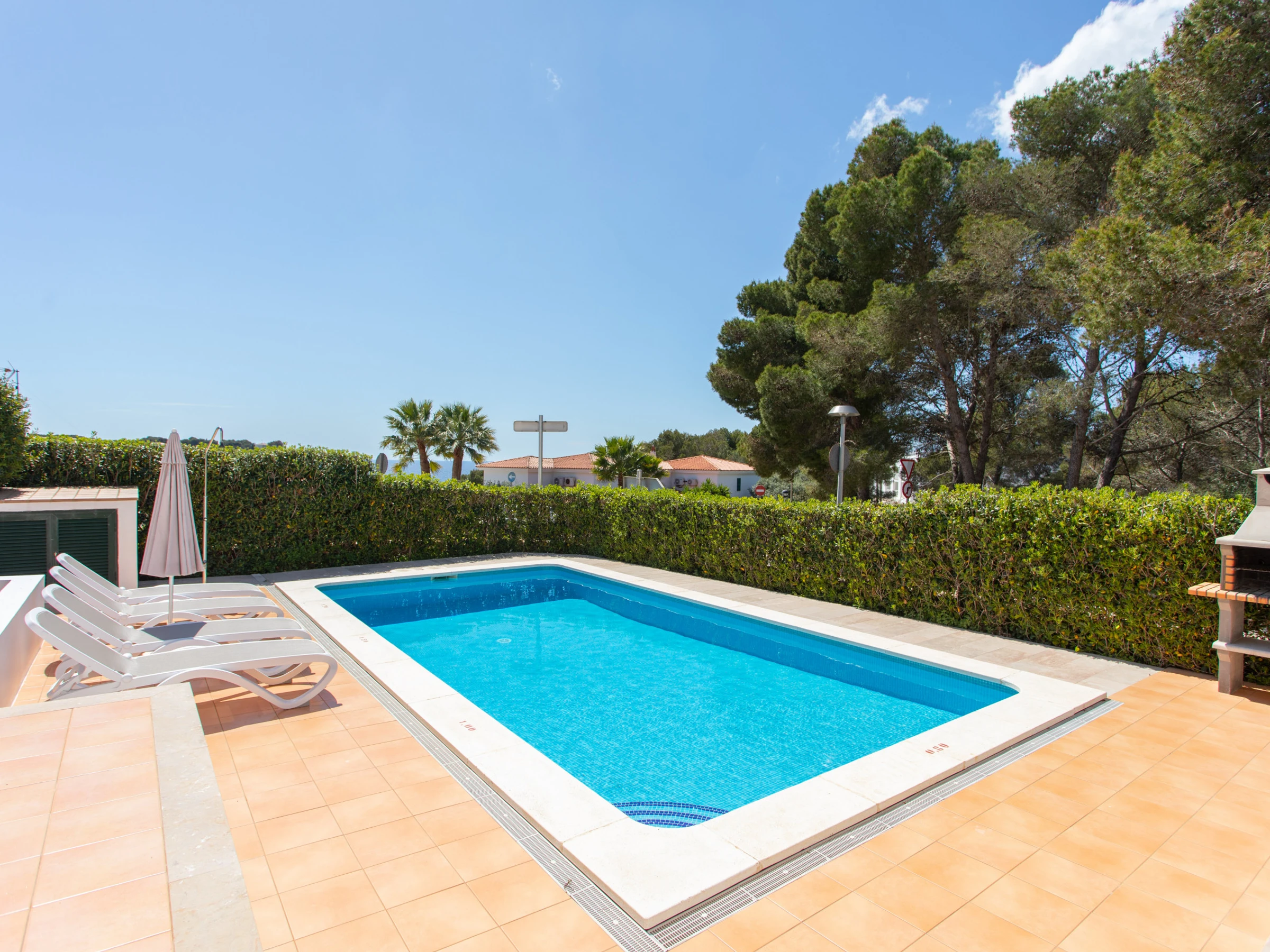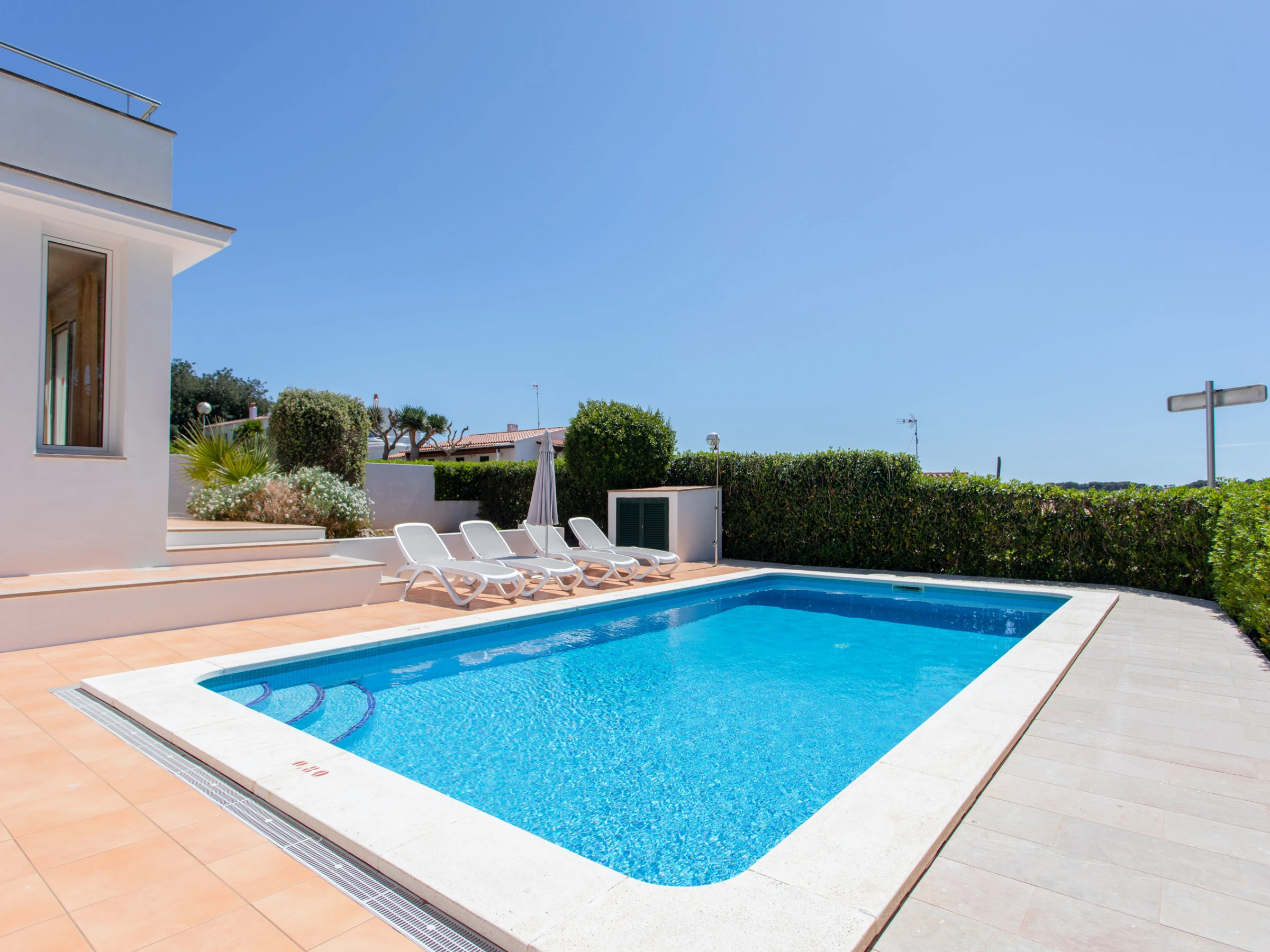 El exterior de la Villa en alquiler en Menorca se sitúa la piscina privada, la barbacoa y la terraza con una zona ajardinada. Dispone de hamacas, sombrillas y todo el mobiliario exterior de jardín necesario para disfrutar del sol, la piscina, y de las comidas y veladas al aire libre.