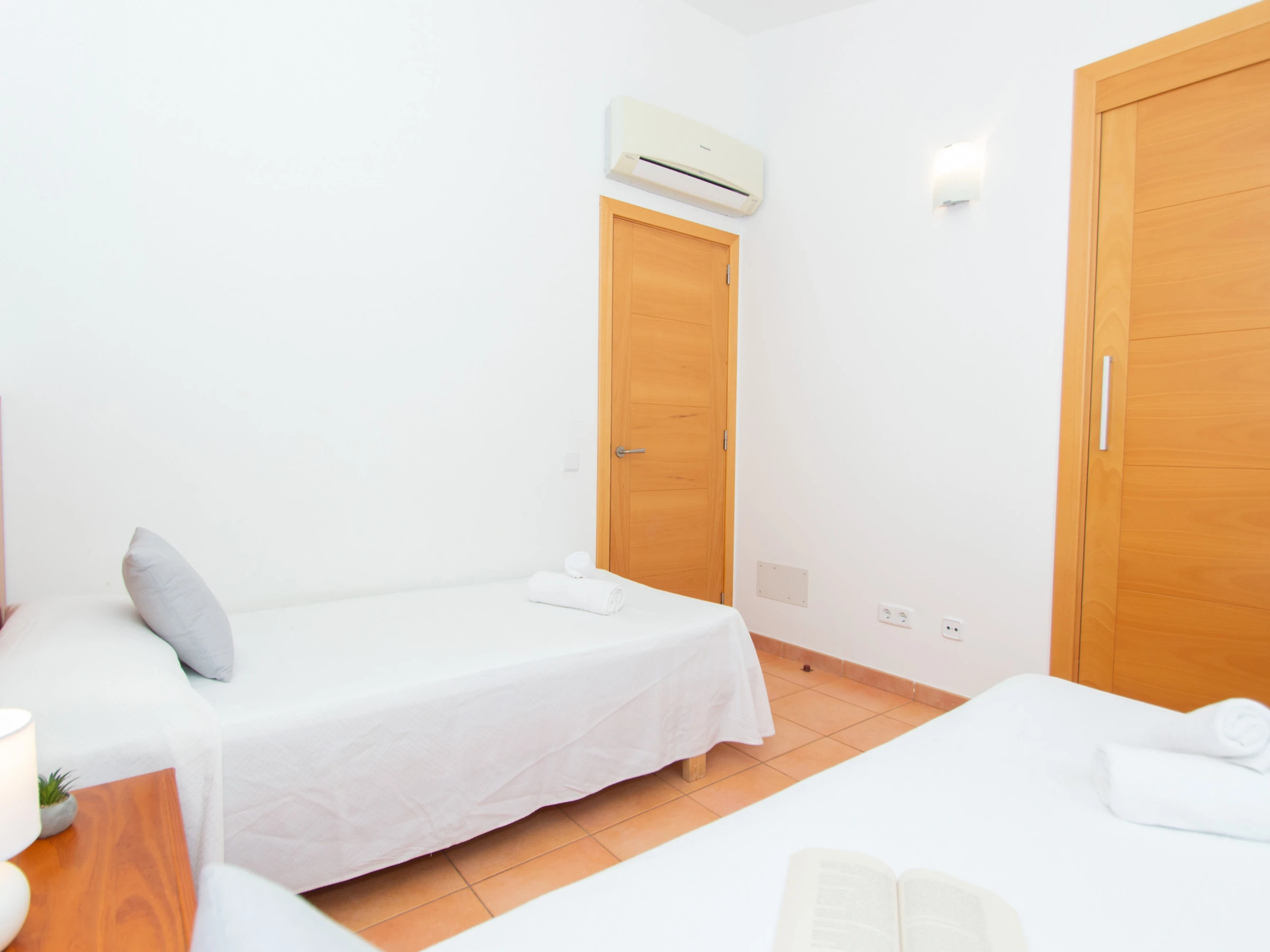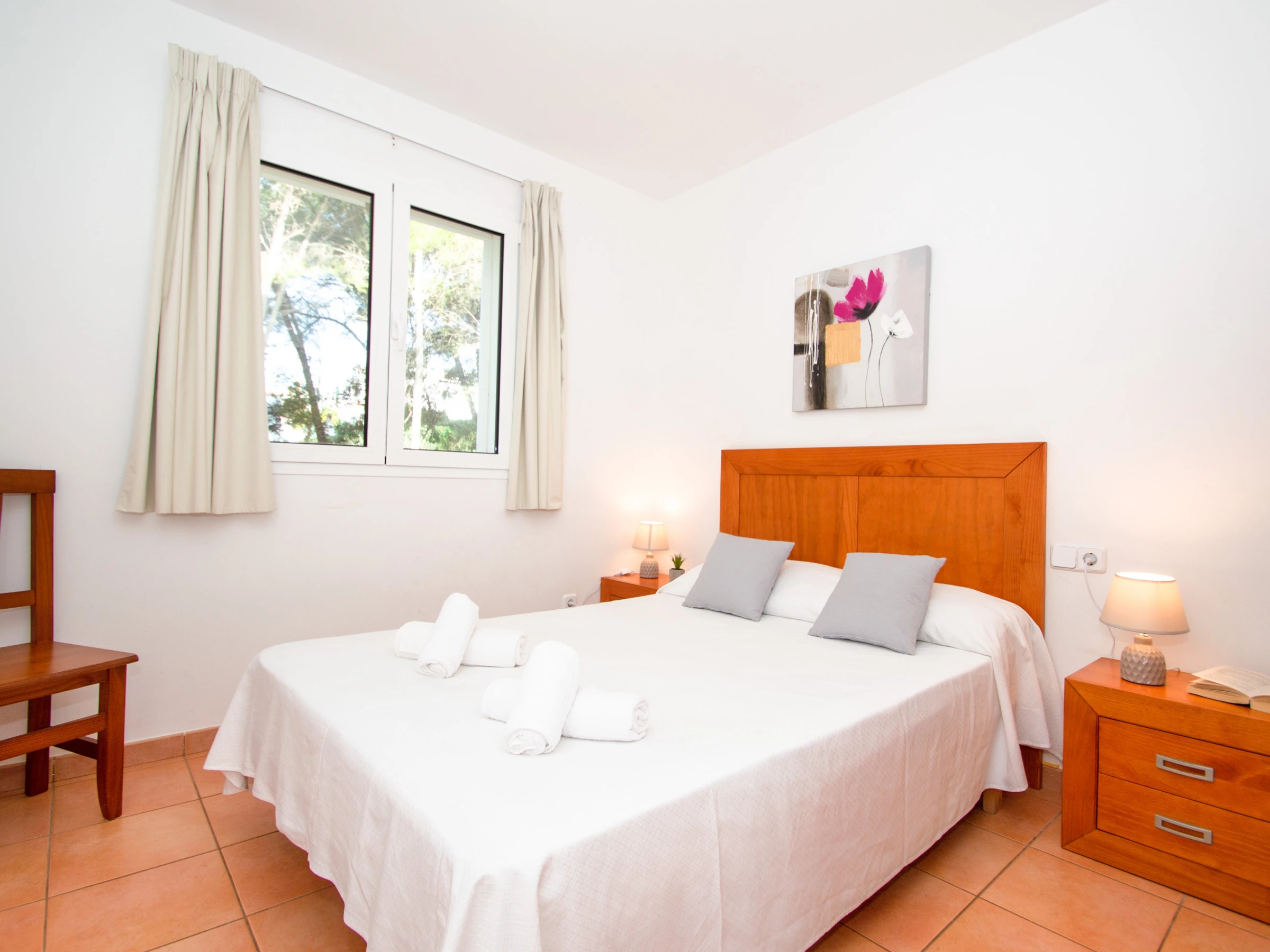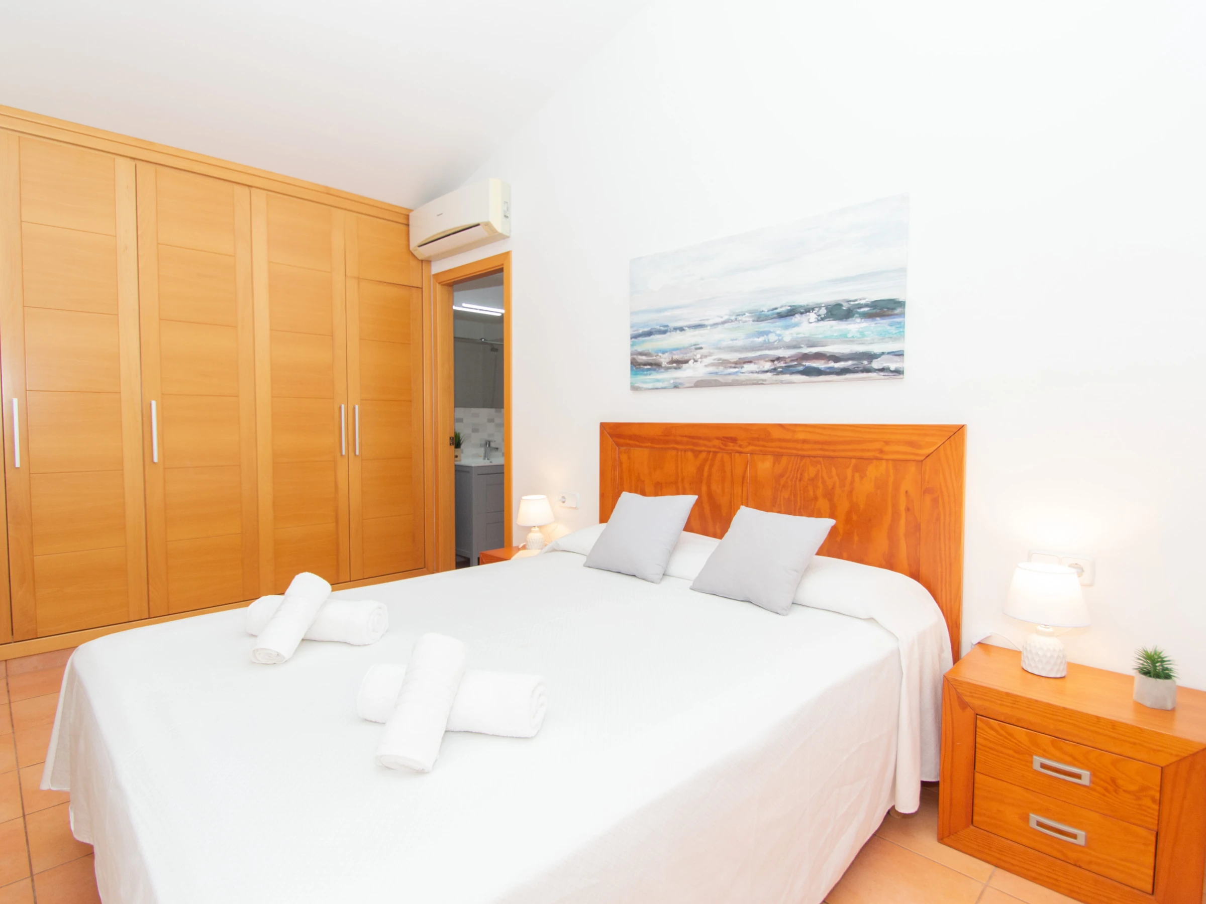 Las habitaciones se reparten en cuatro dormitorios dobles. En la planta baja se encuentra el primer dormitorio que cuenta con una cama de matrimonio y un armario con espacio suficiente para guardar la ropa. En esta planta también se encuentra un espacioso baño totalmente equipado con ducha y secador. En la planta superior se encuentran las otras tres habitaciones dobles y un amplio cuarto de baño que dispone de bañera y secador. Las dos primeras habitaciones que se encuentran, están equipadas con dos camas individuales y un gran armario empotrado. La tercera habitación es la habitación principal en suite, que se conforma con la cama de matrimonio, un amplio armario empotrado y goza además de un bonito balcón privado con vistas a la playa y a Cala Galdana. Además, la habitación principal cuenta con un baño privado en suite totalmente equipado y con ducha. Todos los dormitorios disponen de aire acondicionado. Esta planta superior cuenta también con una preciosa terraza con vistas al mar y a la playa para gozar de unos bonitos atardeceres.
