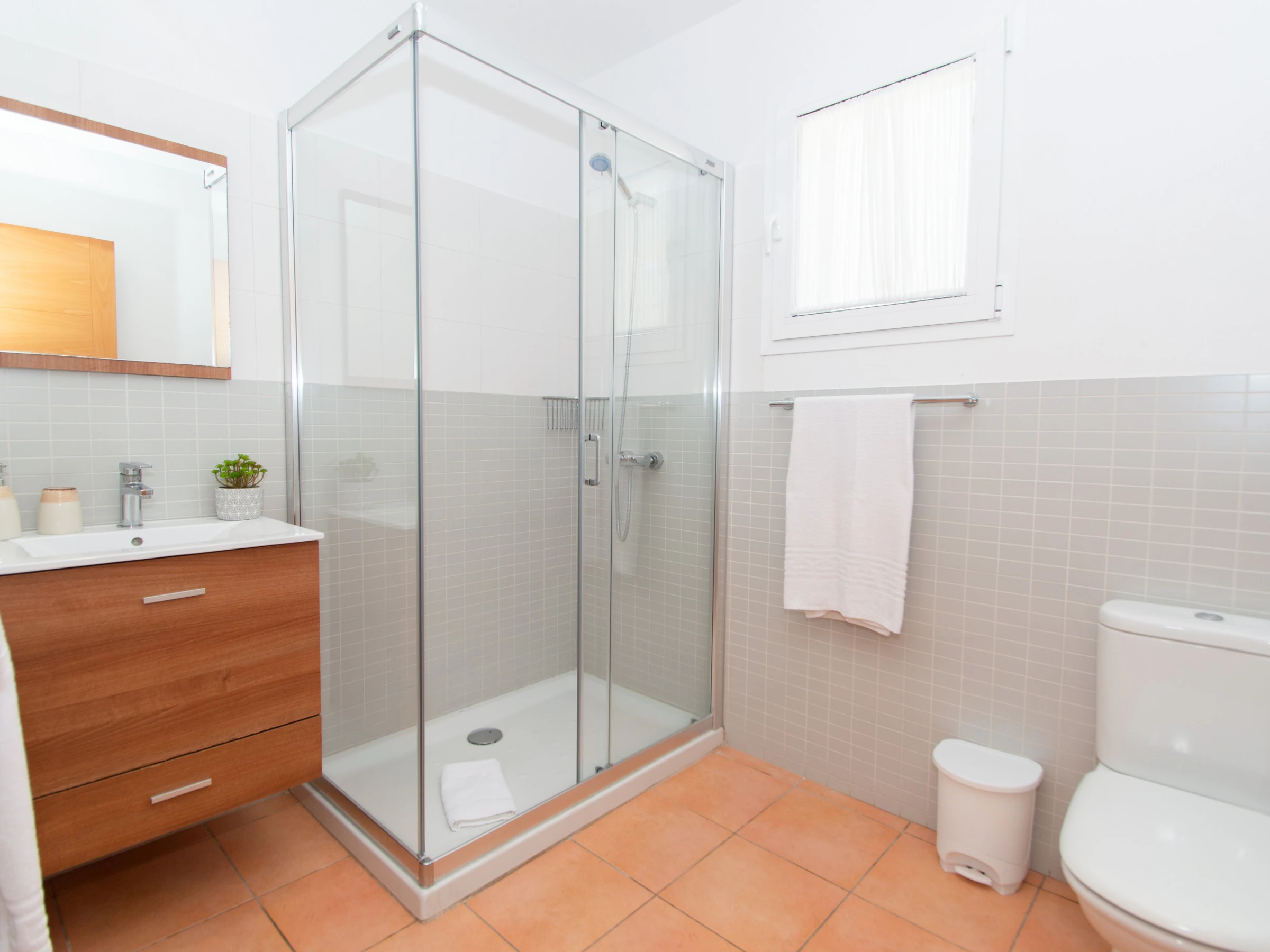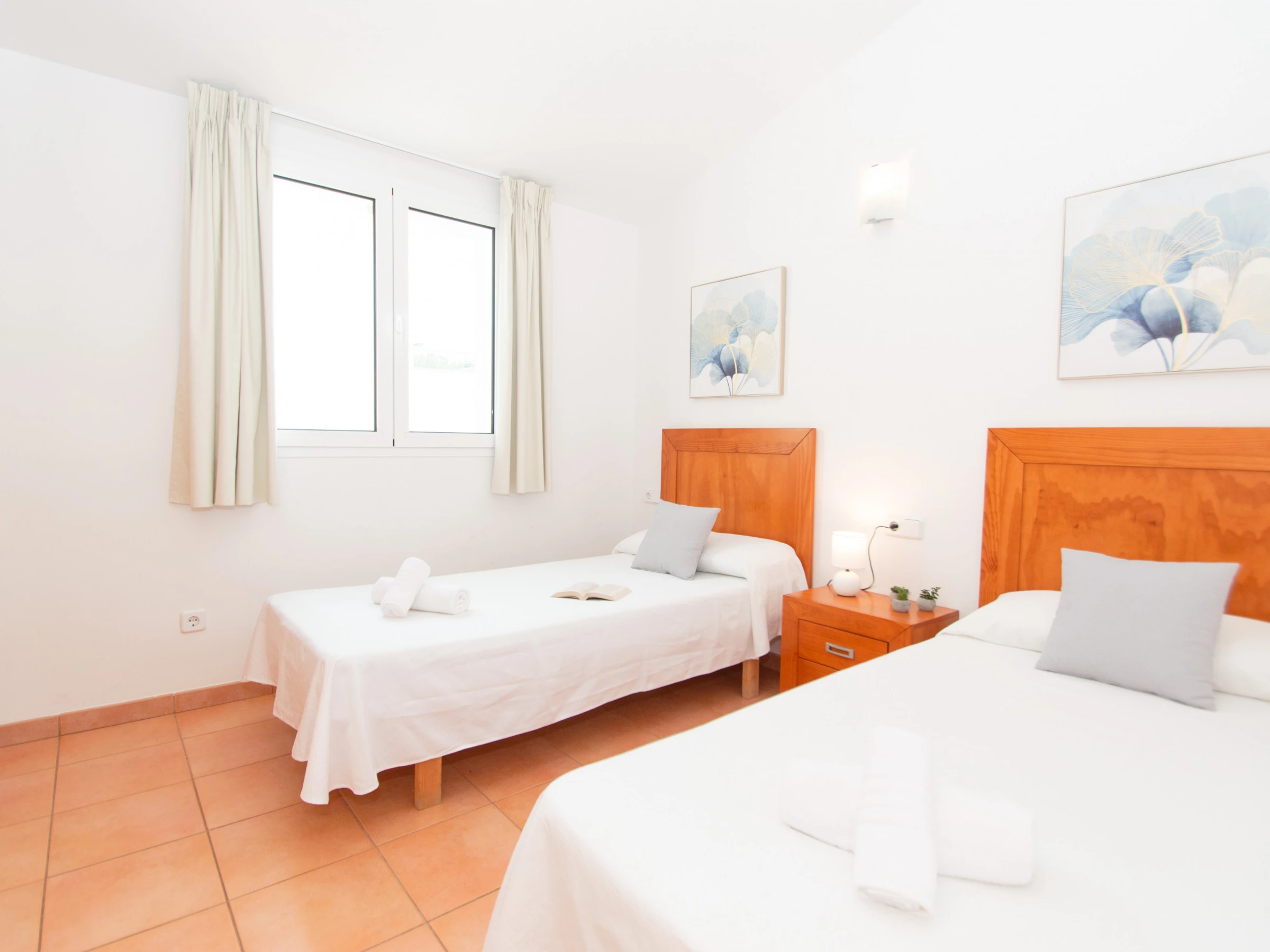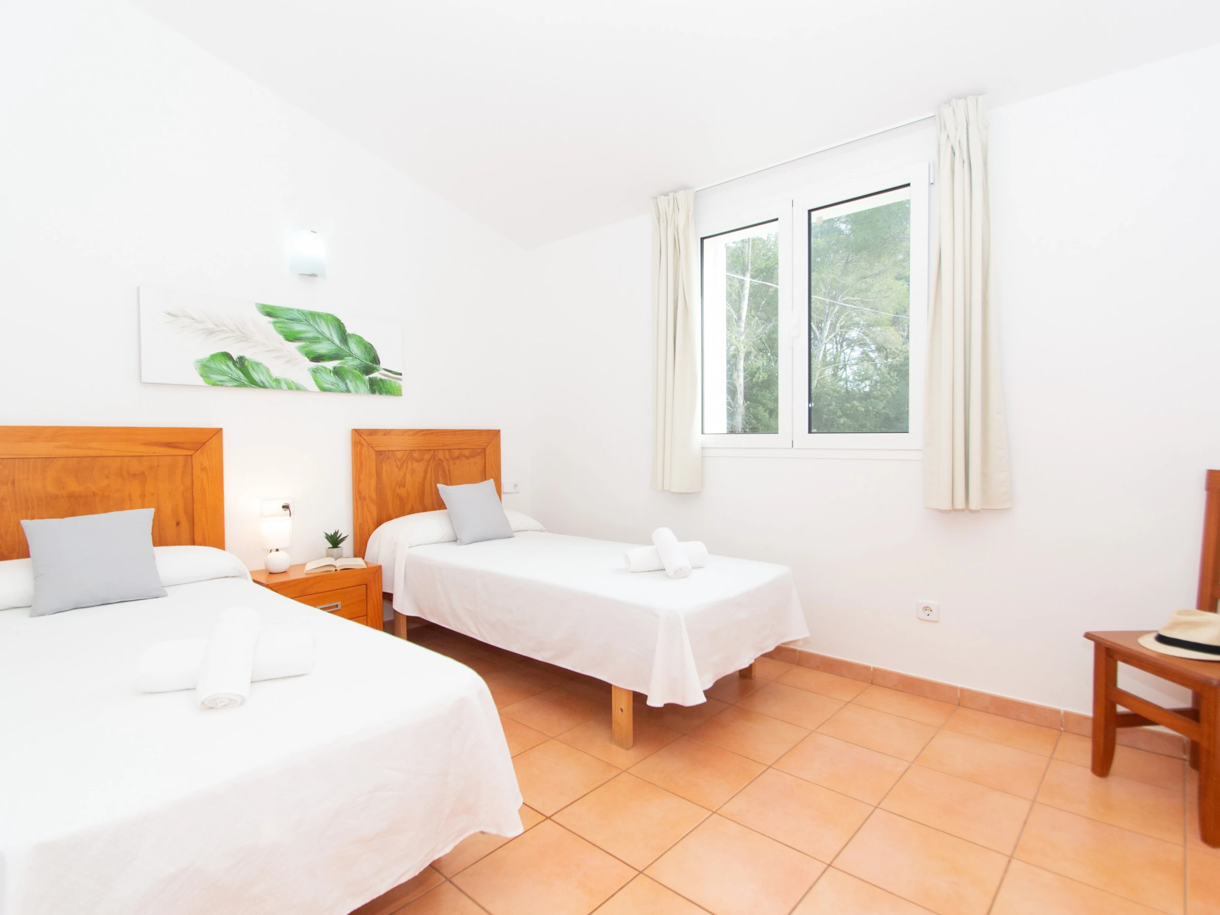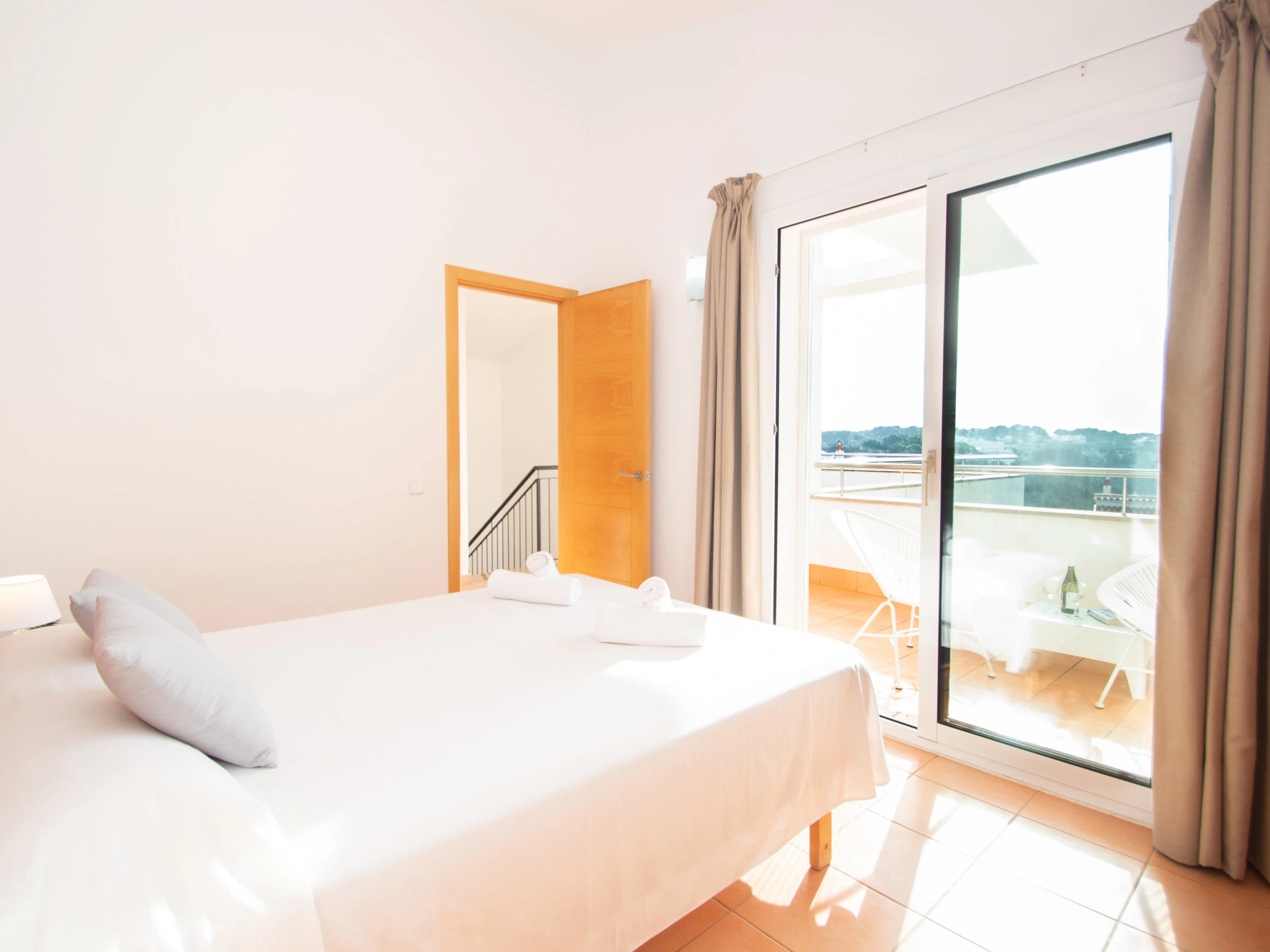 Las habitaciones se reparten en cuatro dormitorios dobles. En la planta baja se encuentra el primer dormitorio que cuenta con una cama de matrimonio y un armario con espacio suficiente para guardar la ropa. En esta planta también se encuentra un espacioso baño totalmente equipado con ducha y secador. En la planta superior se encuentran las otras tres habitaciones dobles y un amplio cuarto de baño que dispone de bañera y secador. Las dos primeras habitaciones que se encuentran, están equipadas con dos camas individuales y un gran armario empotrado. La tercera habitación es la habitación principal en suite, que se conforma con la cama de matrimonio, un amplio armario empotrado y goza además de un bonito balcón privado con vistas a la playa y a Cala Galdana. Además, la habitación principal cuenta con un baño privado en suite totalmente equipado y con ducha. Todos los dormitorios disponen de aire acondicionado. Esta planta superior cuenta también con una preciosa terraza con vistas al mar y a la playa para gozar de unos bonitos atardeceres.