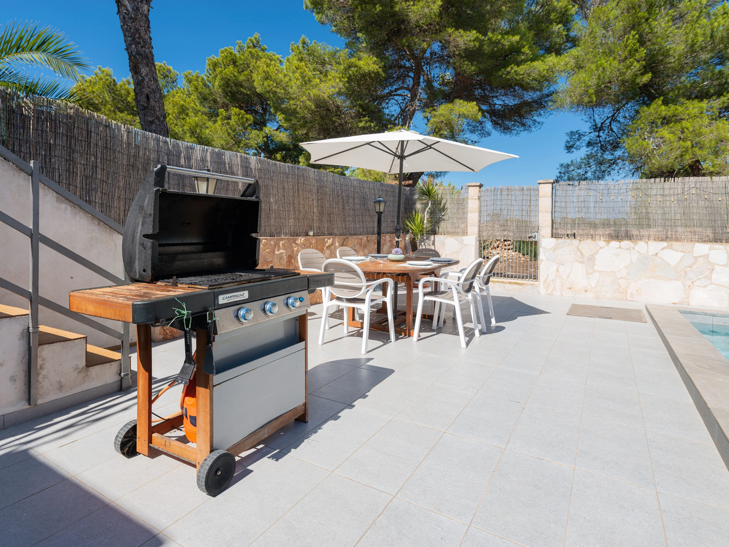 La zona exterior de esta casa cuenta con un porche delantero, con un pequeño jardín, así como un patio en la parte trasera de la casa, con una piscina privada de cloro de 8 m x 4 m, y una profundidad que oscila entre 0,9 - 1,9 m. Alrededor de la piscina, hay 6 tumbonas, para relajarse y disfrutar del sol mediterráneo, mientras sus seres queridos se ponen a preparar una sabrosa barbacoa. Hay una ducha exterior, para quitarse la arena o el cloro. En este patio, seguro que disfrutará de memorables comidas y sobremesas bajo el cielo estrellado. En la parte superior de la casa, hay una gran terraza amueblada, para disfrutar de un poco de intimidad. Como la casa está situada en el pueblo, hay vecinos directos. Sin embargo, el patio tiene total intimidad, debido a los muros a ambos lados.