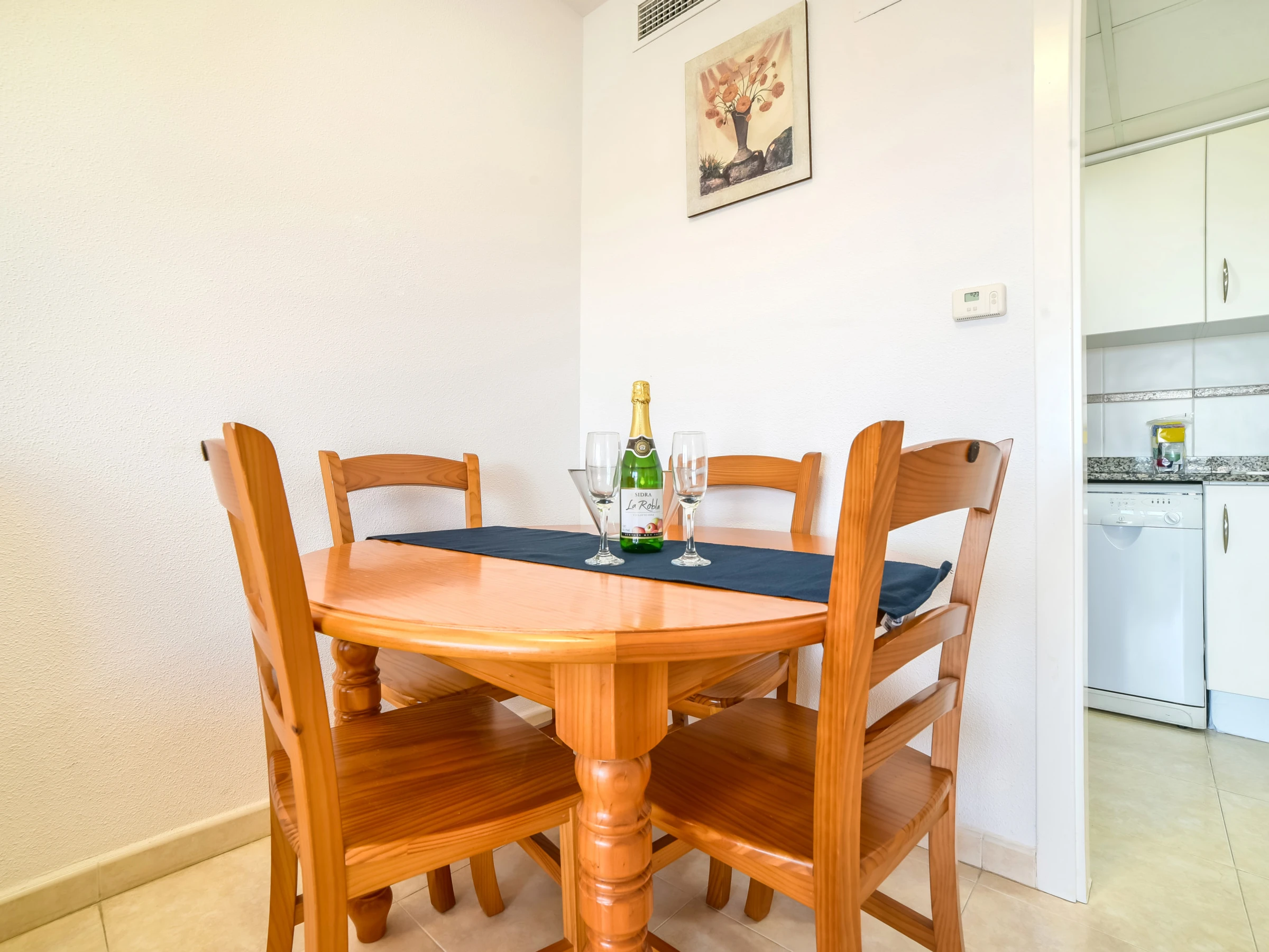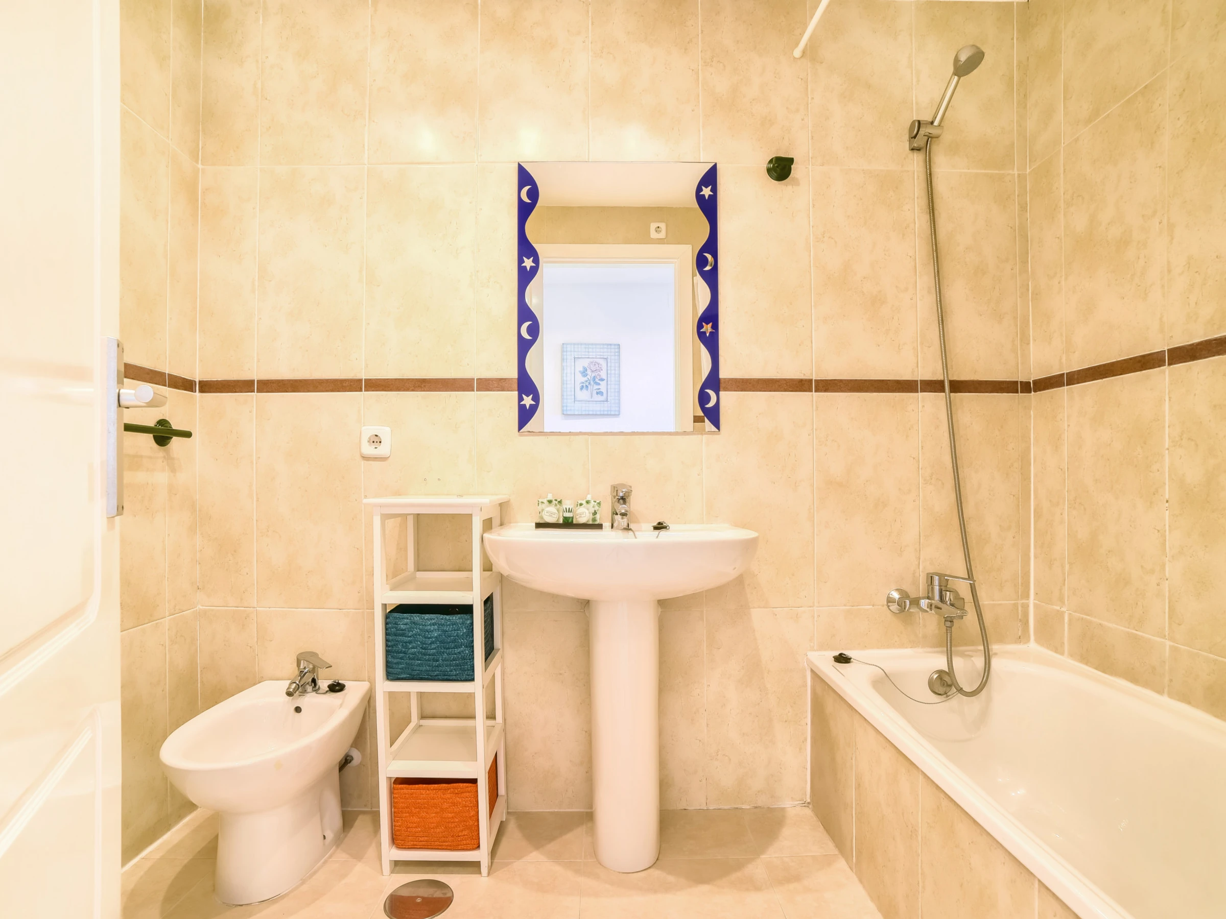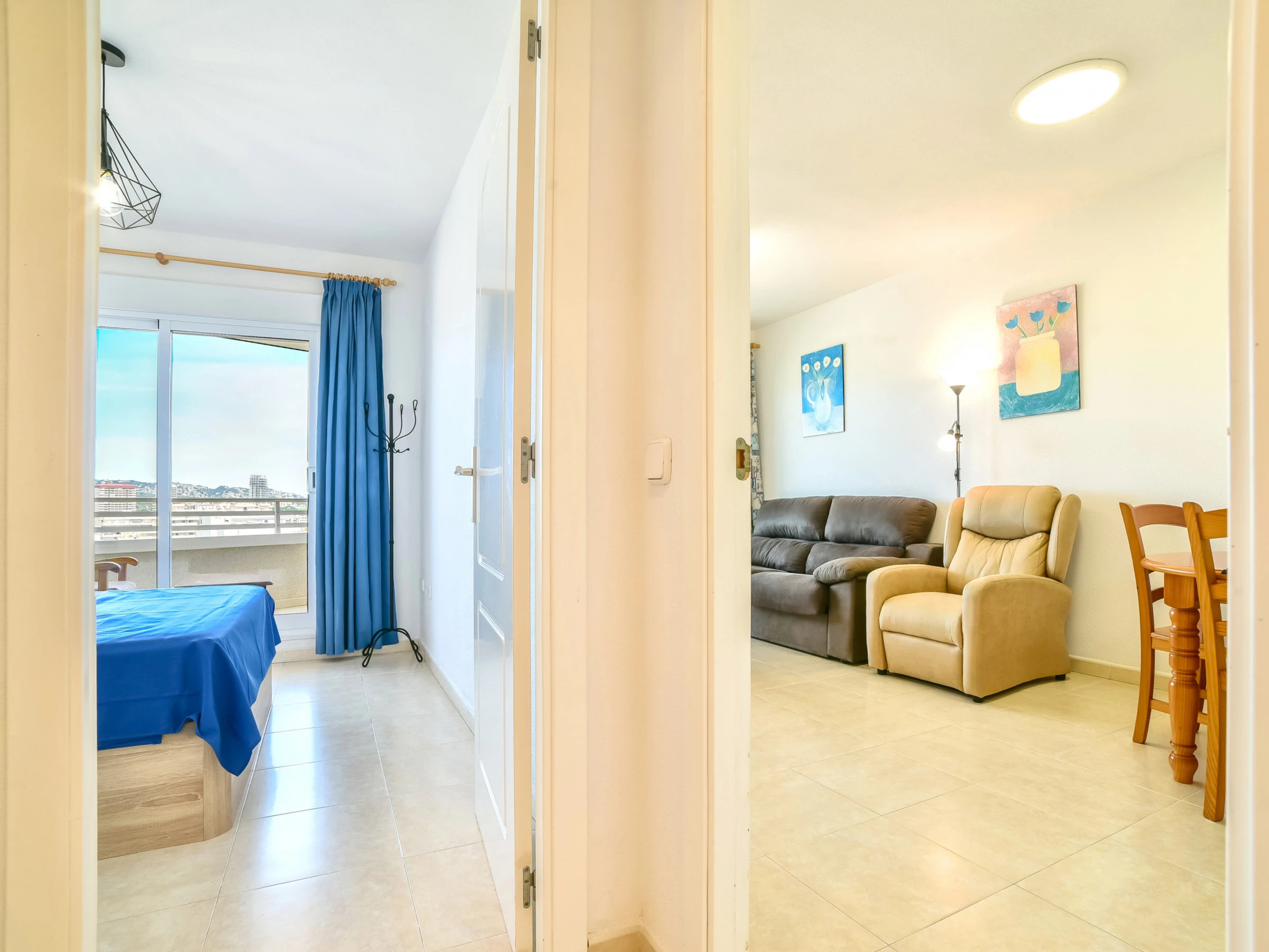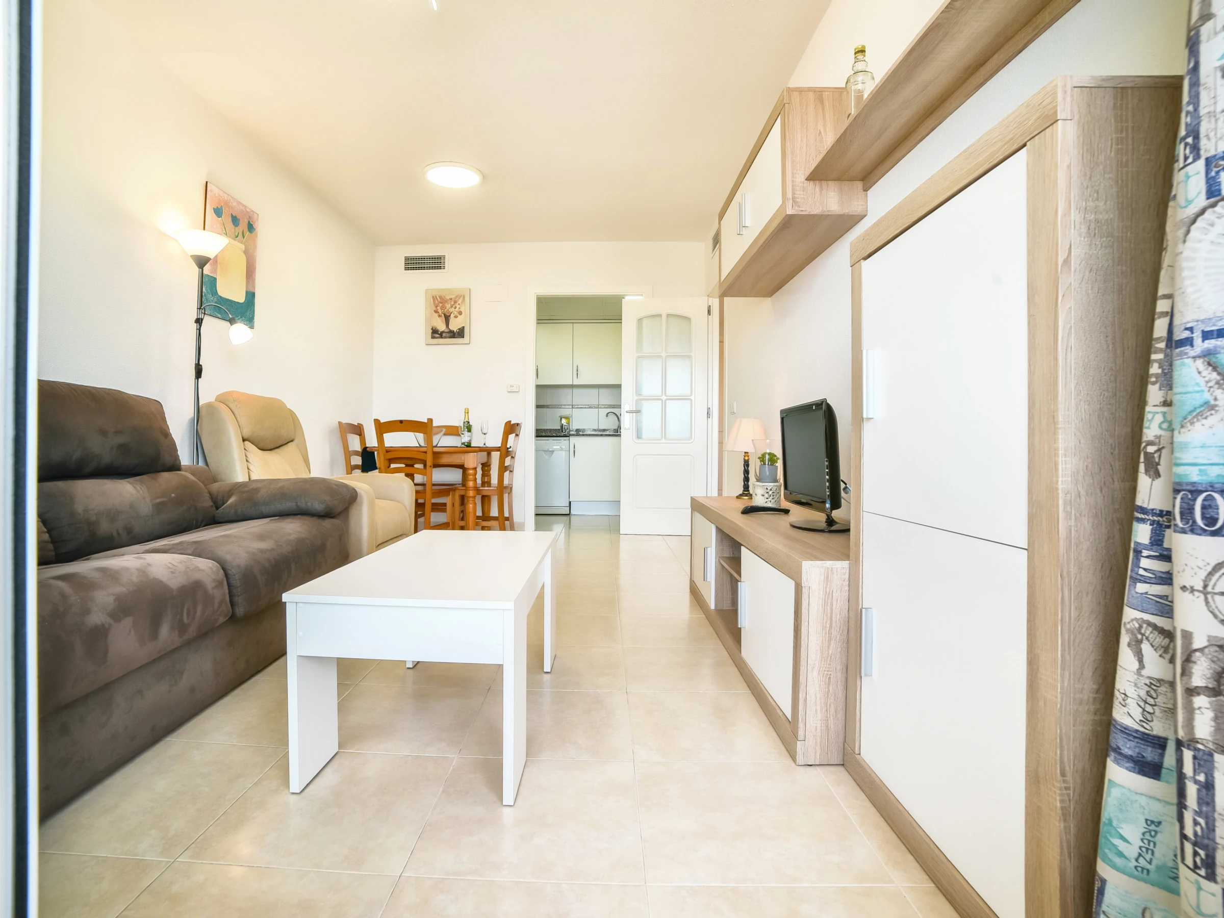 El apartamento dispone de una habitación con dos camas: una cama doble principal y un sofá-cama, permitiendo alojar cómodamente hasta 4 personas. La distribución incluye un baño completo con bañera, ideal para relajarse después de un día de playa.