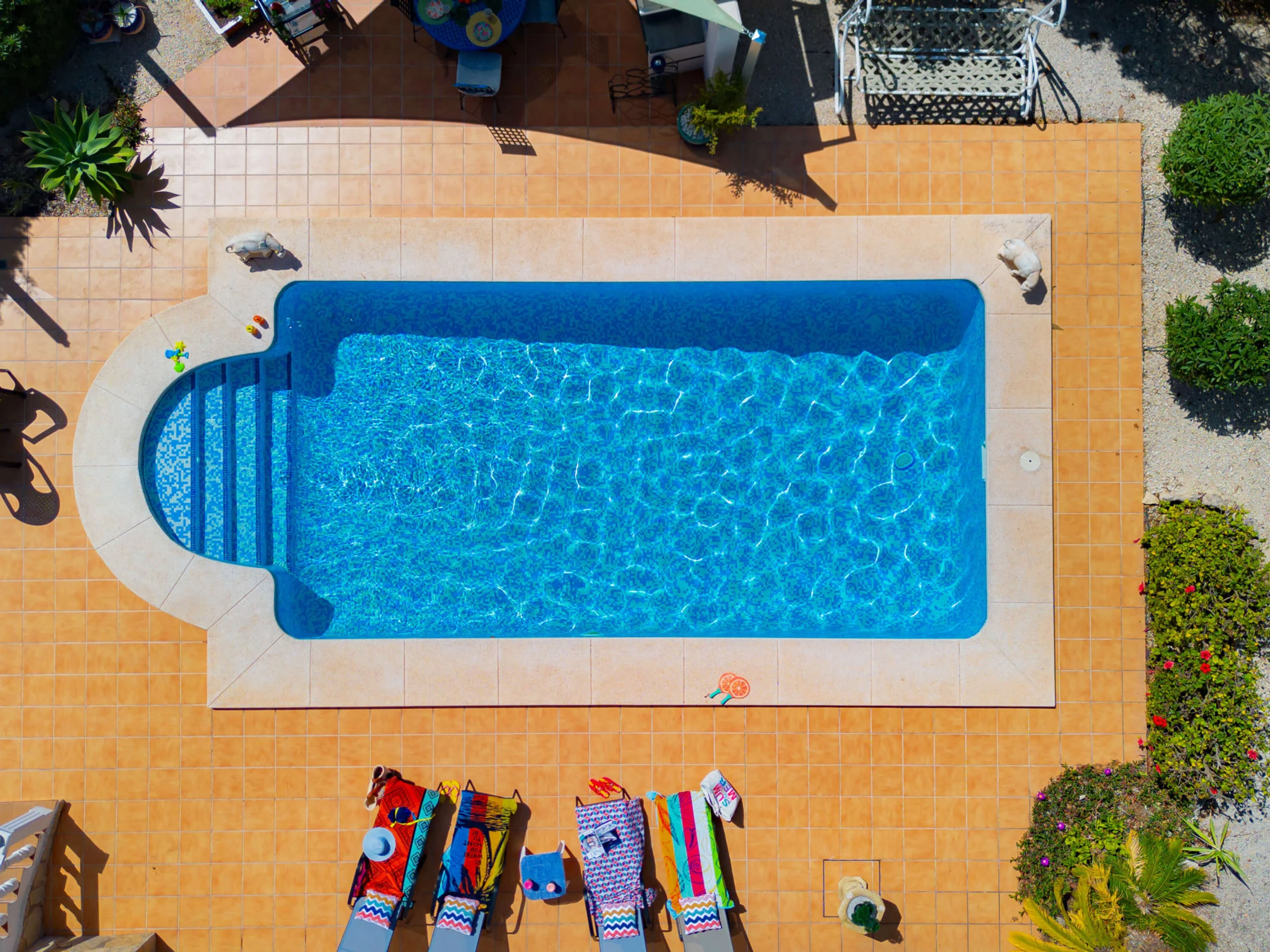 Sumérgete en tu propio paraíso privado en la amplia parcela con una piscina rectangular de 8x4 m, escaleras romanas y una refrescante ducha al aire libre. Disfruta de comidas al aire libre con la barbacoa portátil, mientras la parcela totalmente cerrada garantiza tu privacidad. Además, cuentas con una conveniente plaza de aparcamiento.