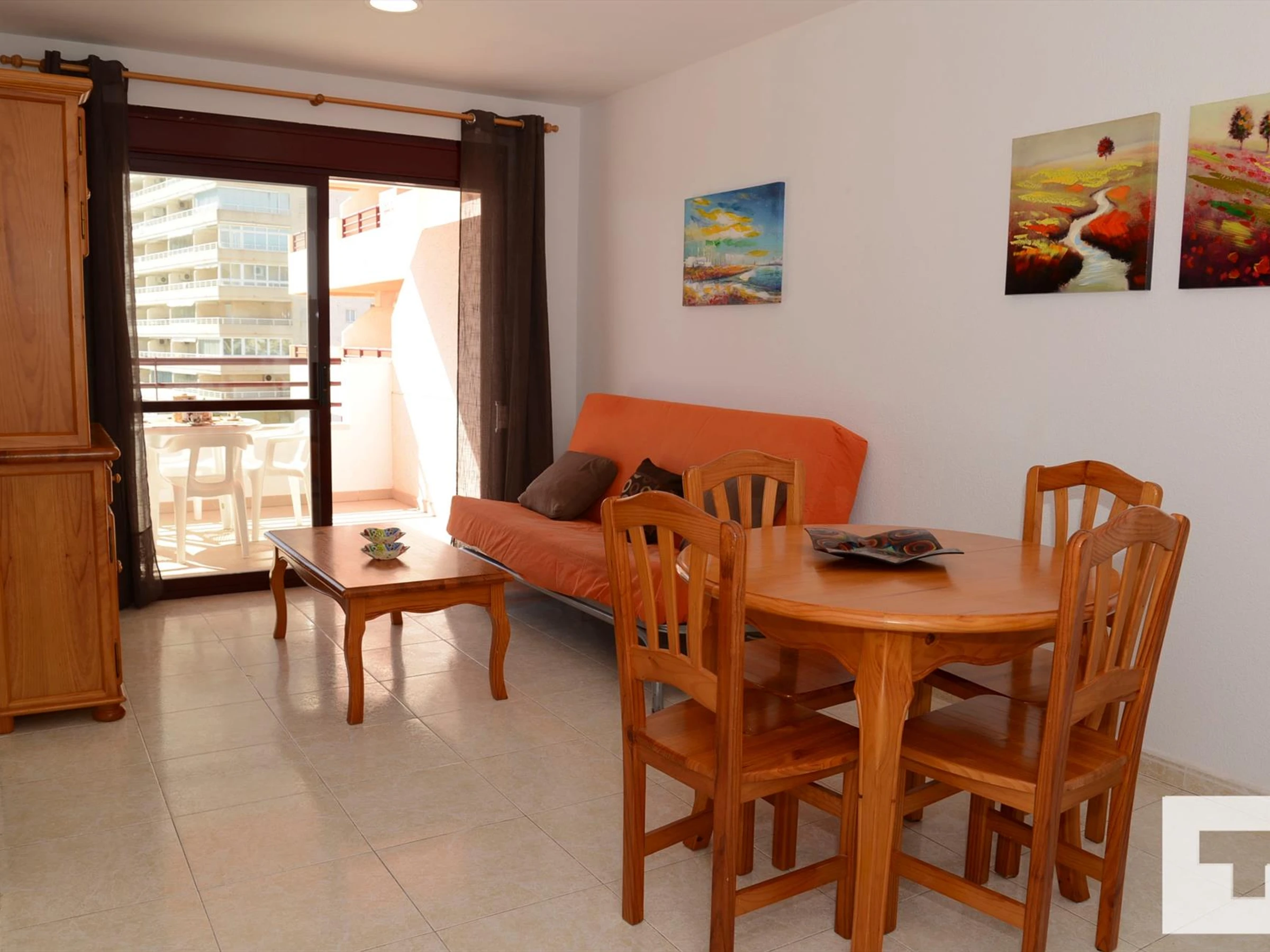 📺 Luminoso salón-comedor con TV y acceso a la terraza amueblada.