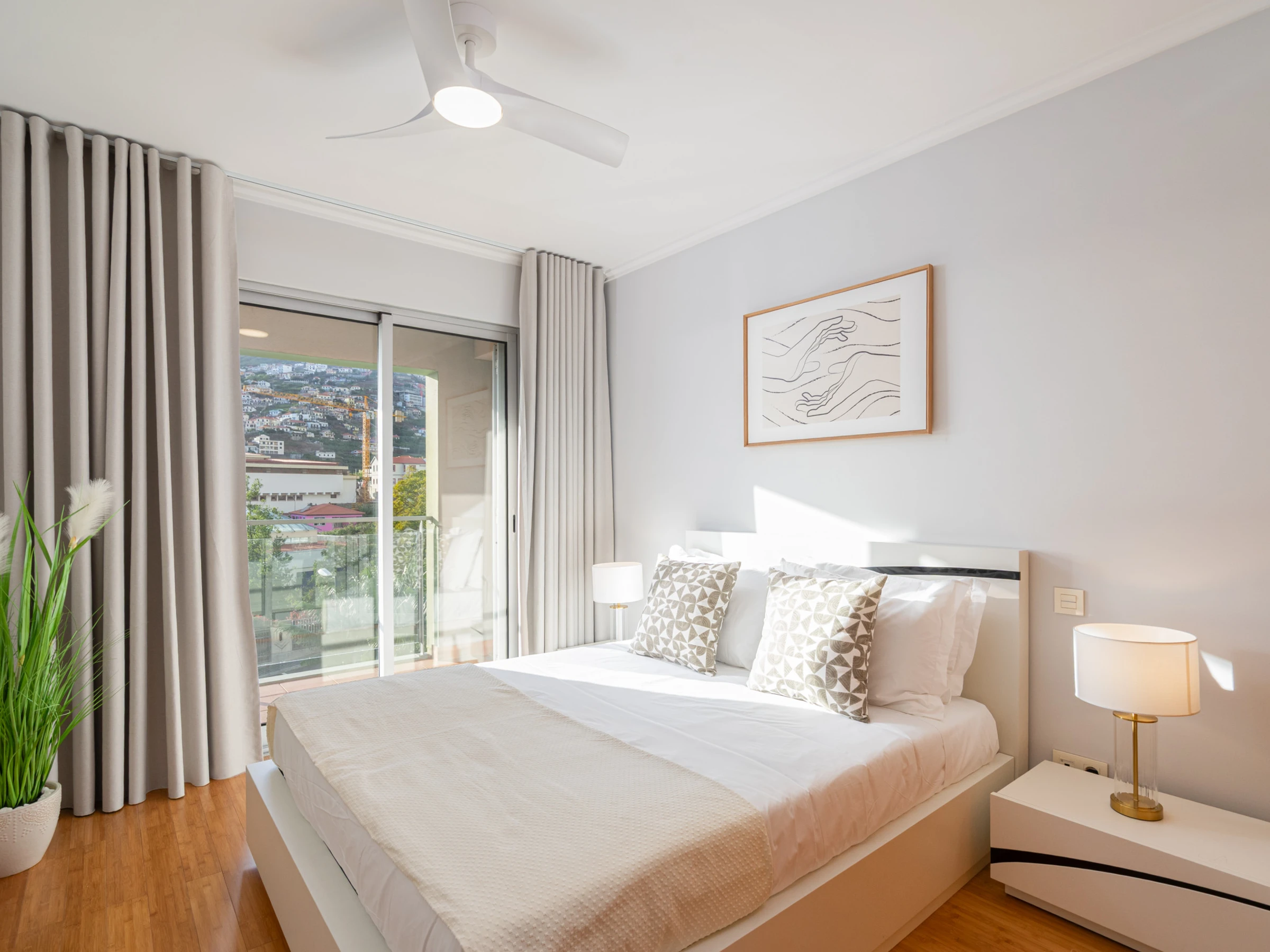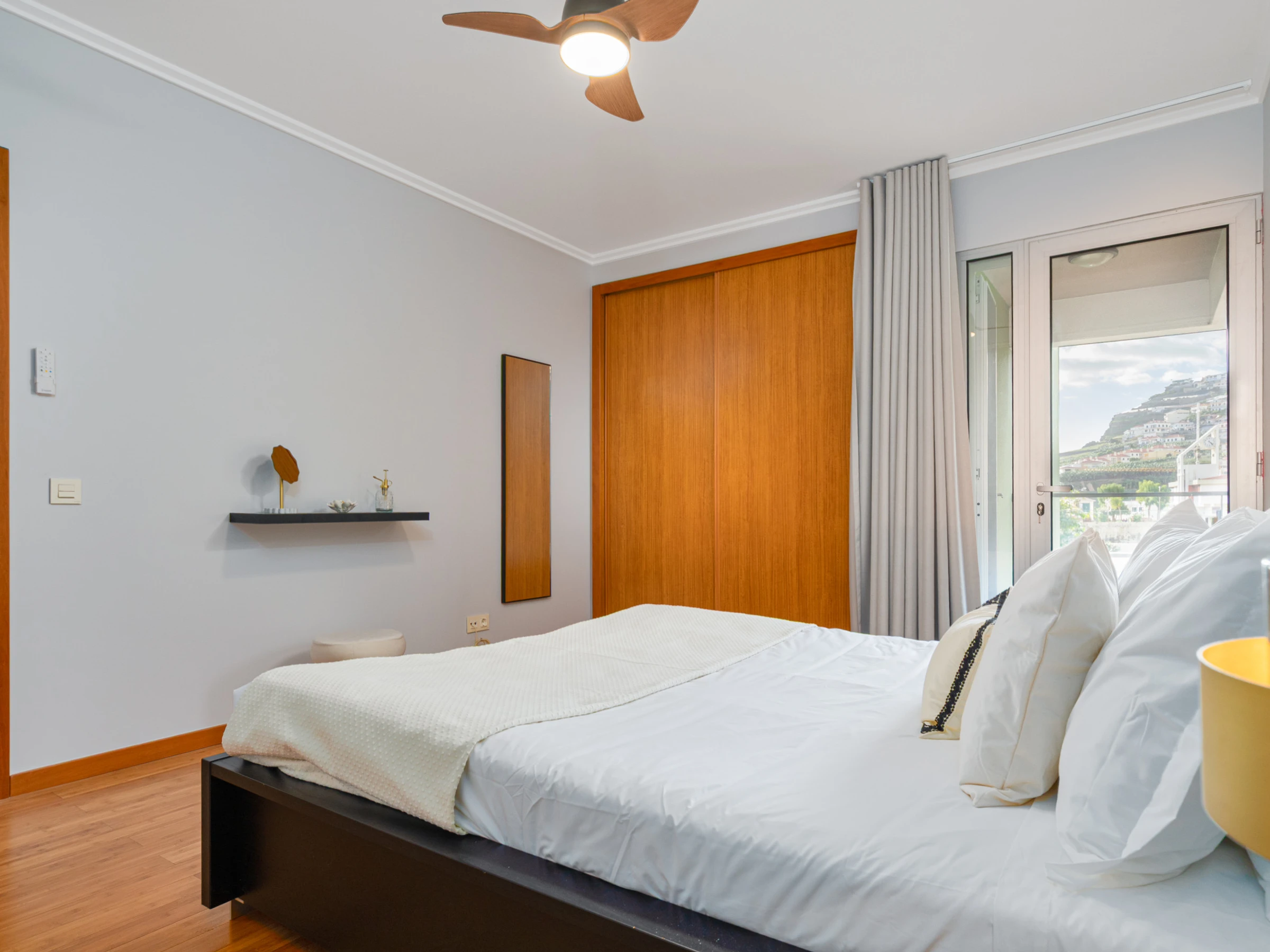 La habitación principal presenta una decoración elegante, una cómoda cama king size y un baño privado con bañera, ideal para quienes valoran la privacidad y el bienestar, contando además con acceso a un pequeño balcón. La segunda habitación, bañada por luz natural, ofrece una cama de matrimonio y un encantador balcón con vista sobre la ciudad de Câmara de Lobos, perfecta para apreciar el ambiente del pueblo. La tercera habitación, decorada en tonos amarillos, dispone de dos camas individuales, complementadas por una mesa y silla, creando un espacio acogedor para la lectura o momentos de tranquilidad.