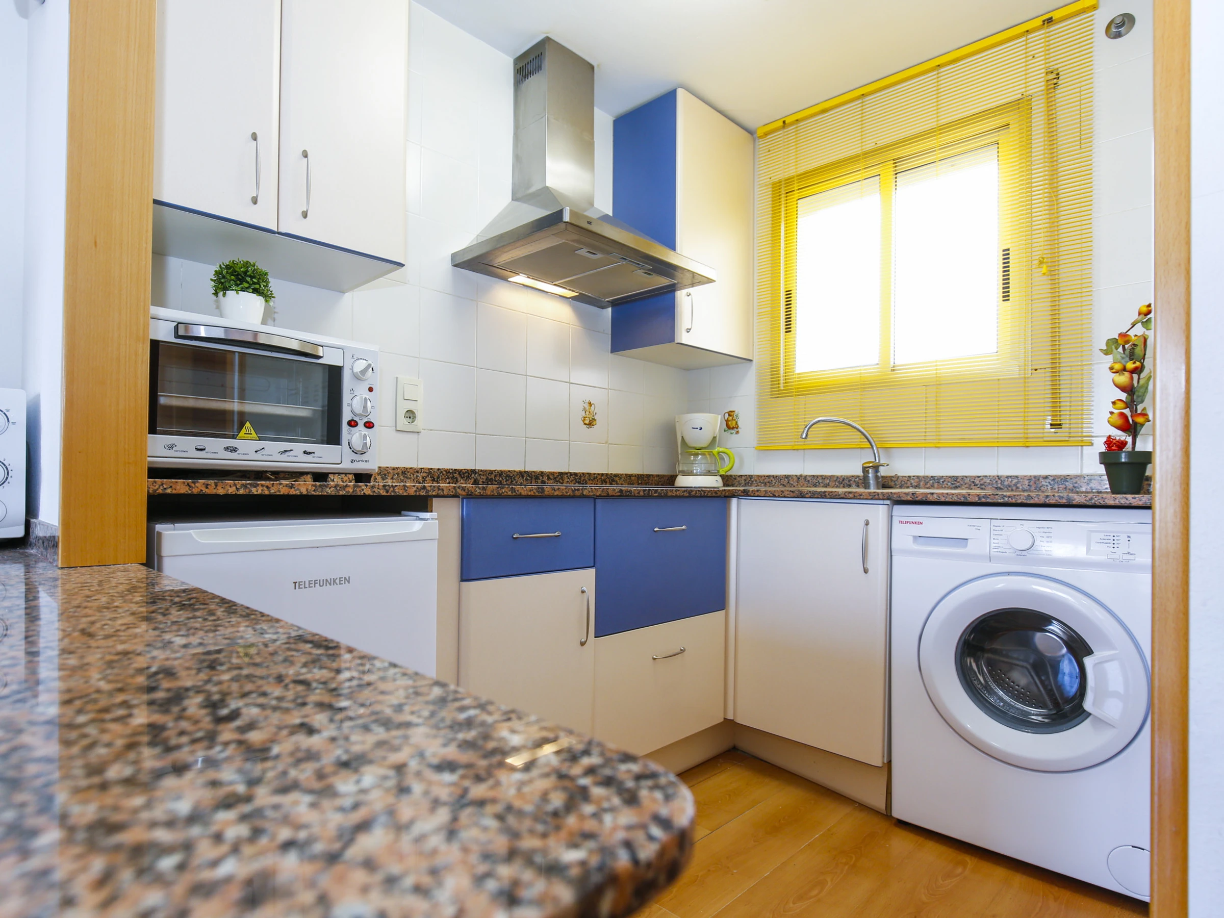 Cocina abierta y equipada con los utensilios y electrodomésticos necesarios para tu estancia.