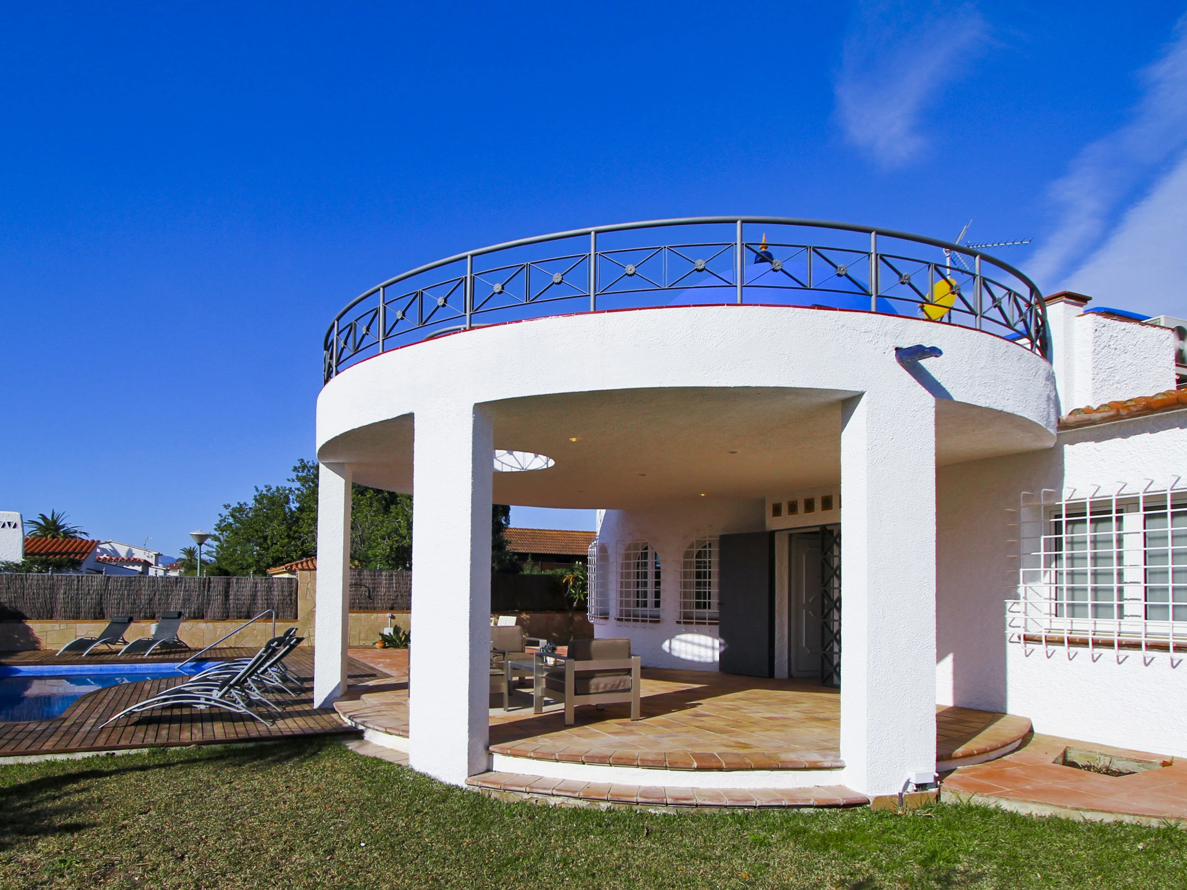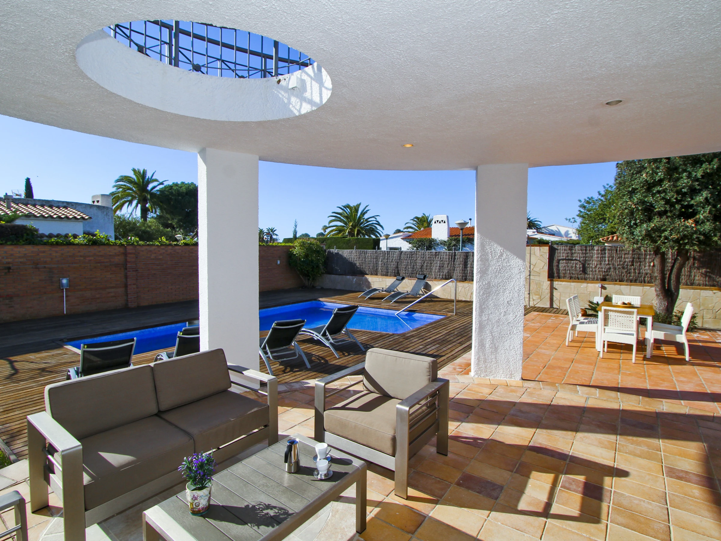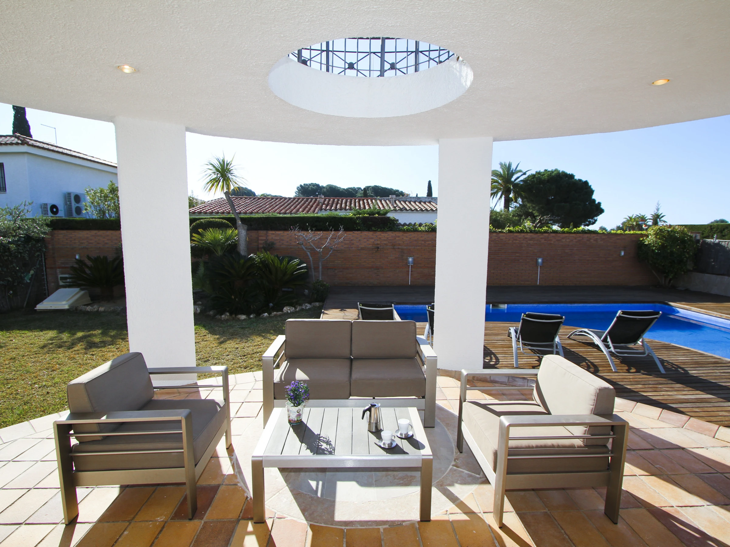 La villa está situada en una finca de aproximadamente 500m², y cuenta con una piscina privada, zona de hamacas, césped, terraza chill out y comedor exterior con barbacoa. Disfruta del buen clima mediterráneo y relájate en este entorno tranquilo y encantador.