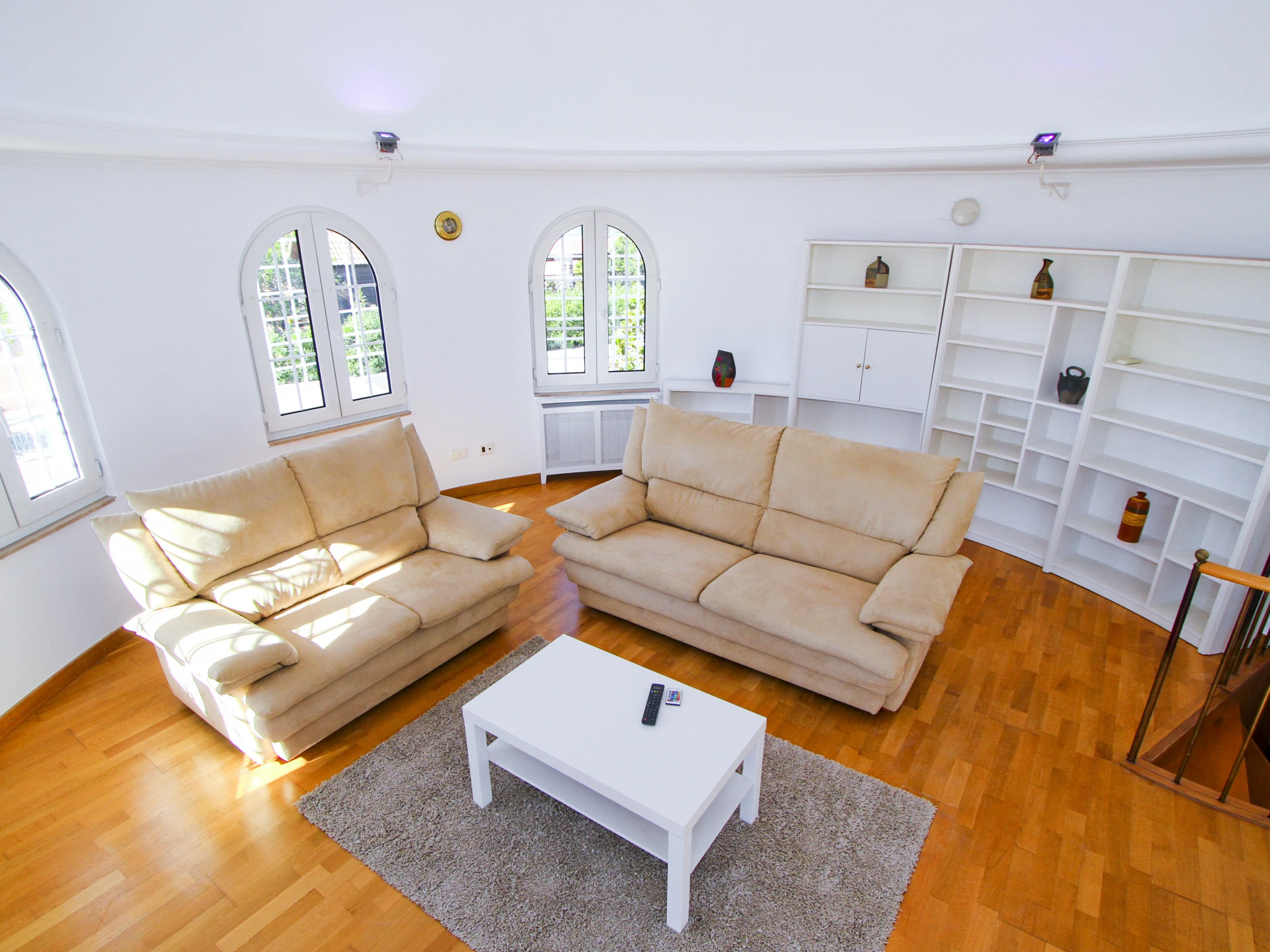 En la misma planta, encontrará un dormitorio doble con camas gemelas, un dormitorio familiar con una cama de matrimonio y una cama individual, y un cuarto de baño con ducha. La cúpula, ubicada en la planta superior, es un bonito salón con TV y acceso al solárium. Desde el salón, a través de unas escaleras, llega a otro acogedor dormitorio tipo suite, con techo abuhardillado de madera y cuarto de baño con ducha.