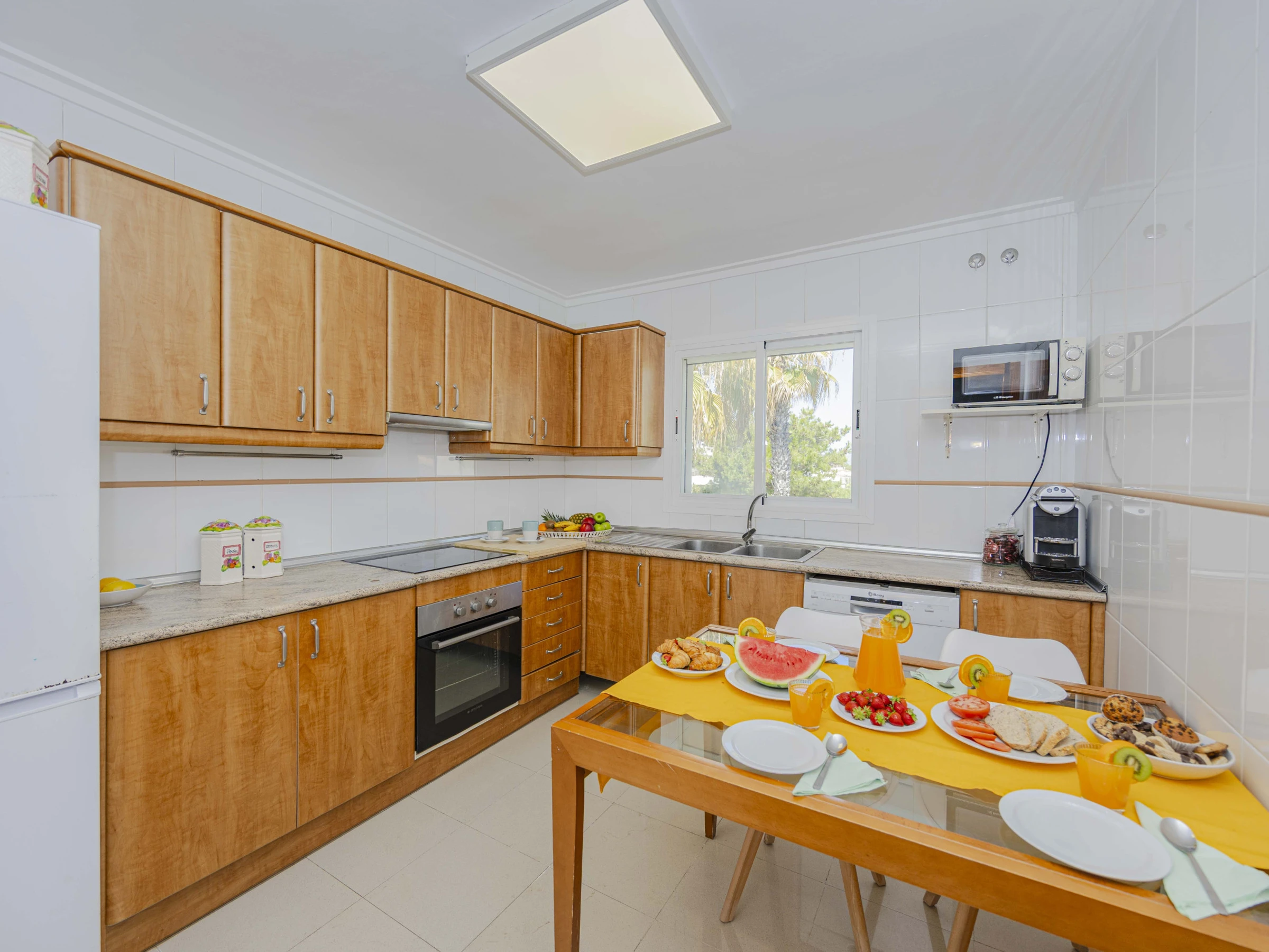 – Cocina independiente totalmente equipada con horno, vitrocerámica, microondas, nevera, lavavajillas, cafetera y utensilios de cocina.