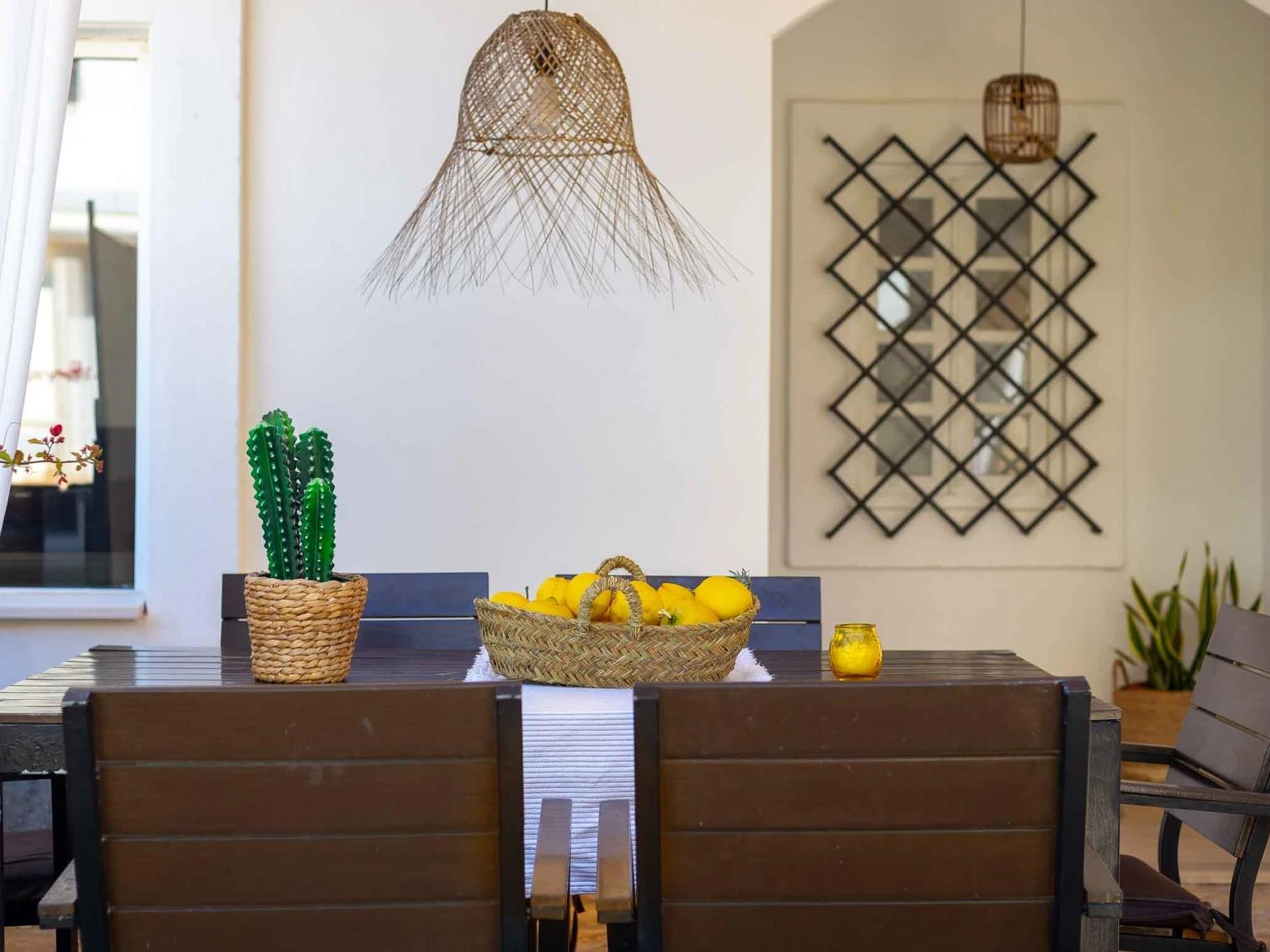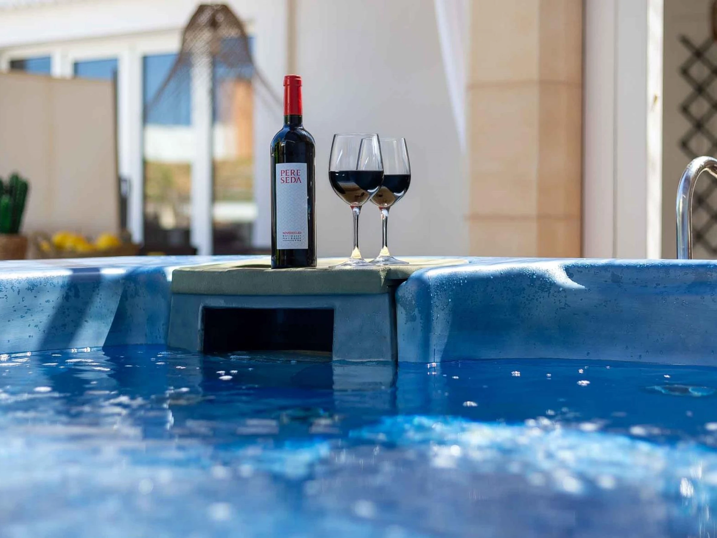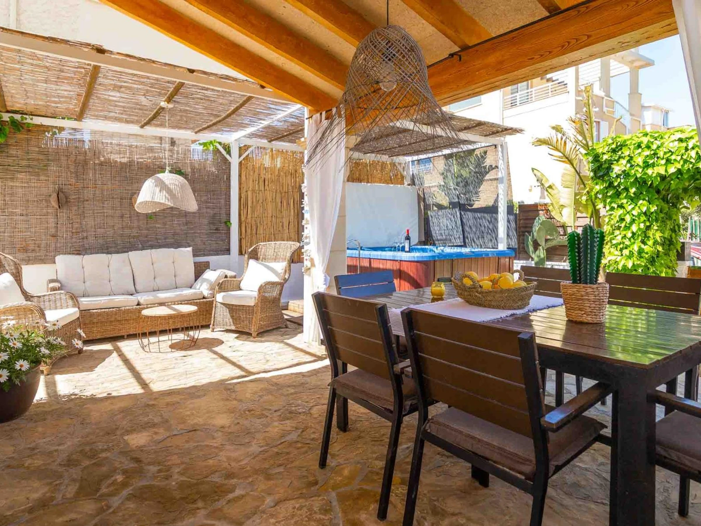 El espacio exterior es uno de los grandes atractivos de esta propiedad. Dispone de una terraza cubierta perfecta para comidas al aire libre, una zona solárium con tumbonas y muebles de exterior, y un relajante jacuzzi climatizado disponible todo el año, ideal tanto para refrescarse en verano como para relajarse en los días más frescos.