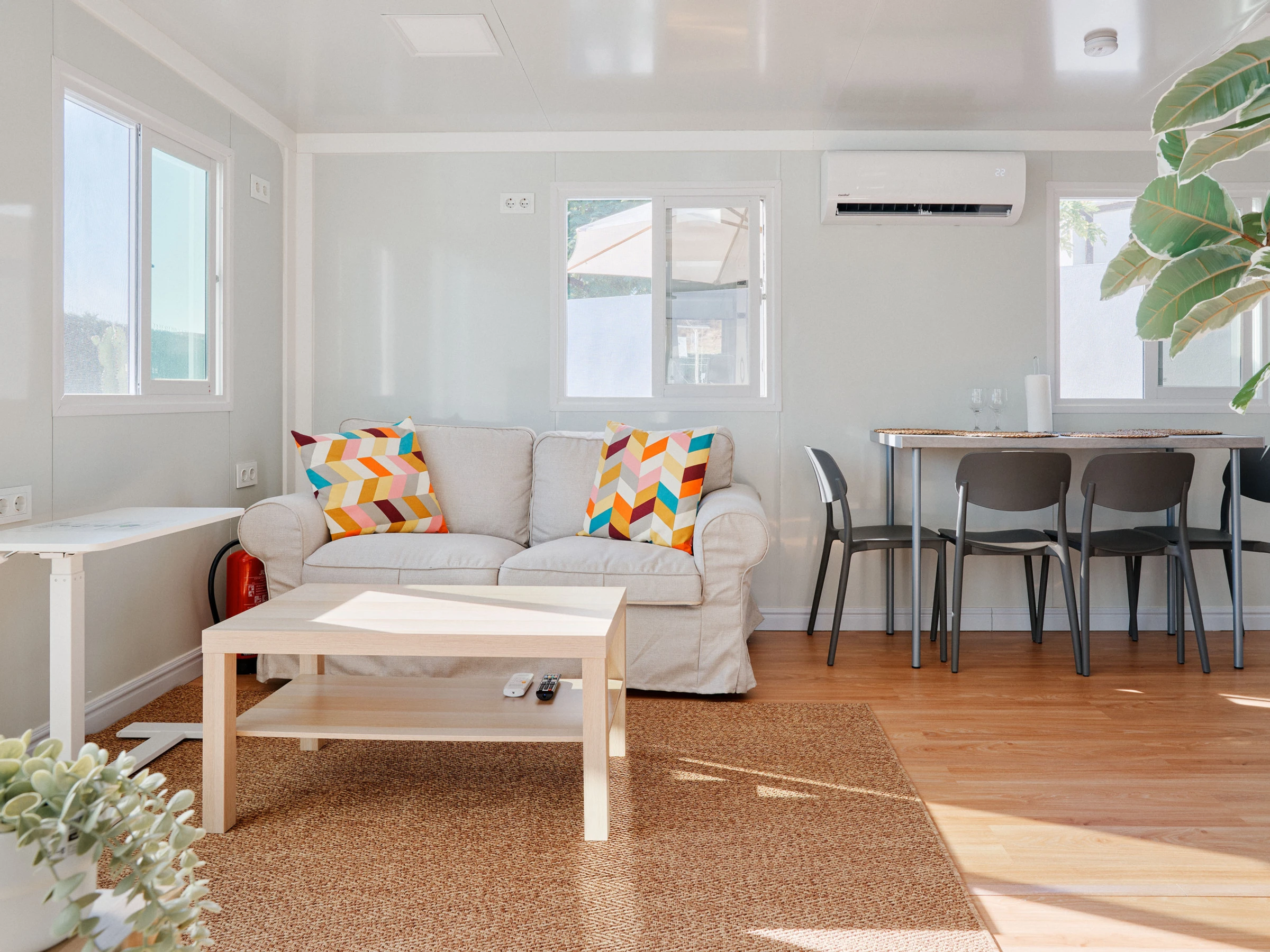 El interior está diseñado para ofrecer comodidad y estilo. Un amplio espacio de salón-comedor con cocina integrada proporciona todo lo necesario para una estancia agradable como una cocina equipada con microondas, cafetera L’Or, utensilios y vajilla completa. En la zona de estar, ofrecemos una televisión de pantalla plana con canales satélite en alemán, inglés y francés, así como Wifi gratuito y aire acondicionado en el salón.