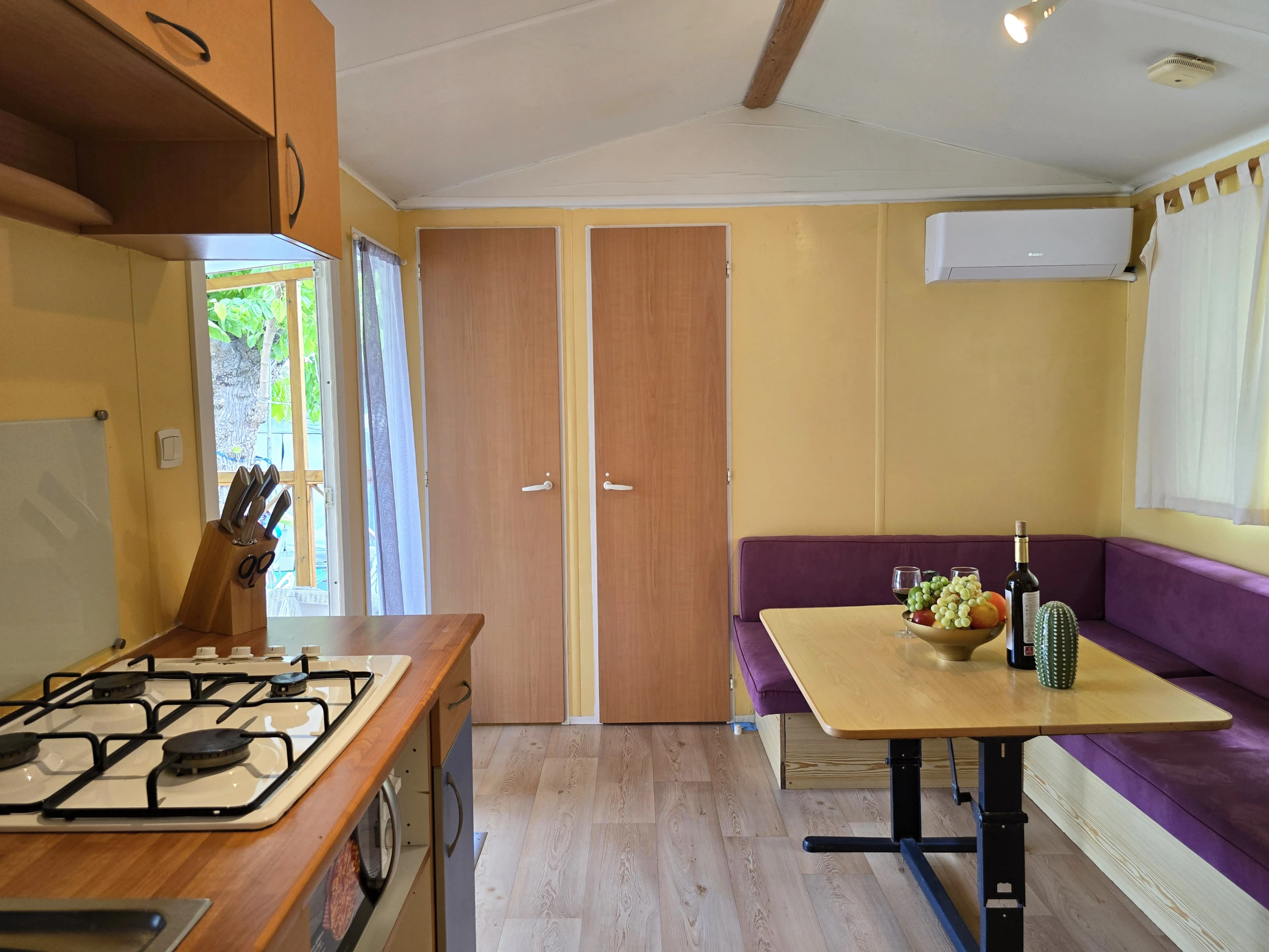 El bungaló dispone de 2 habitaciones, una con cama doble y la otra con dos camas individuales. Dispone de un baño con ducha y de un aseo. En el comedor hay una cocina de gas, una nevera con congelador, un microondas, una cafetera Dolce Gusto, un hervidor y una tostadora además de cubertería y utensilios de cocina. En el salón hay un aparato de aire acondicionado y una mesa para cuatro personas donde se puede ver la TV.