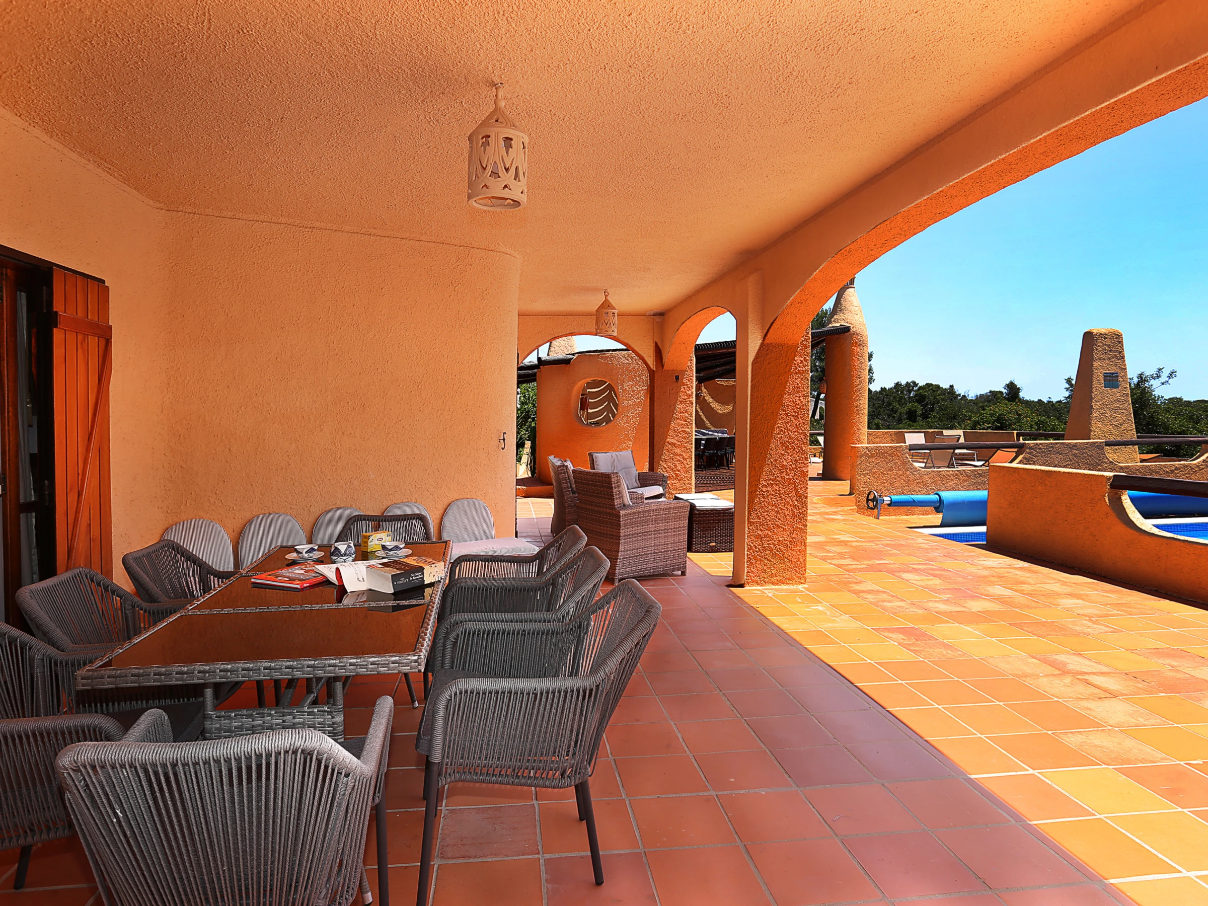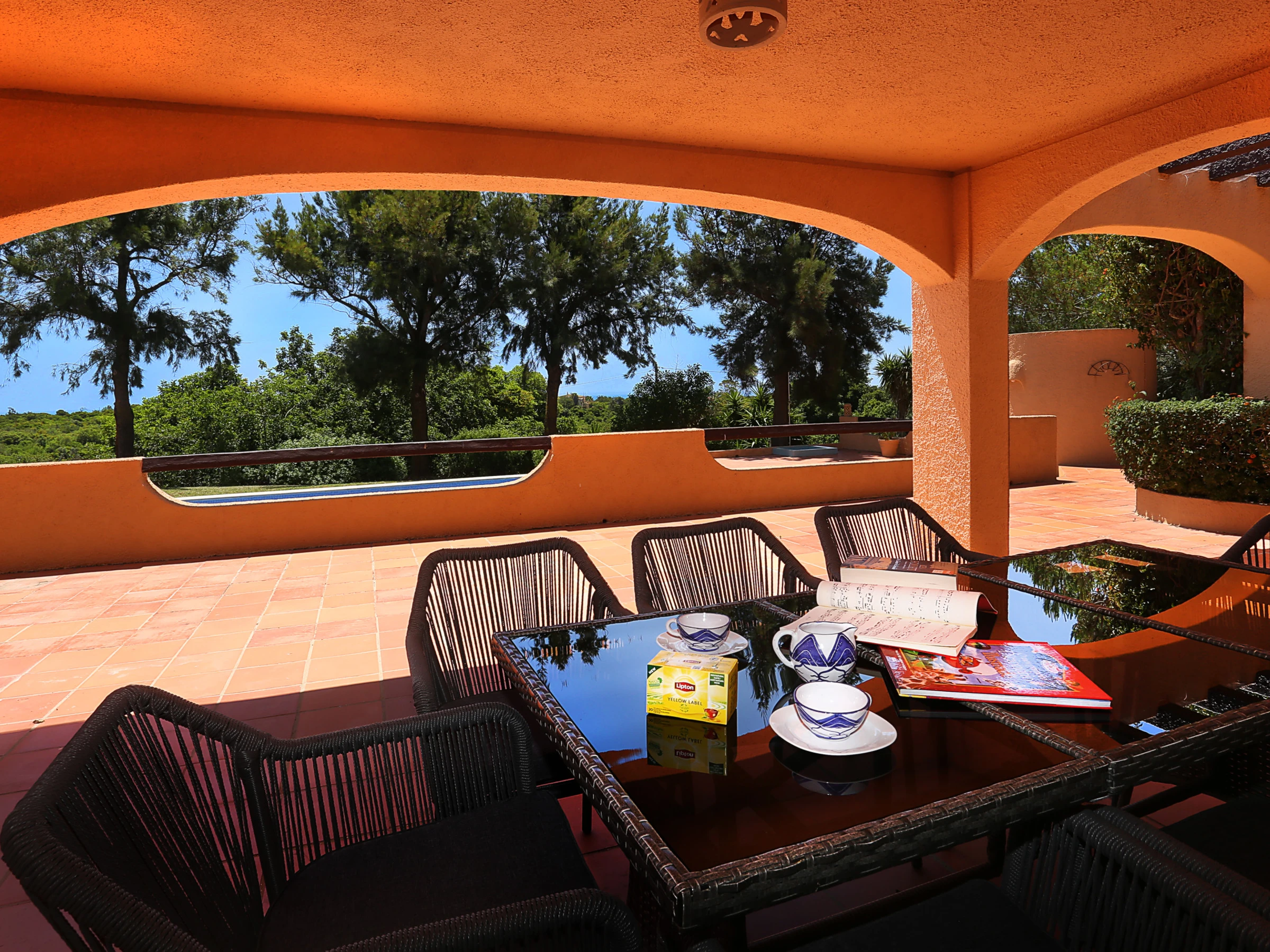La amplia zona al aire libre ofrece grandes terrazas (parcialmente cubiertas) con varias zonas de estar (con sombra), un rincón de barbacoa con mesa de comedor, piscina (calentable con coste adicional) con tumbonas y una hermosa vista al mar.
