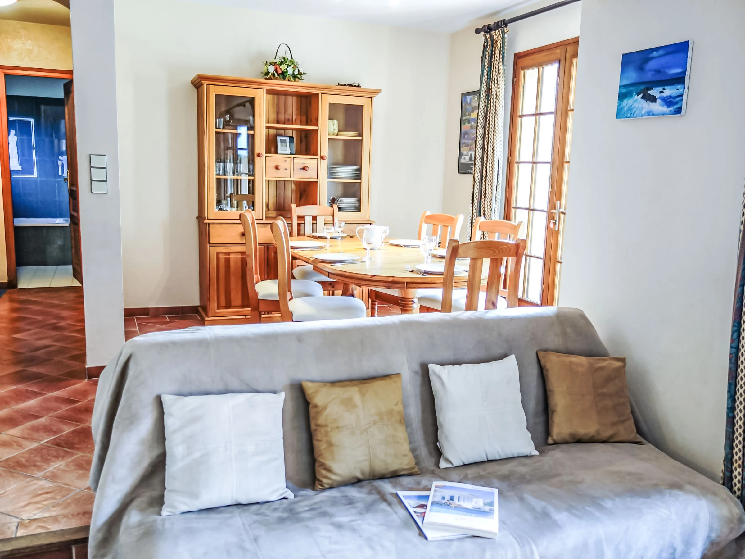 Casa adosada 4 estancias 110 m2 en 2 plantas, orientación sur. Con mobiliario funcional y bonito: salón-comedor con TV (pantalla plana). Salida a la terraza, a la piscina. 1 dorm. con 1 cama de matrimonio (160 cm, 200 cm de longitud). Cocina (4 fogones, horno, lavavajillas, tostadora, hervidor de agua eléctrico, microondas, congelador, cafetera eléctrica, Cápsulas de café (nespresso) extra). Baño, WC separado. Planta superior: 1 dorm. con 1 cama de matrimonio (140 cm, 190 cm de longitud). 1 dorm. con 2 x 2 literas (80 cm, 190 cm de longitud). Ducha/WC. Calefacción eléctrica. Terraza 20 m2, cubierta, orientación sur. Muebles de terraza, tumbonas (4). El alojamiento dispone de: lavadora, secadora, plancha. Internet (Wifi, extra). Plaza de aparcamiento (vallada). A tener en cuenta: permitido máximo 1 mascota / perro. Detector de humo. La barbacoa está situada en el patio trasero de la casa, cerca de la cocina. Vistas al mar desde el primer piso.
