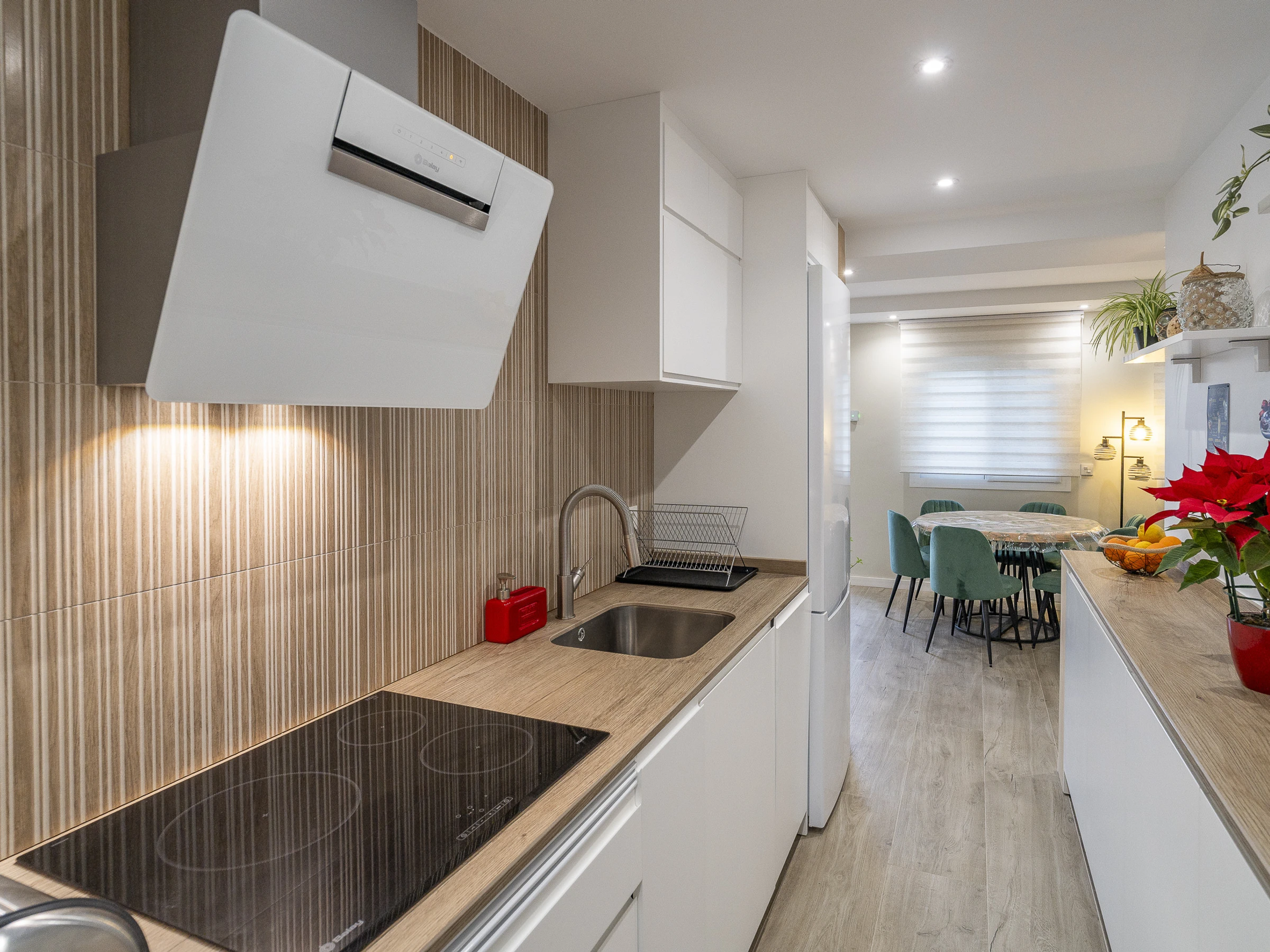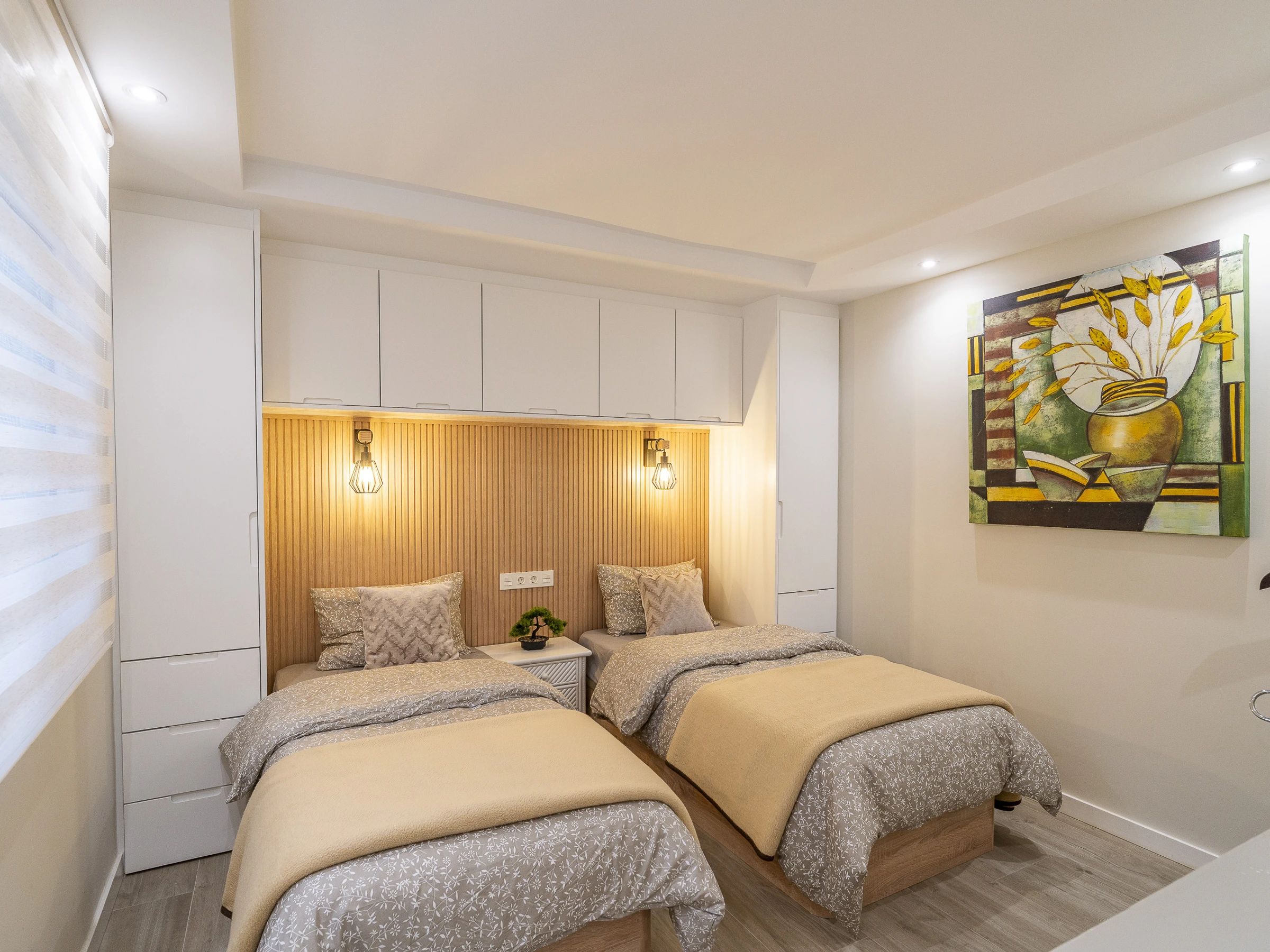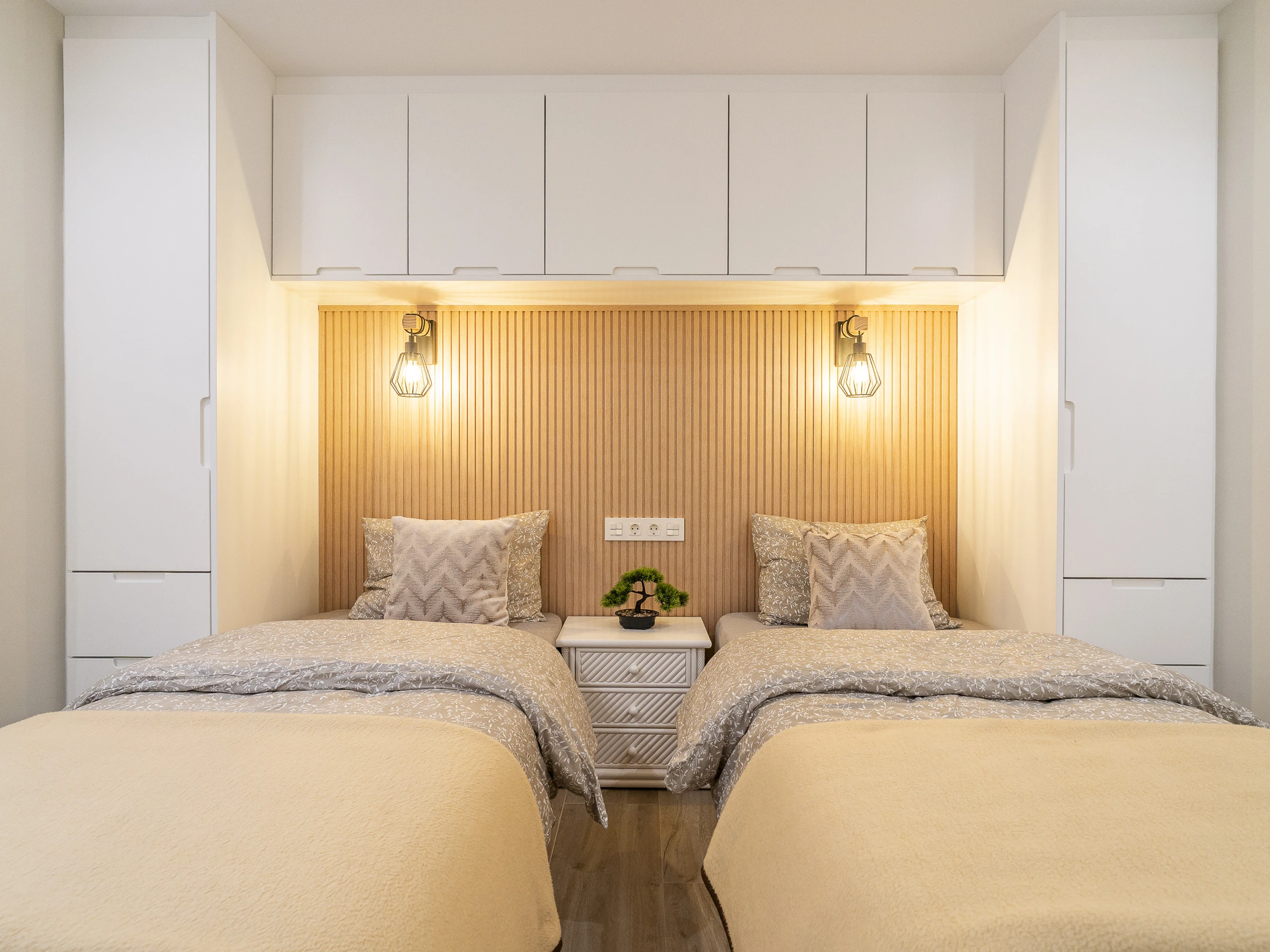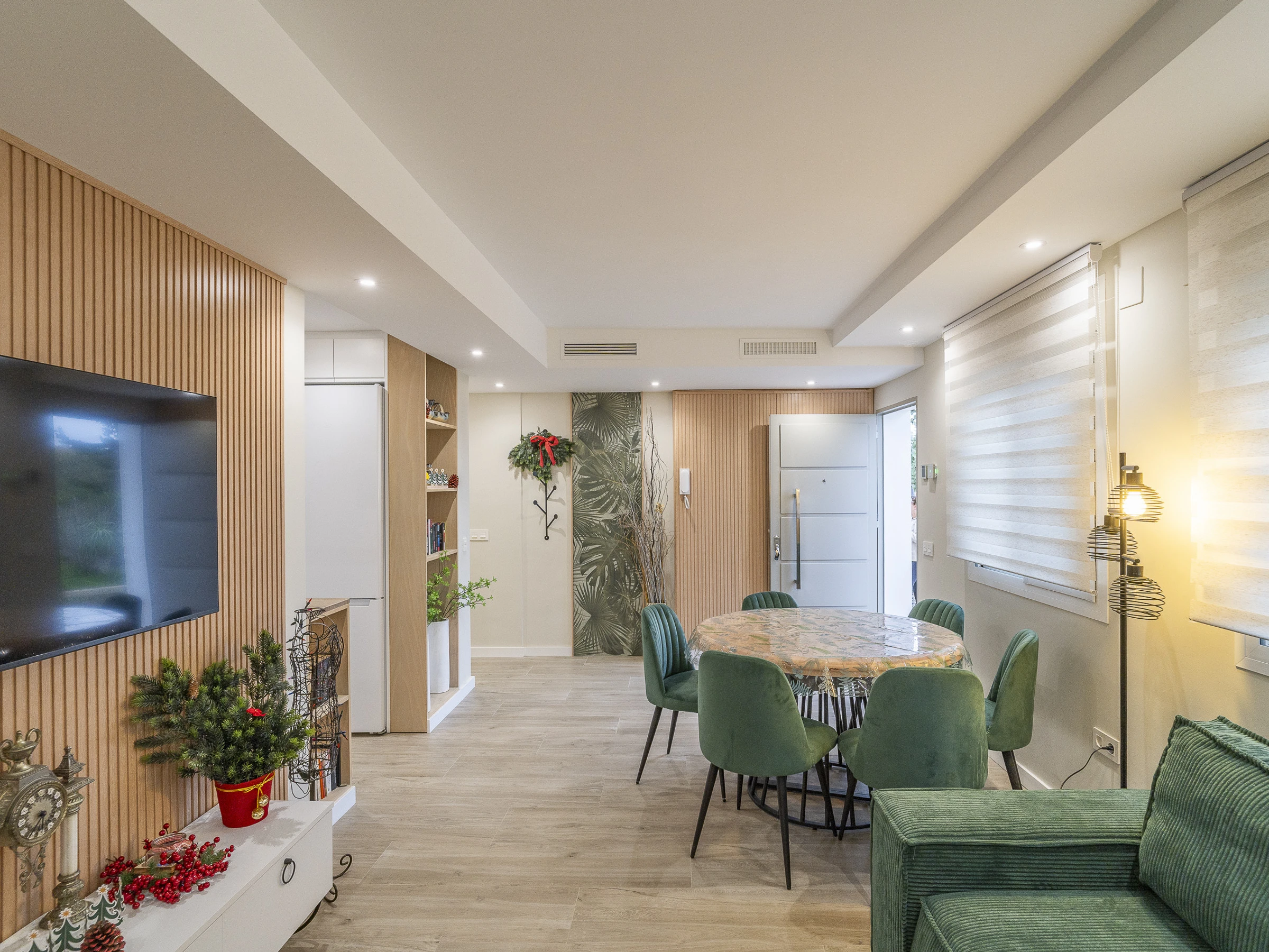 En el interior encontrarás un salón luminoso con Smart TV y sofá cama (2 plazas), además de aire acondicionado centralizado en toda la vivienda. Dispone de 2 dormitorios: uno con cama doble y otro con dos camas individuales, así como un baño interior con ducha. La cocina americana está equipada con inducción, lavavajillas, horno, microondas, cafetera de filtro y Dolce Gusto, tostadora, hervidor, exprimidor y todo el menaje necesario.