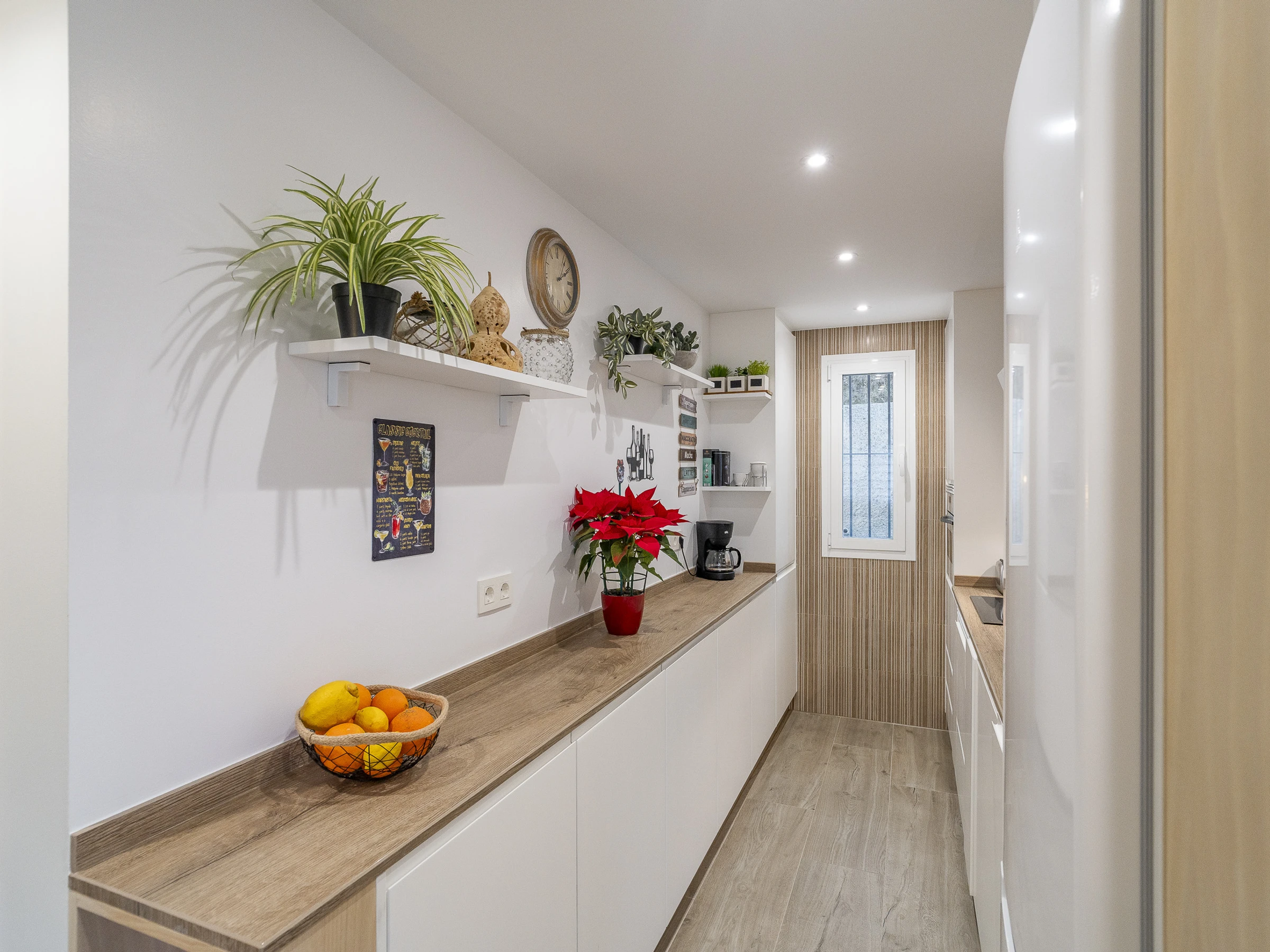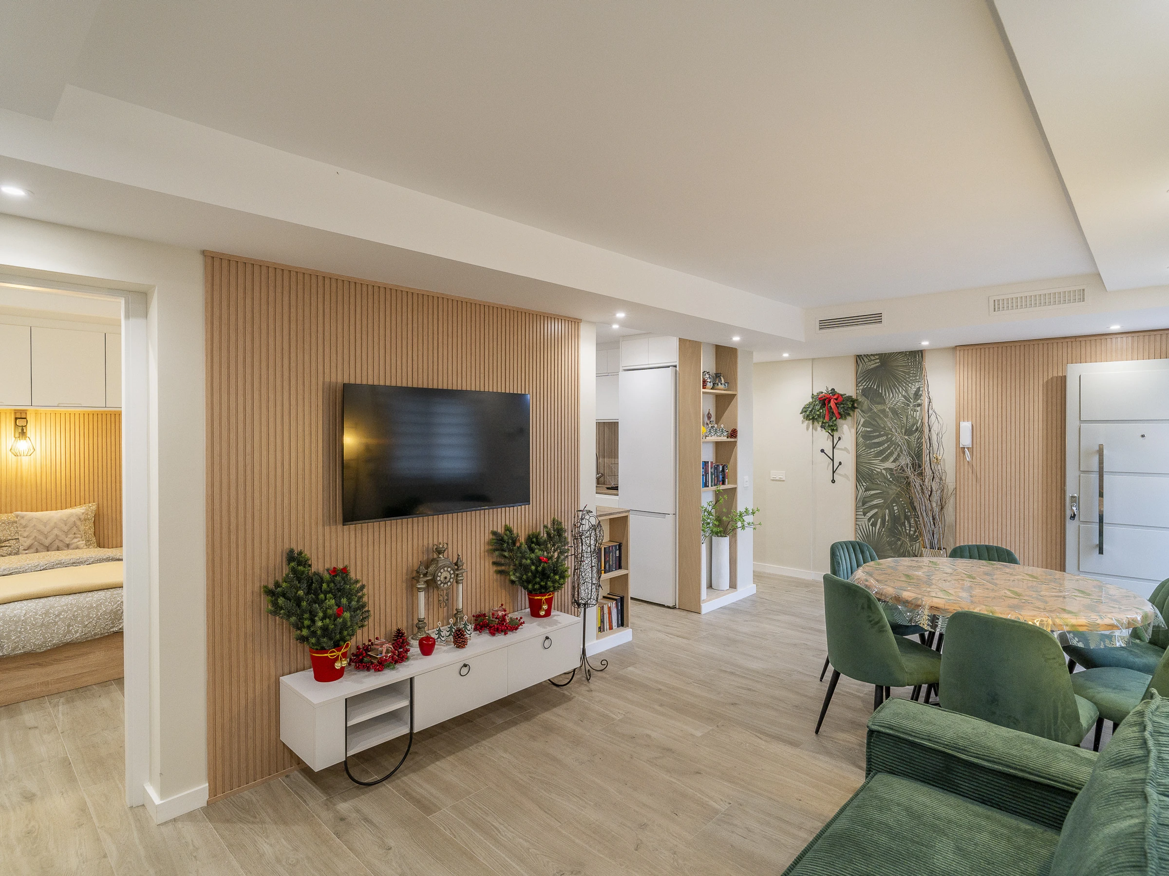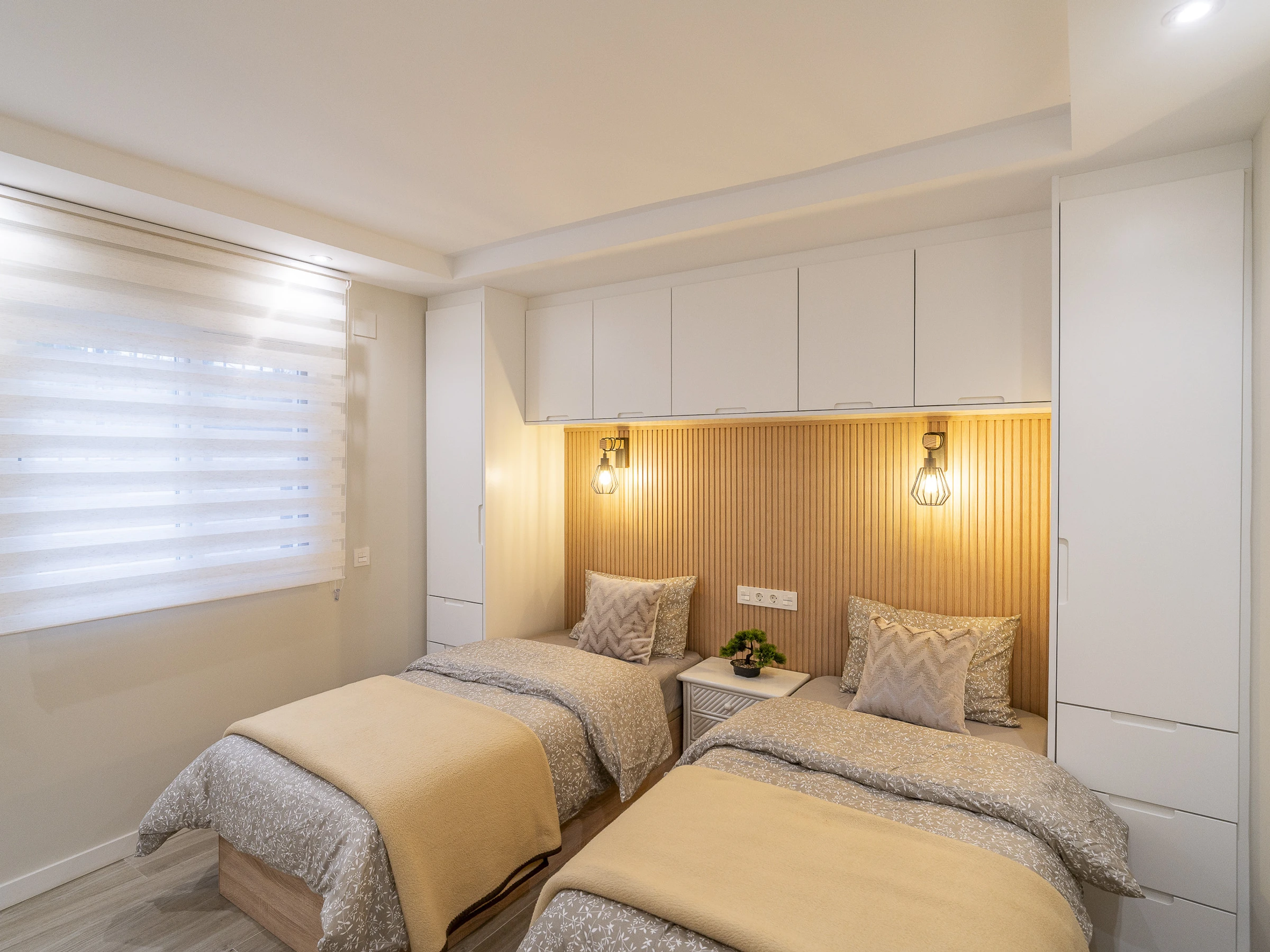 En el interior encontrarás un salón luminoso con Smart TV y sofá cama (2 plazas), además de aire acondicionado centralizado en toda la vivienda. Dispone de 2 dormitorios: uno con cama doble y otro con dos camas individuales, así como un baño interior con ducha. La cocina americana está equipada con inducción, lavavajillas, horno, microondas, cafetera de filtro y Dolce Gusto, tostadora, hervidor, exprimidor y todo el menaje necesario.