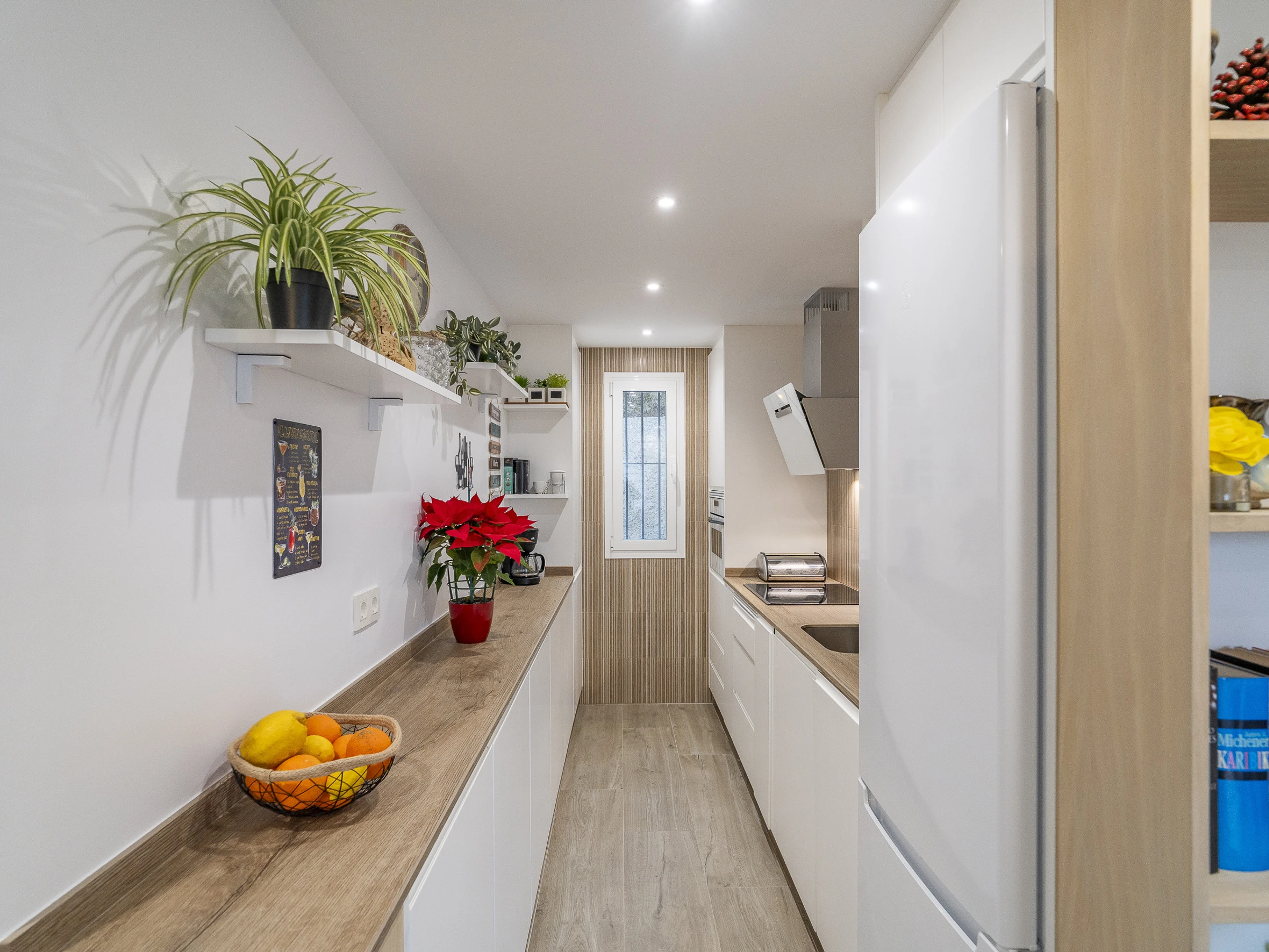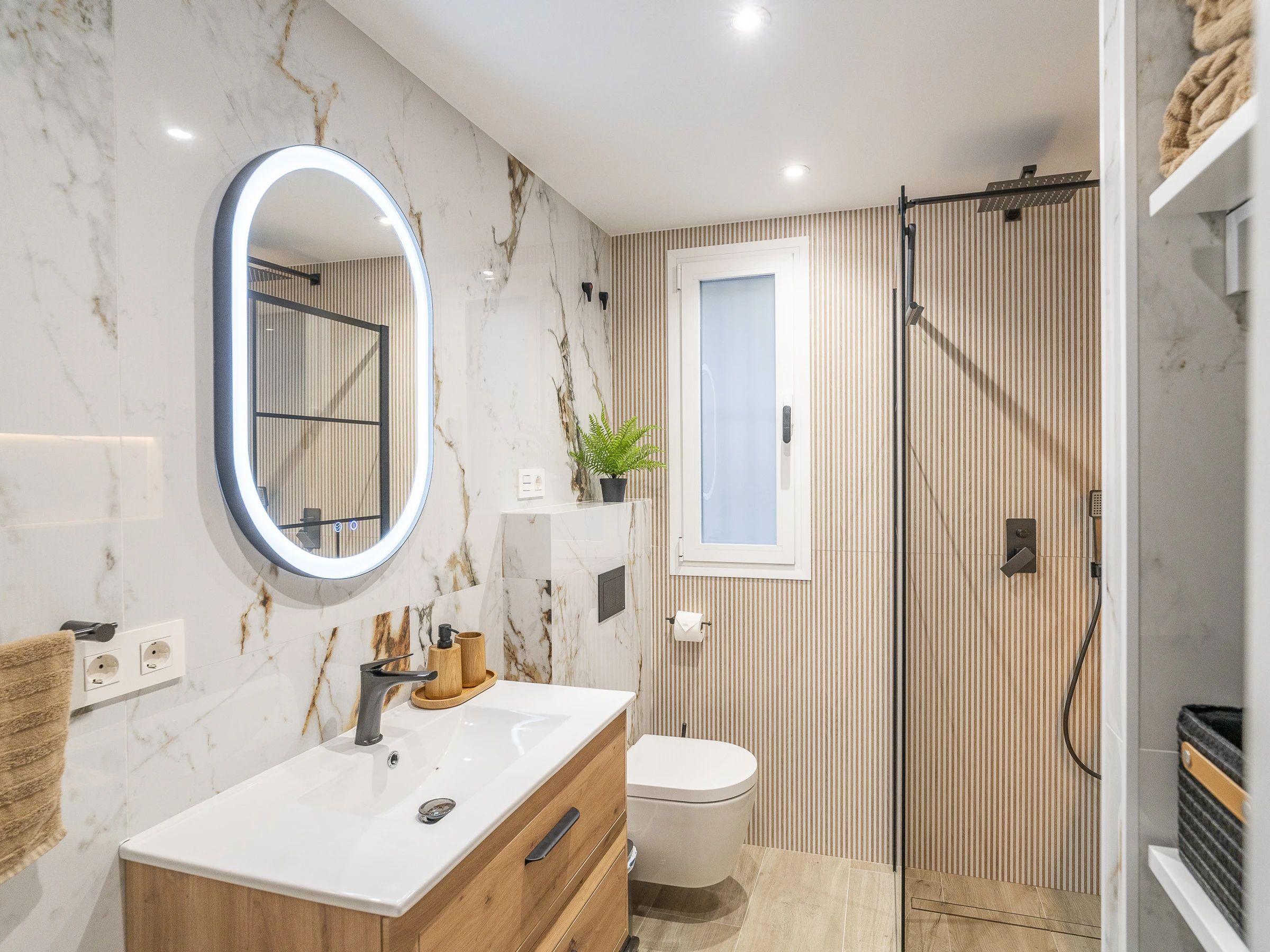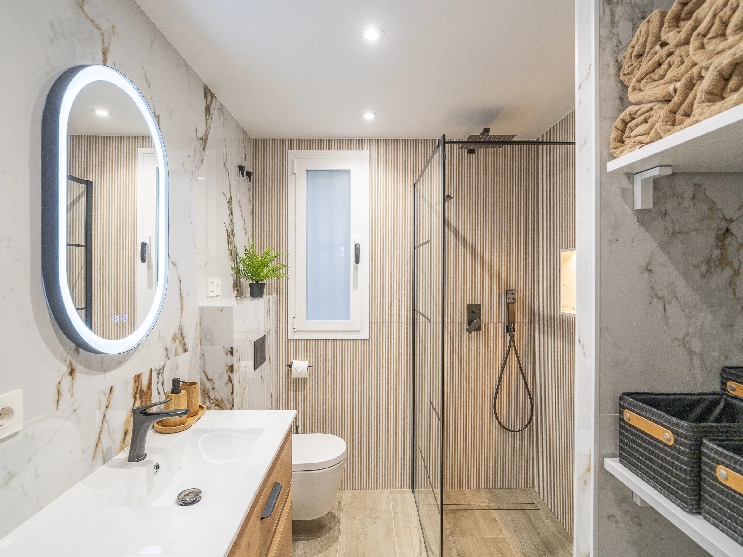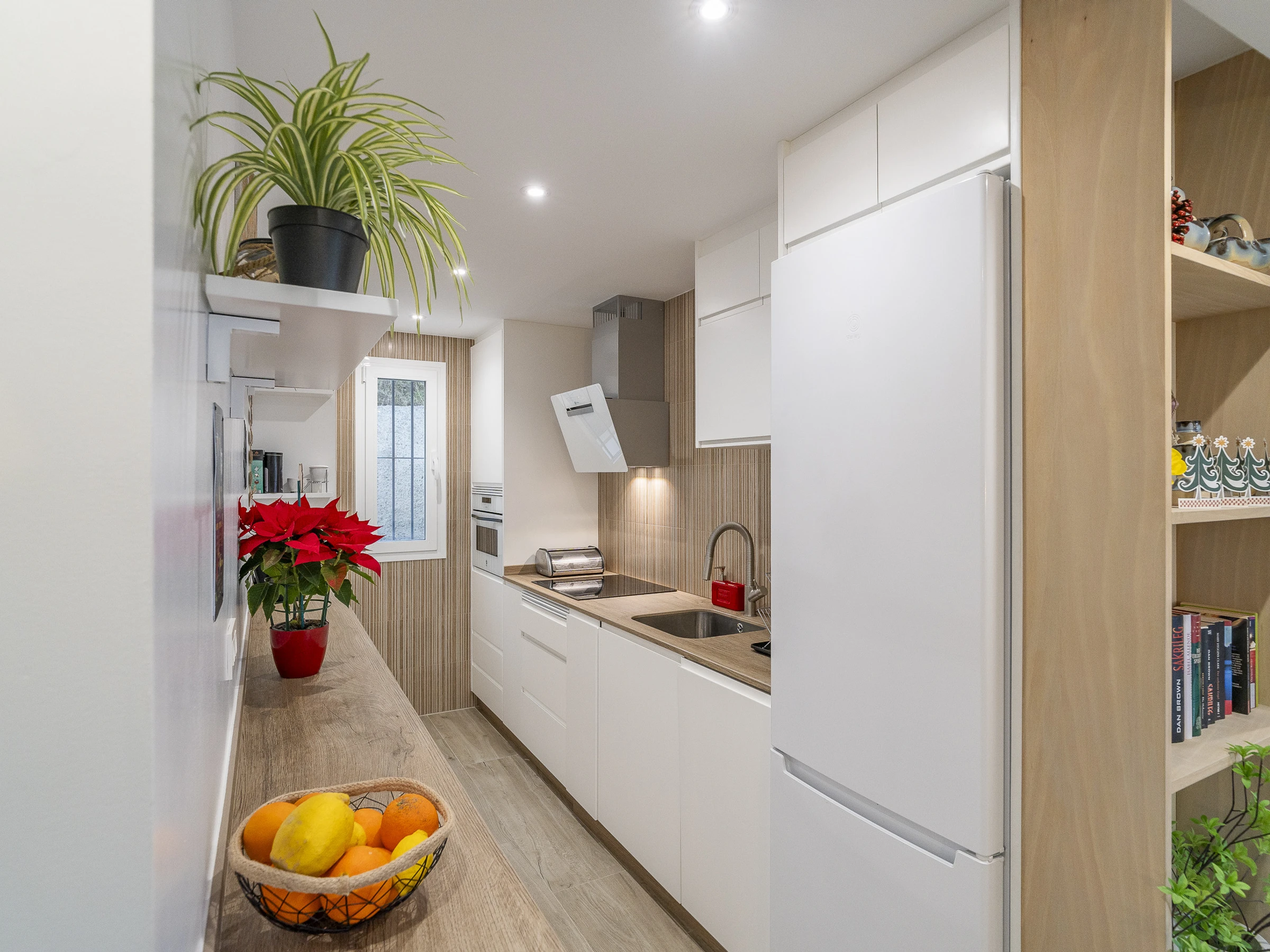 En el interior encontrarás un salón luminoso con Smart TV y sofá cama (2 plazas), además de aire acondicionado centralizado en toda la vivienda. Dispone de 2 dormitorios: uno con cama doble y otro con dos camas individuales, así como un baño interior con ducha. La cocina americana está equipada con inducción, lavavajillas, horno, microondas, cafetera de filtro y Dolce Gusto, tostadora, hervidor, exprimidor y todo el menaje necesario.