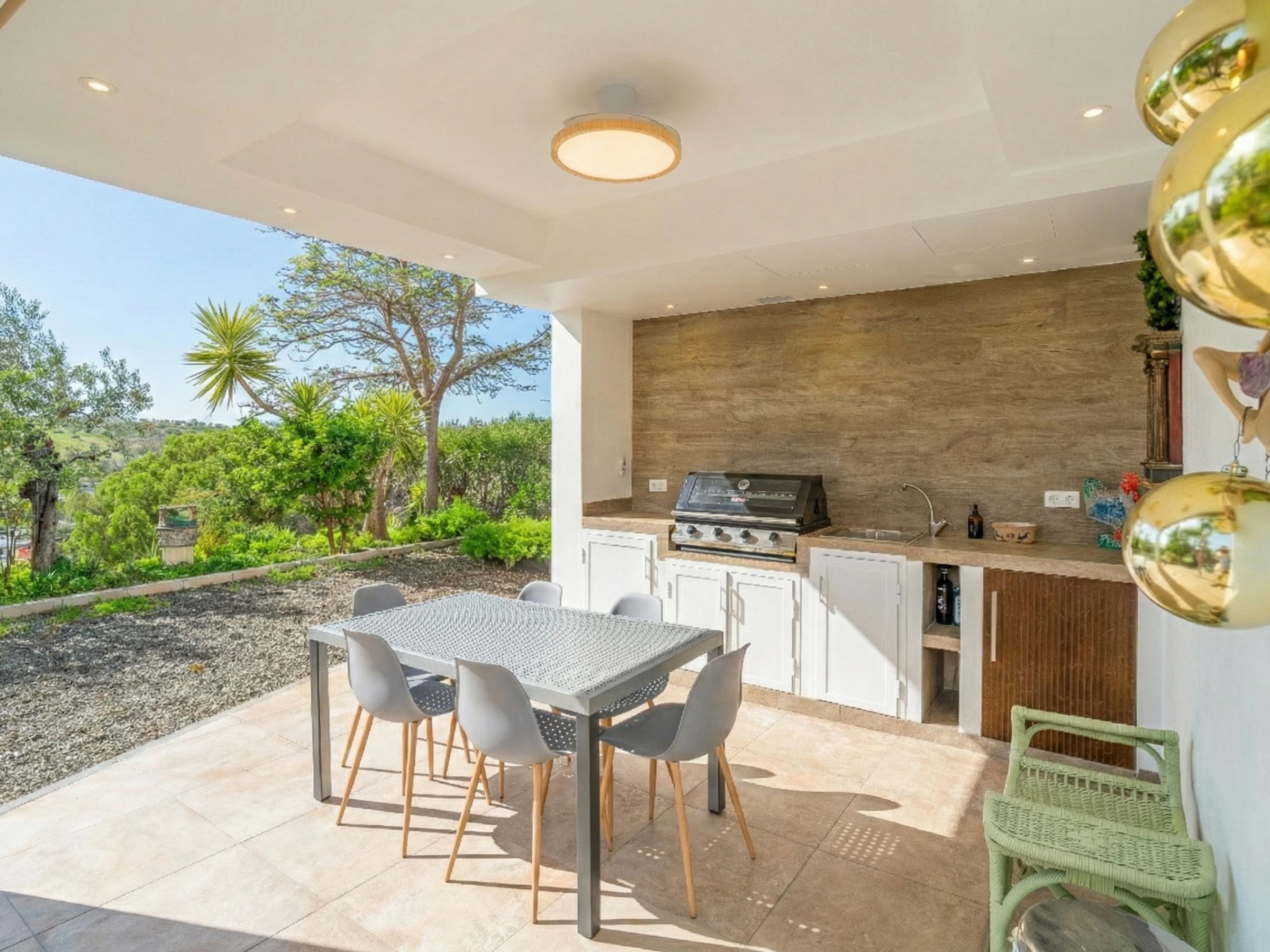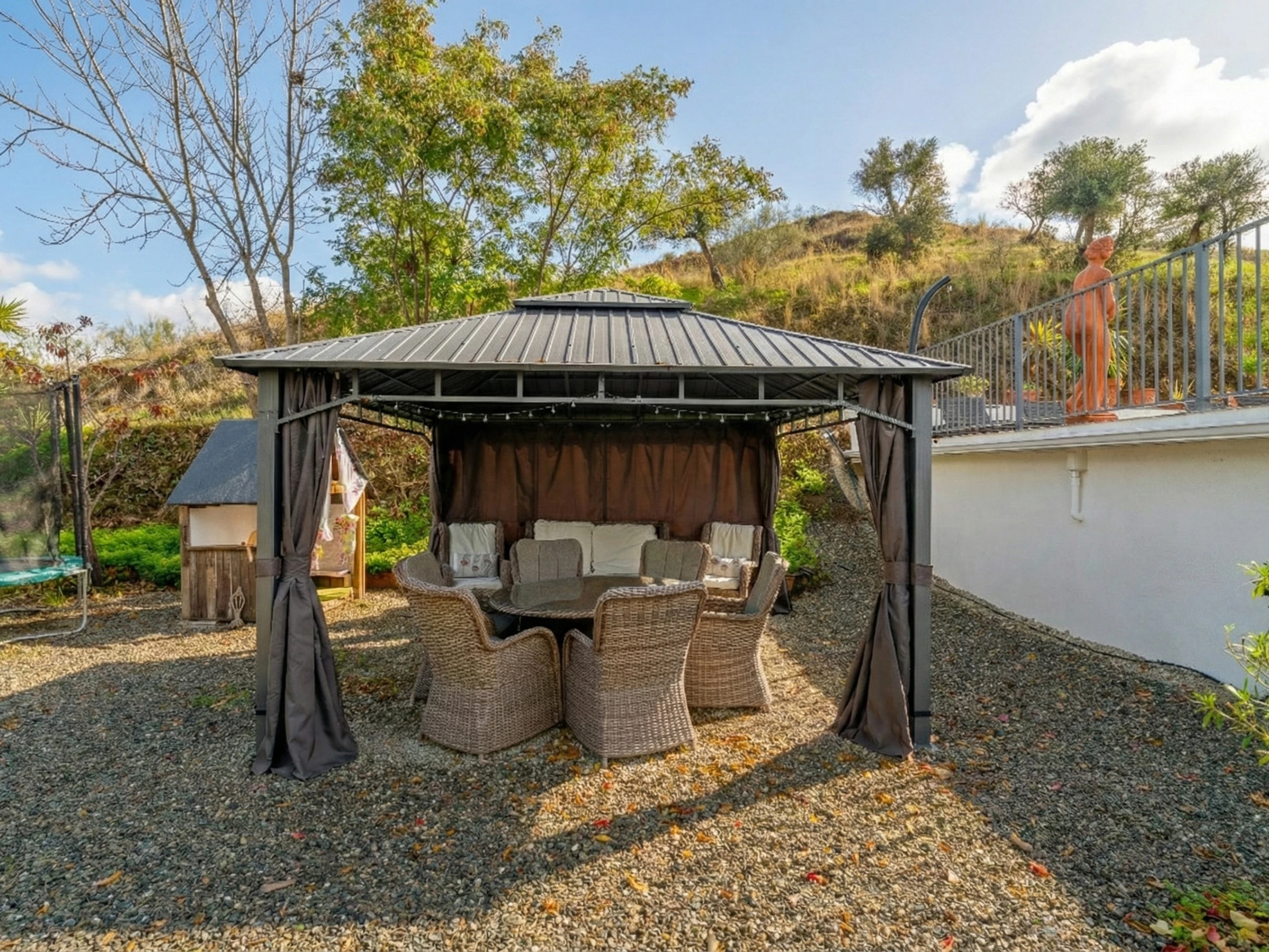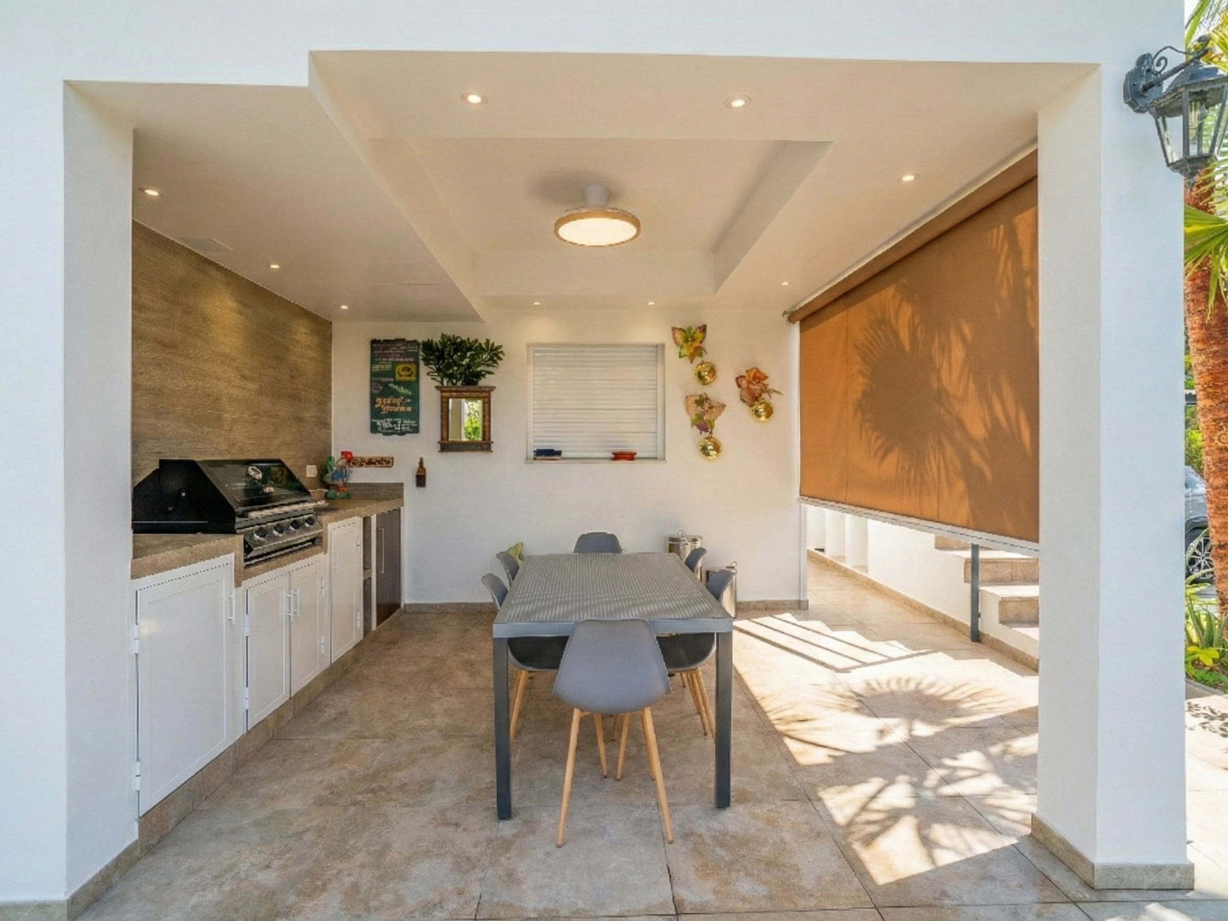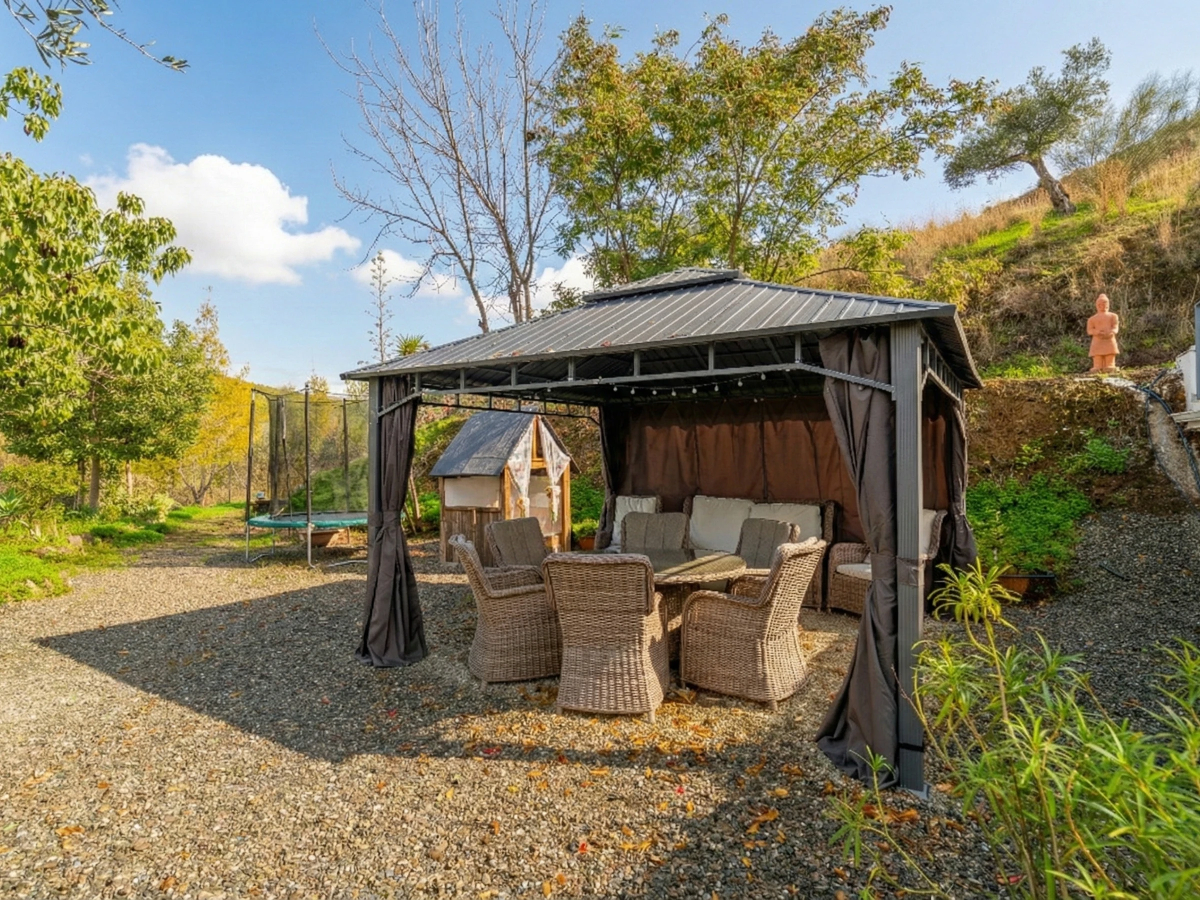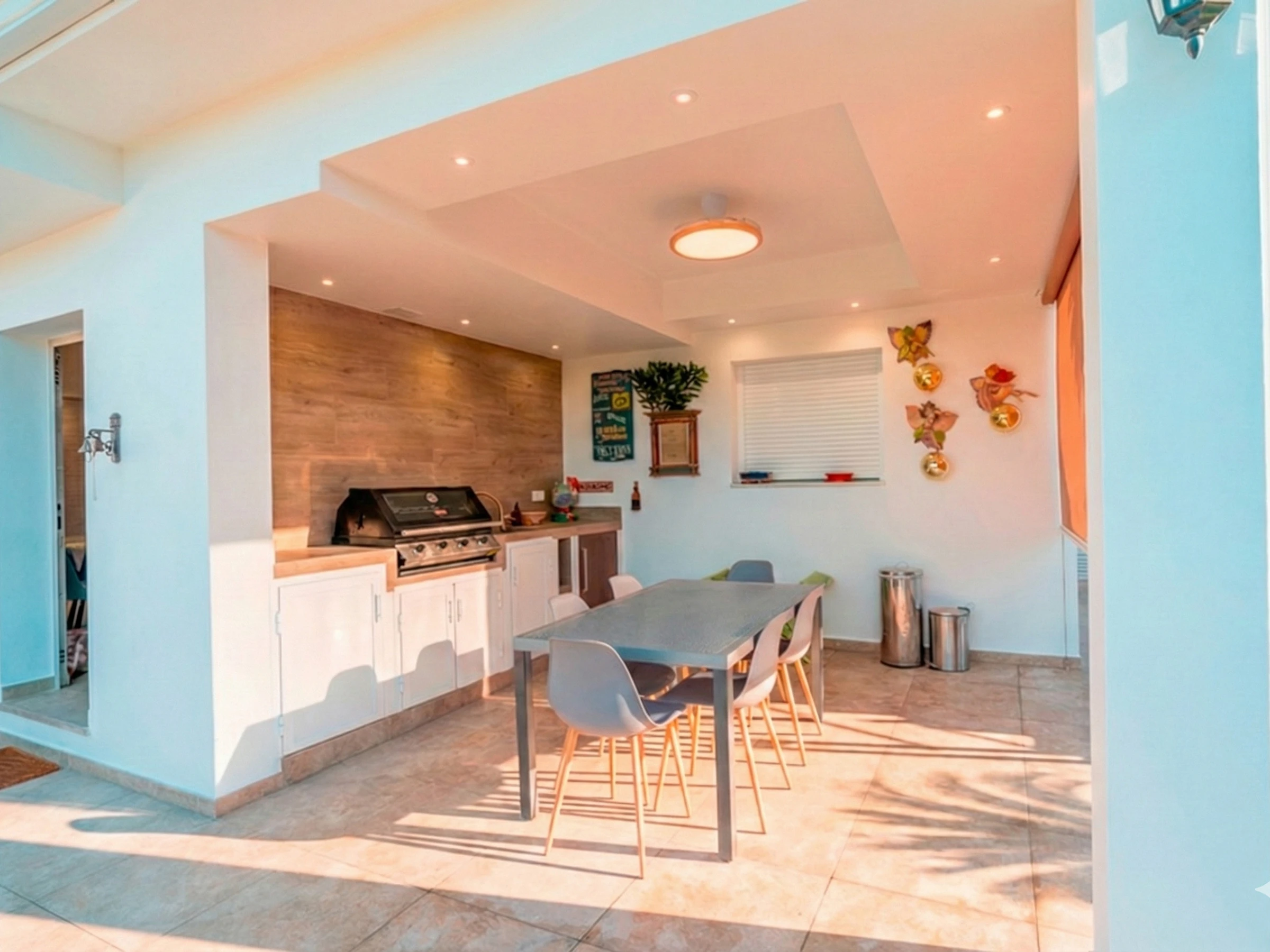La parcela es totalmente vallada y cuenta con piscina privada, aseo exterior, zona infantil, terraza con ventilador, barbacoa de gas y mobiliario de jardín, creando un entorno seguro y agradable para familias con niños.
