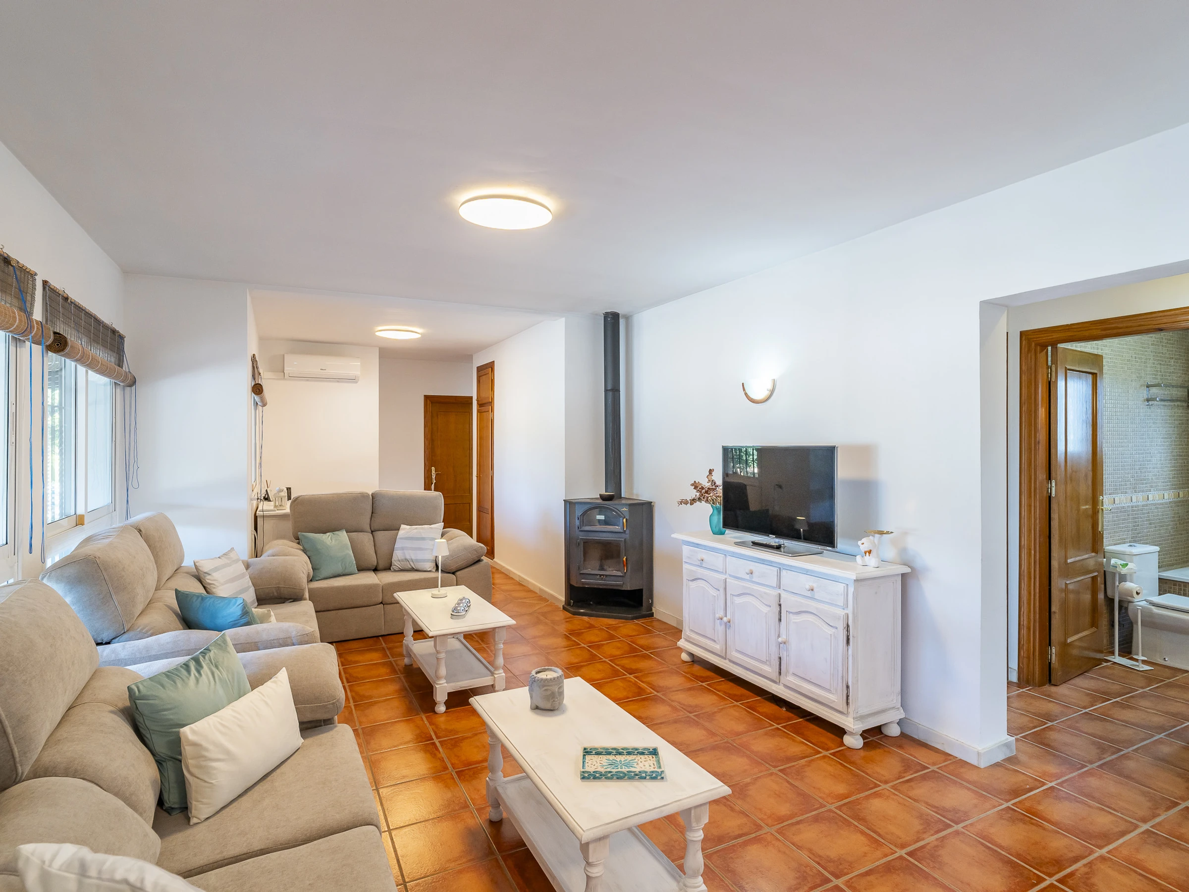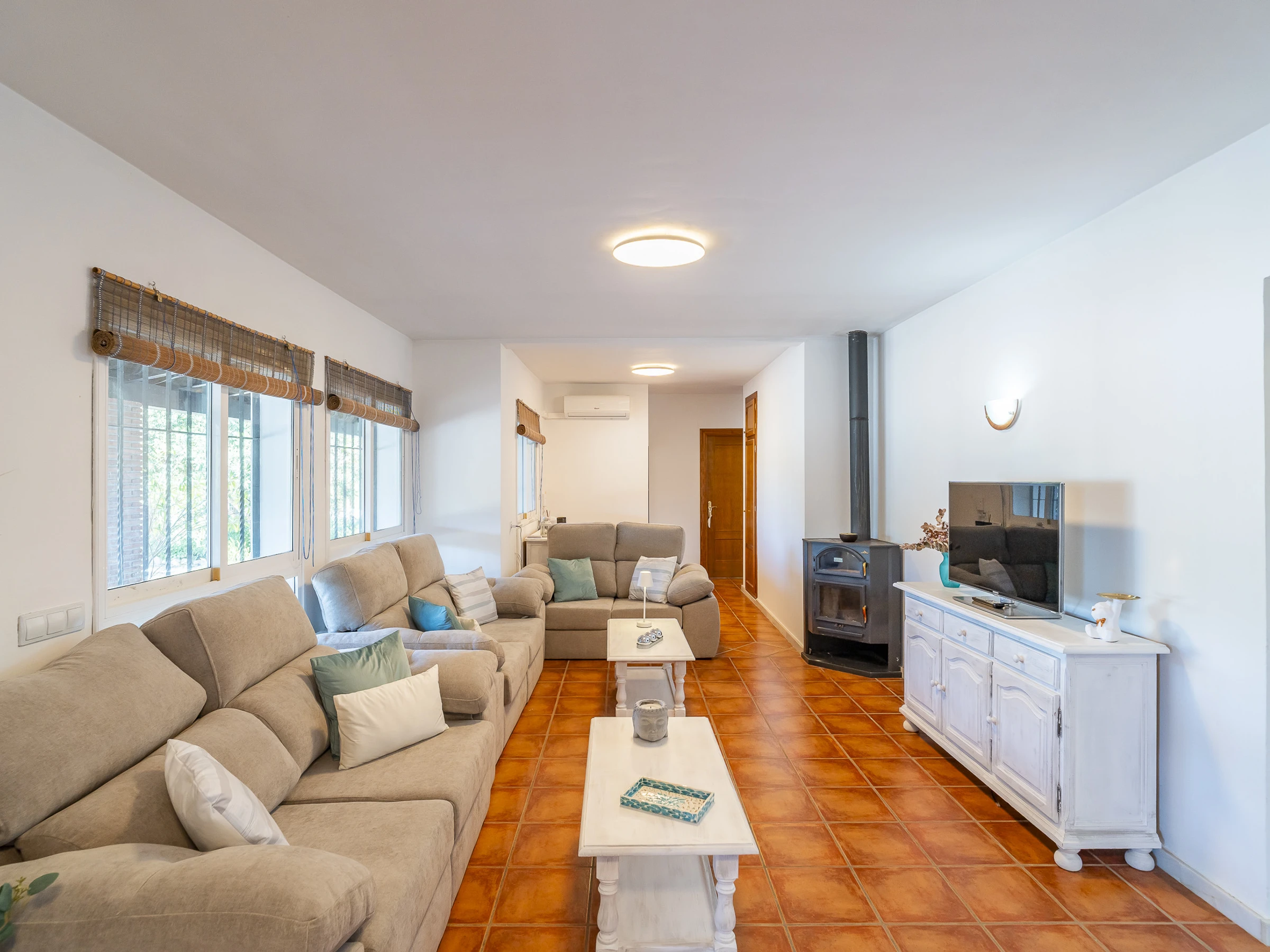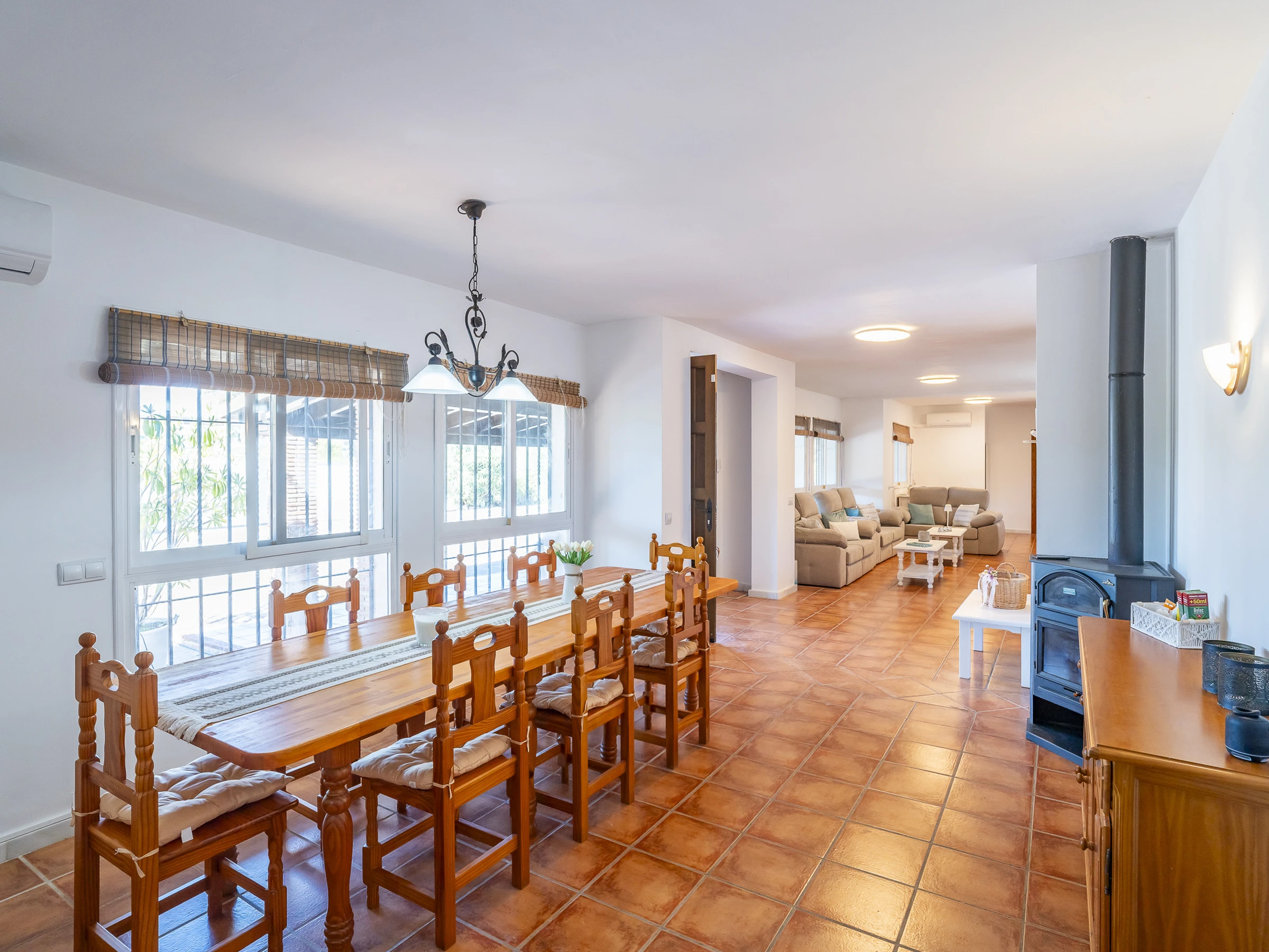 En el interior disfrutarás de un alojamiento cómodo y luminoso con aire acondicionado en toda la casa, 3 chimeneas, WiFi, Smart TV, mosquiteras, ventiladores y alarma de seguridad. La cocina, moderna y completa, dispone de lavavajillas, dos hornos, dos neveras, dos placas de inducción, microondas y todos los utensilios necesarios para estancias largas.