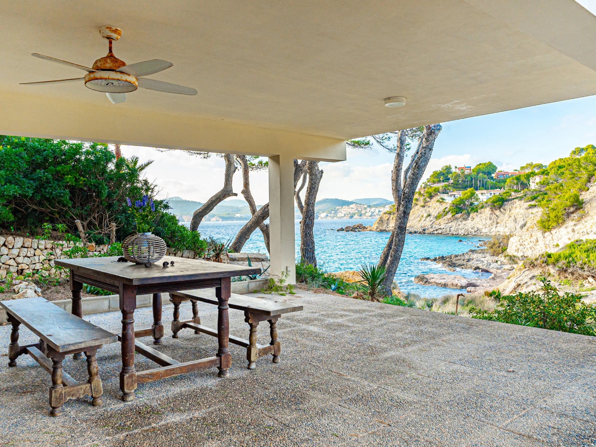 Villa Rivo es una villa de 250 m² con increíbles vistas al mar y acceso directo a varias calas (a tan solo 20 metros), situada en un lugar privilegiado de la Costa de la Calma. Dispone de una amplia terraza de unos 75m2, donde podrá disfrutar de las magníficas vistas, simplemente descansar bajo los pinos escuchando las olas o comiendo en familia. También podrás disfrutar del interior tanto por su comodidad, funcionalidad como por su estilo propio que lo hacen único. La casa tiene un total de seis dormitorios y diez camas. La zona exterior hace que esta villa sea tan atractiva por sus soleadas y cubiertas terrazas con preciosas vistas al mar, las calas que se encuentran justo a los pies de la villa y los jardines.