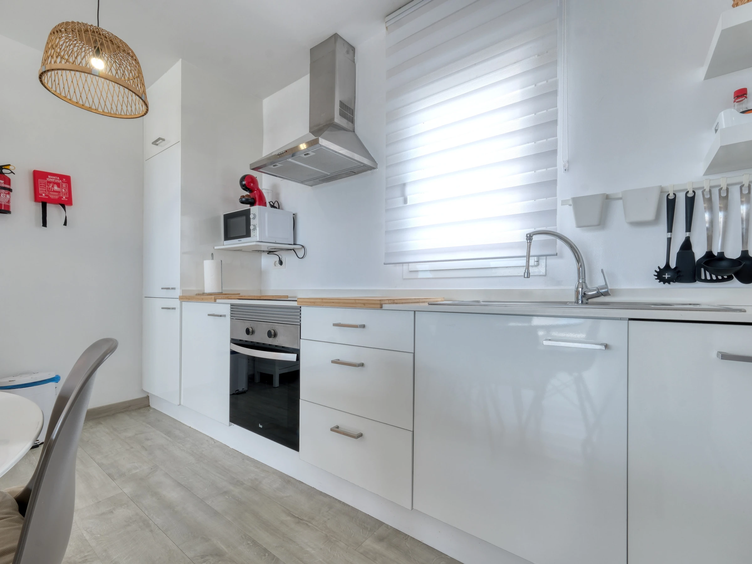 El alojamiento cuenta con un luminoso salón con cómodo sofá y televisión de pantalla plana. La cocina americana, moderna y totalmente equipada, dispone de placa de vitrocerámica, nevera, microondas, horno, congelador, lavavajillas, vajilla completa, utensilios de cocina, cafetera italiana y Dolce Gusto, tostadora, hervidor de agua y exprimidor.