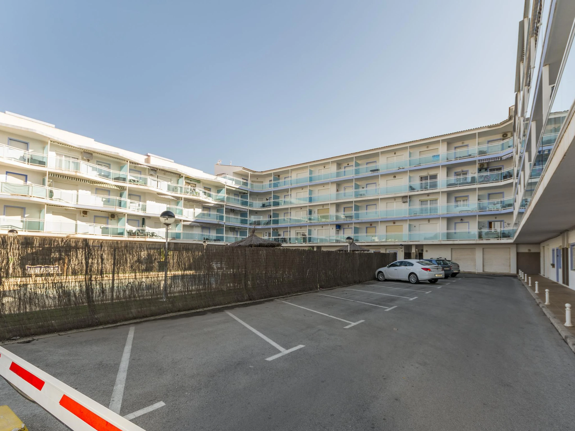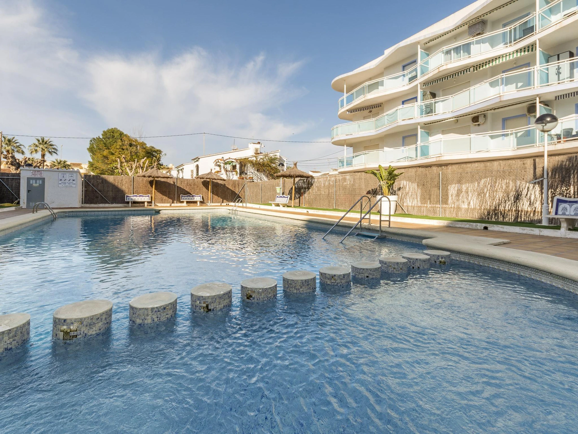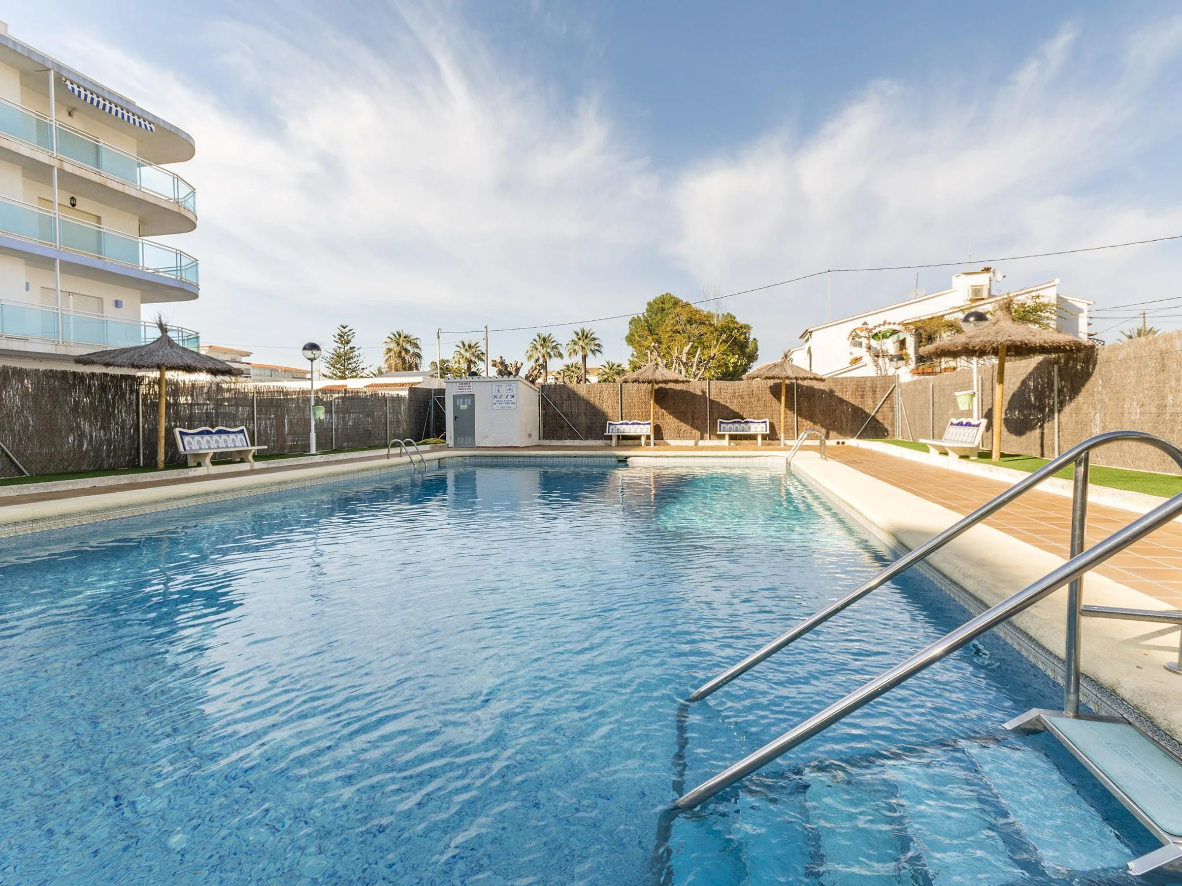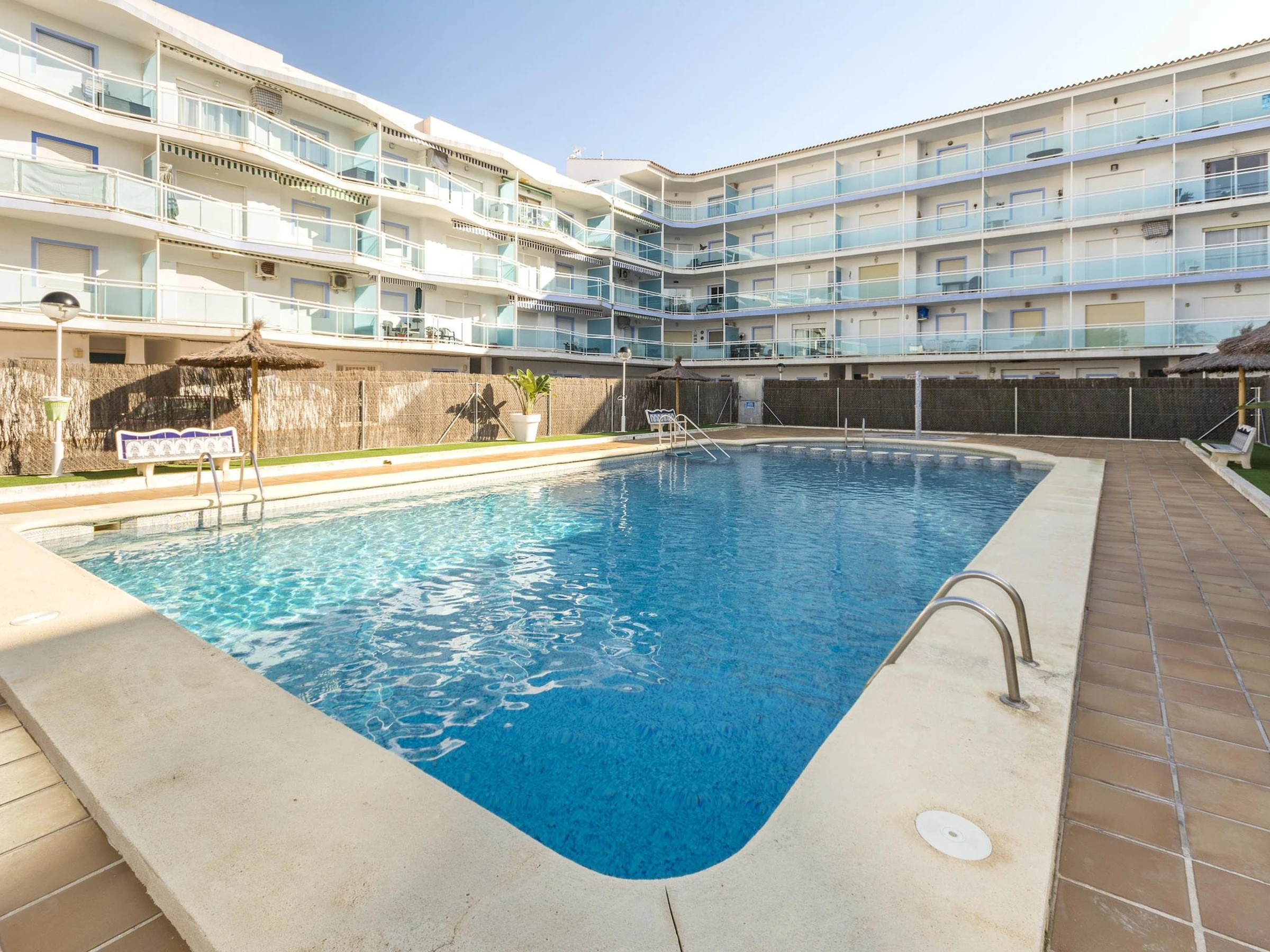 El apartamento está ubicado en la planta baja de una urbanización a pocos metros del mar. En sus exteriores encontrarán una gran piscina compartida de cloro con unas dimensiones de 15m x 7m y un rango de profundidad entre 1.1m y 2.2m, que será ideal para refrescarse en los días más cálidos. Los más pequeños también podrán jugar tranquilamente, ya que hay una piscina infantil de 0.6m de profundidad. Tengan en cuenta que la privacidad es parcial, ya que hay vecinos cerca.