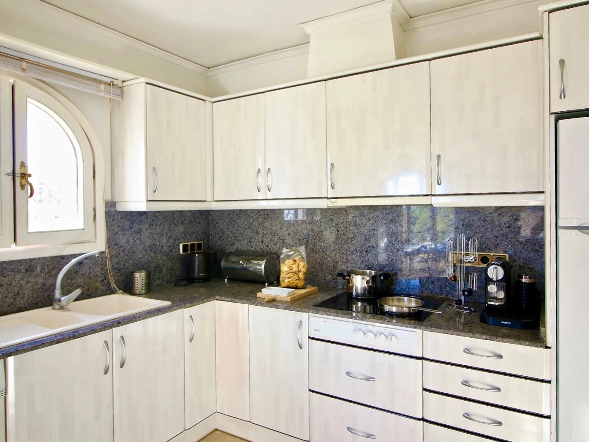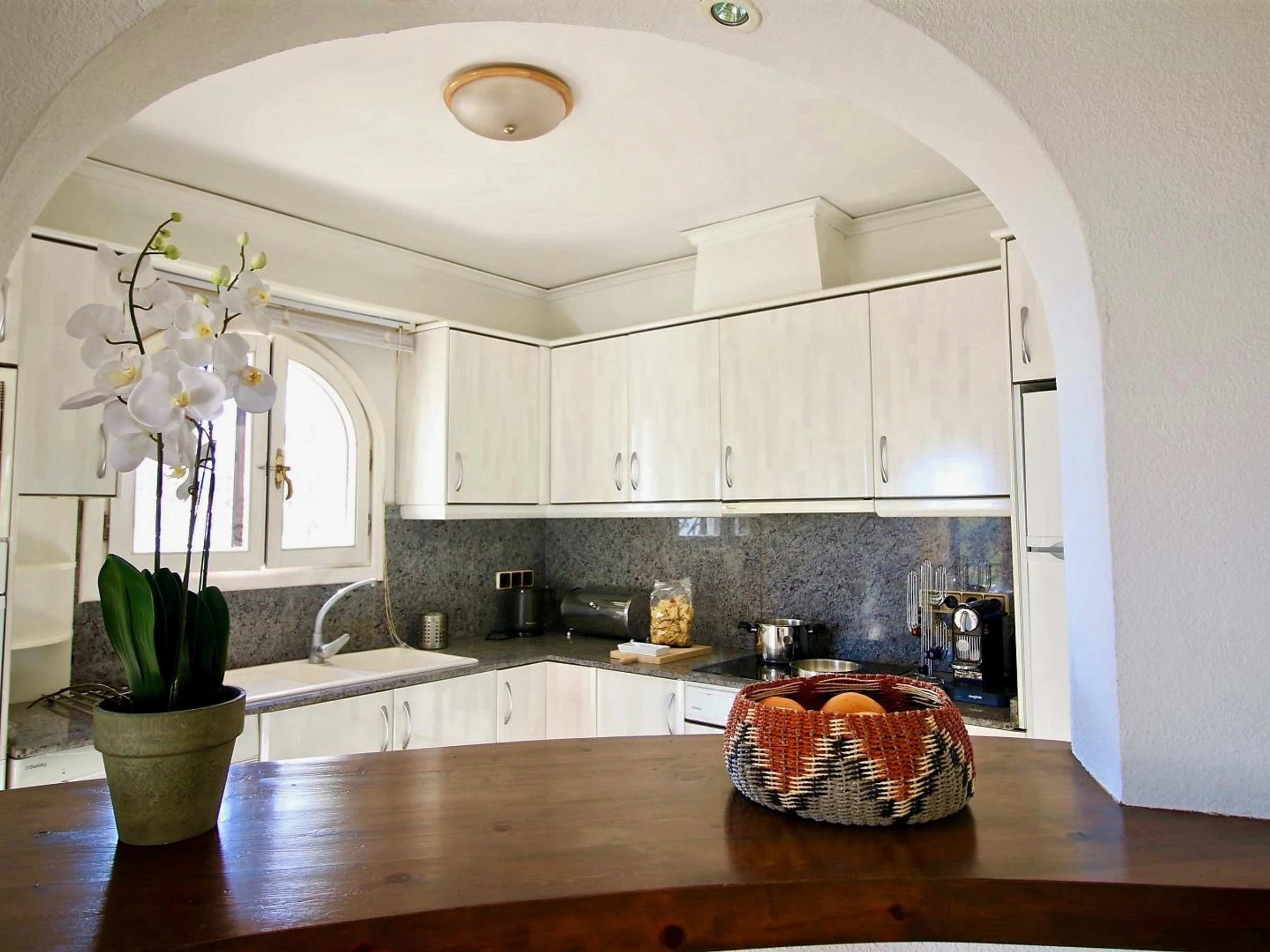 La cocina de barra americana está equipada con todo tipo de comodidades, vitrocerámica, nevera, microondas, horno, congelador, lavadora, lavavajillas, vajilla/cubertería, utensilios/cocina, cafetera y tostadora.