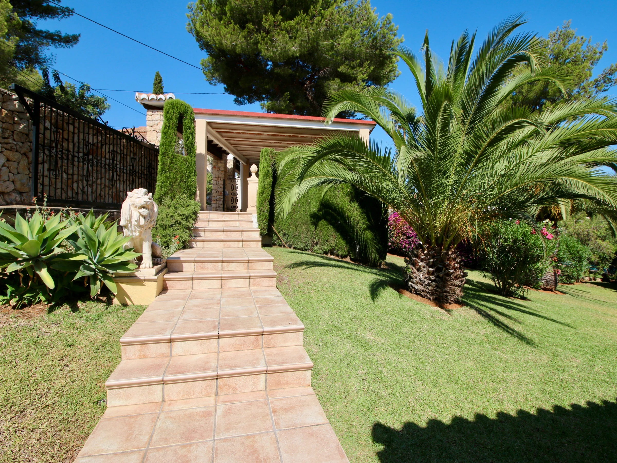 Para acceder a la piscina y al estudio tenemos que bajar una escaleras que recorren el bonito jardín de la villa, compuesto por extensiones de césped, palmeras y diferentes plantas (la parcela está totalmente vallada). En esta zona encontramos además una bonita barbacoa que permitirá que disfruten como nunca de la piscina en verano. ​