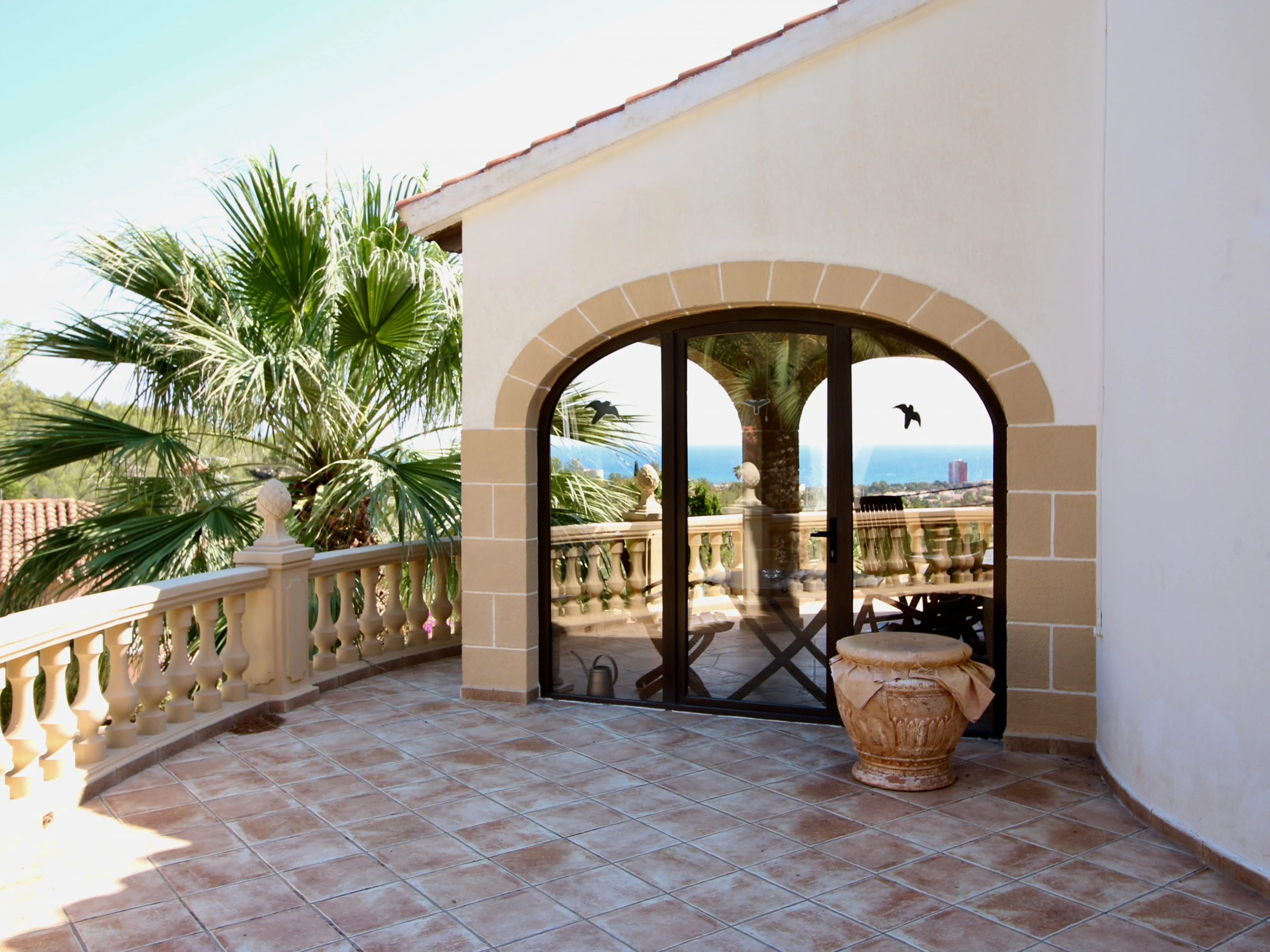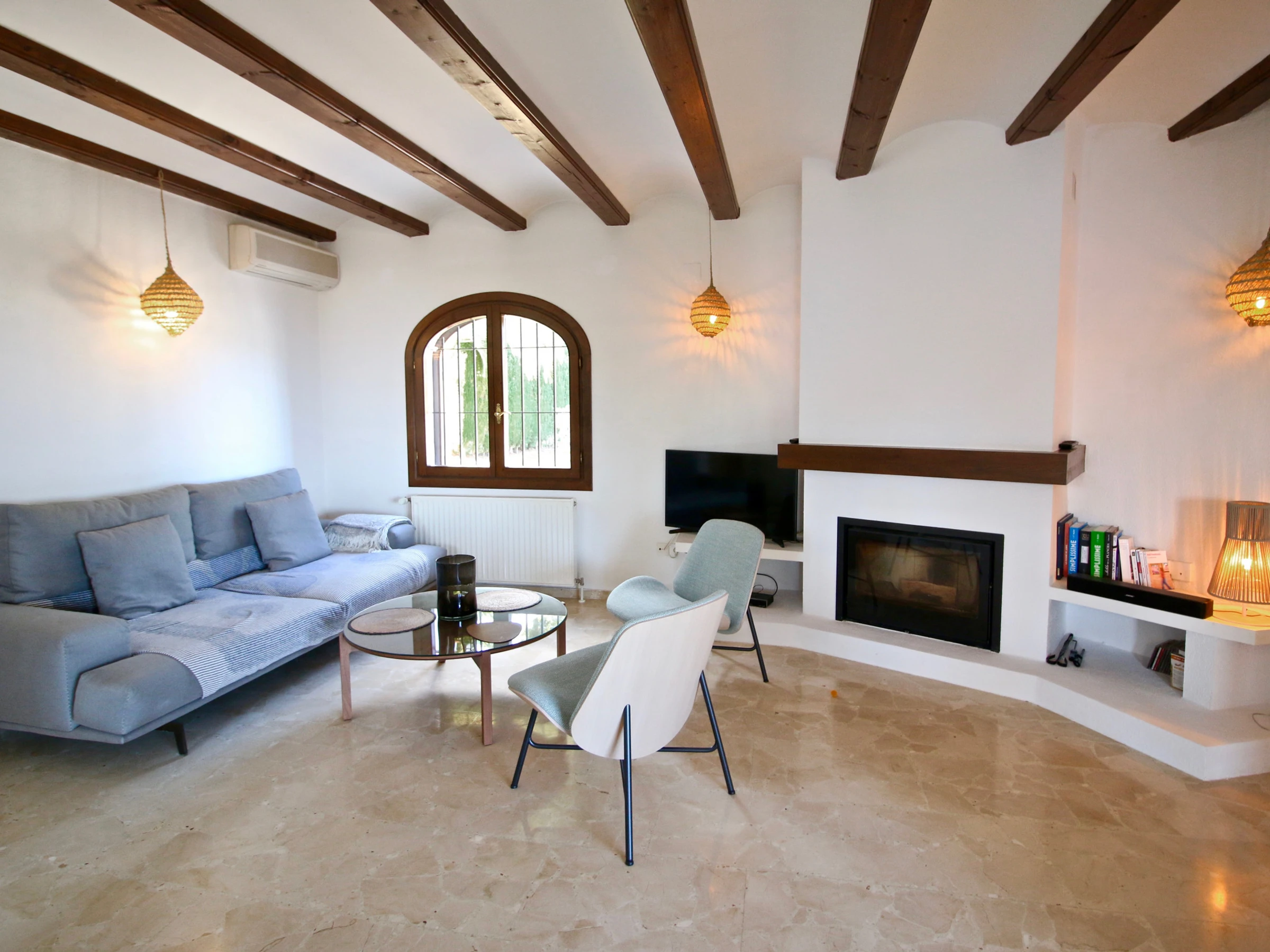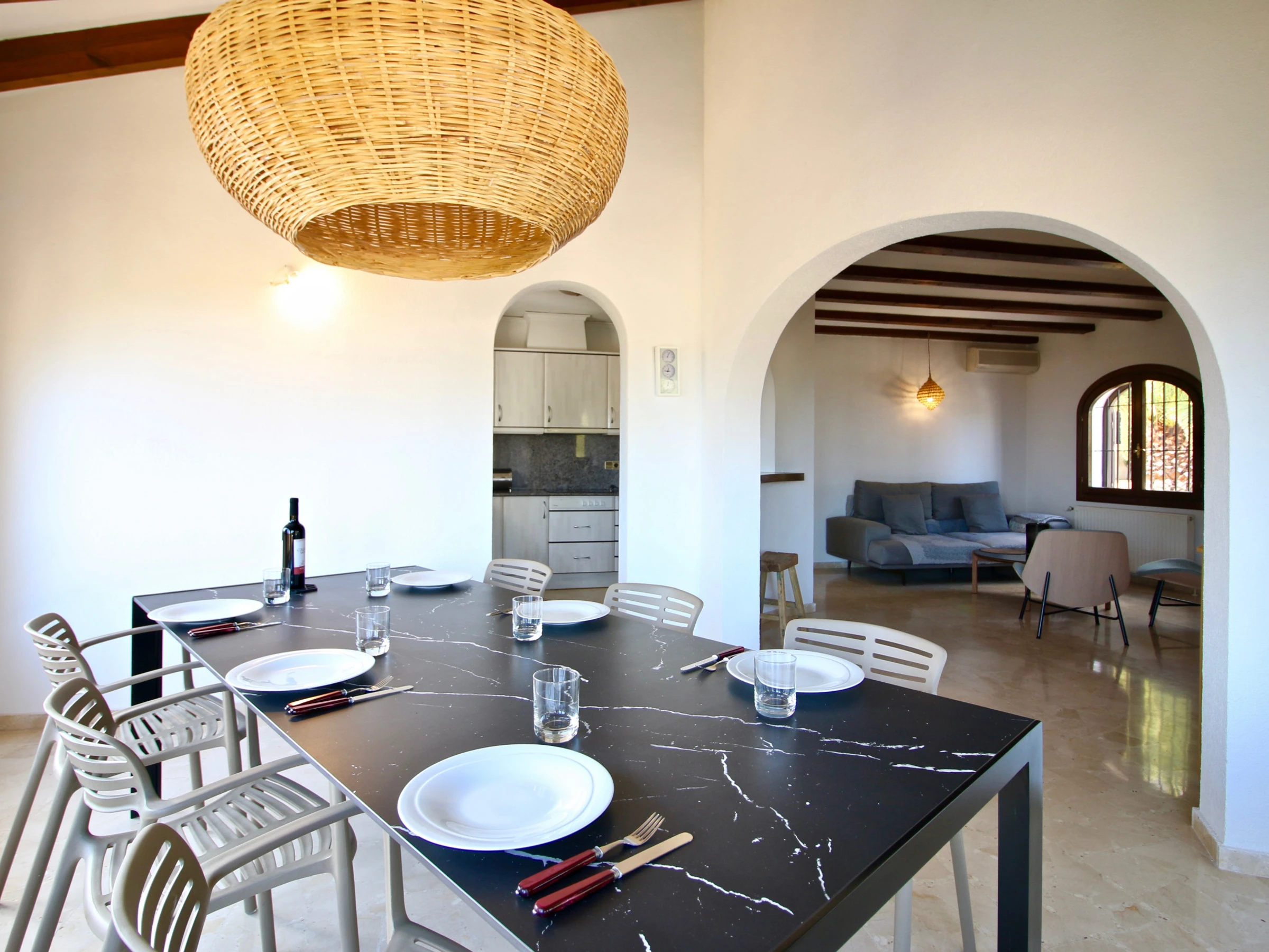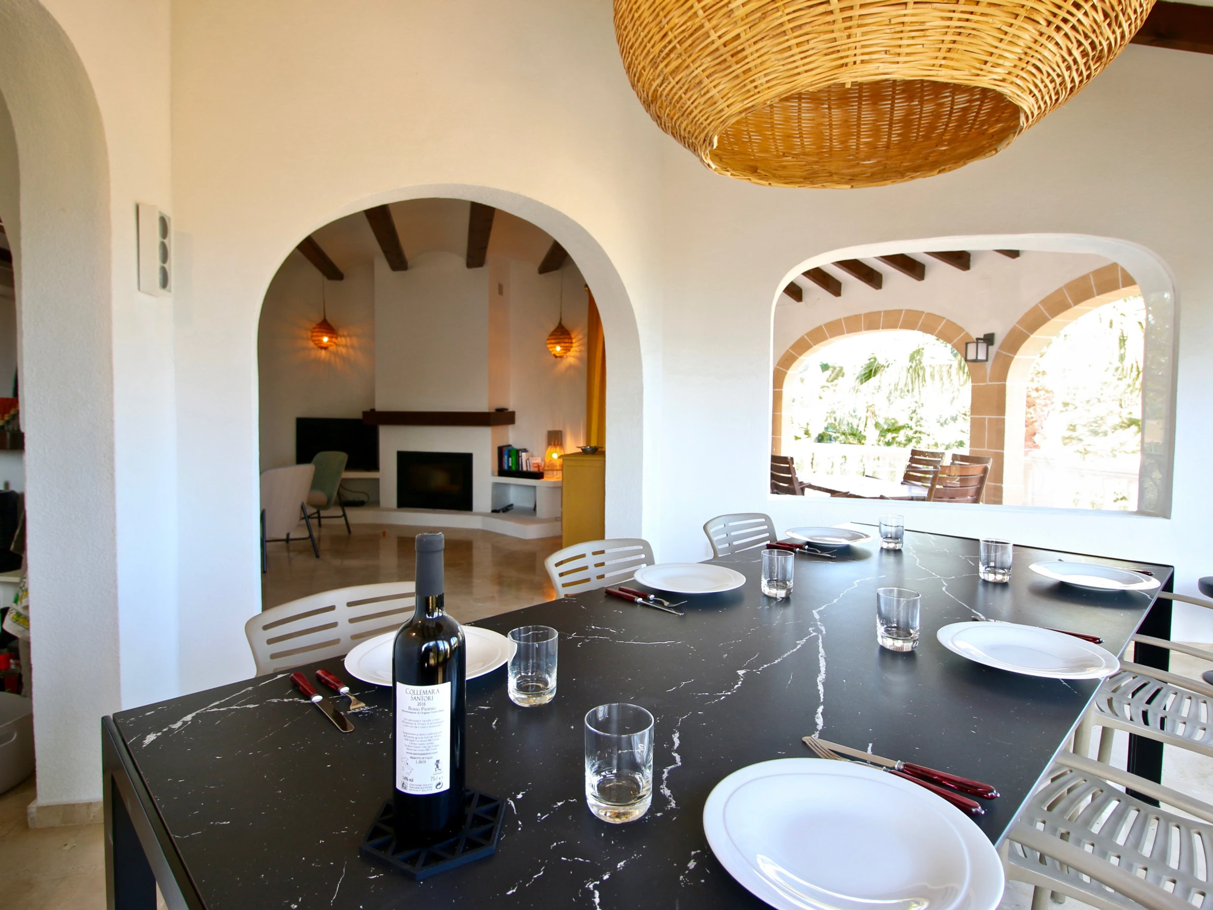 Desde el amplio salón comedor con chimenea es dónde encontramos las mejores vistas de la casa. Desde sus grandes ventanales se ven perfectamente Denia y su bahía. Además dispone de salida a una terraza cubierta perfecta para comer en los suaves días invernales de la Costa Blanca.