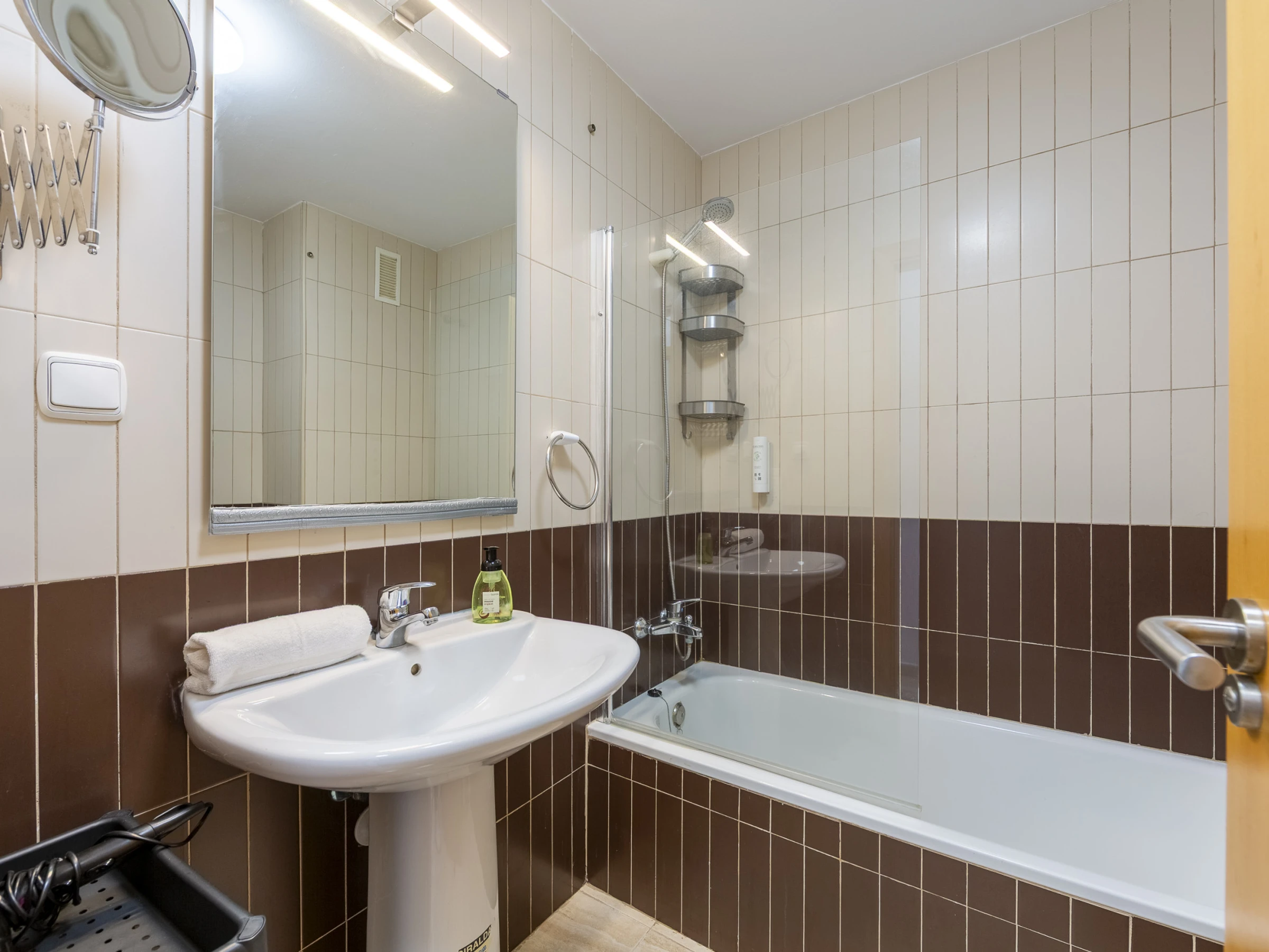 El apartamento, con aire acondicionado, cuenta con 2 dormitorios, una acogedora sala de estar, una cocina completamente equipada con nevera y cafetera, y un baño con bañera.