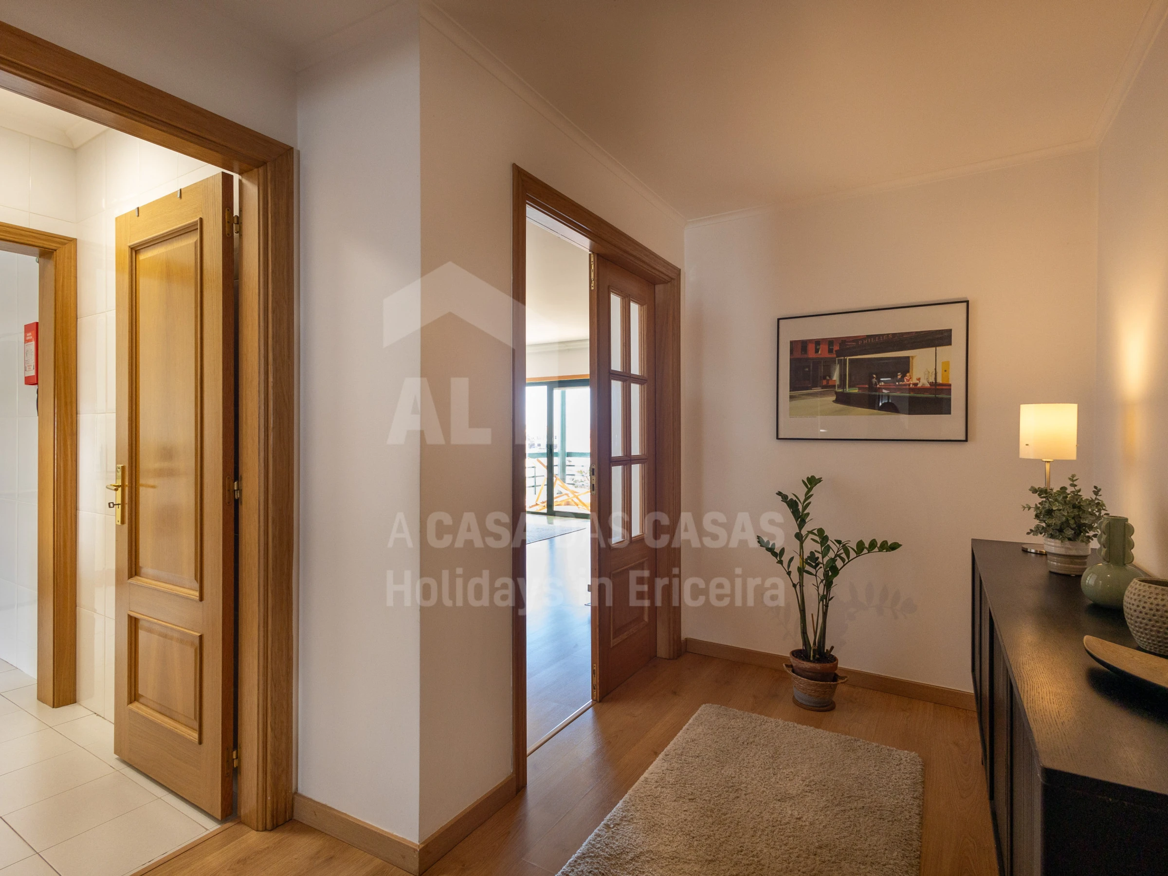 Excelente apartamento de 85 m2, ubicado en el centro de Ericeira, con 1 habitación, un balcón con una hermosísima vista al mar y capacidad para 3 personas. Dispone de una sala con sofá (sofá cama), TV, chimenea y mesa de comedor; una habitación con cama de matrimonio; un baño con ducha y una cocina independiente totalmente equipada con frigorífico, microondas, horno, congelador, lavadora, lavavajillas, vajilla, cubiertos, utensilios de cocina, cafetera, tostadora y jarra eléctrica. En la sala dispone además de un agradable balcón con vista al mar y al jardín y piscina de la urbanización y en la cocina de un pequeño balcón. El apartamento es un segundo piso y está insertado en una urbanización con piscina (con fecha de apertura el 1/5 y fecha de cierre el 31/10) y garaje. Dispone además de internet (wifi) y plancha. Se encuentra a 400 m de la playa y 450 m del supermercado. Nota: Nos gustaría informarle que, para estancias superiores a 28 noches, el valor total de los consumos de electricidad, agua y gas incluido en el precio es de 150€/mes. Siempre que, al final de cada mes, la suma de dichos consumos exceda este valor, el remanente será responsabilidad del huésped, siendo cobrado ese valor al final de cada mes. Le informamos además de la existencia de una Tasa Municipal Turística, instituida en la modalidad de tasa de alojamiento en todos los inmuebles de AL. El valor de esta tasa se cobra por noche y por persona (mayor de 12 años) en el valor unitario de 2,40€ en época alta (1 de Mayo a 31 de Octubre) y de 1,20€ en época baja (1 de Noviembre a 30 de Abril). El pago del valor de esta tasa no está incluido en el valor cobrado por el alojamiento y deberá ser pagado en el momento del check-in en efectivo. El valor de esta tasa es anualmente modificado por la Cámara Municipal de Mafra, por lo que podrían surgir modificaciones en los valores presentados.