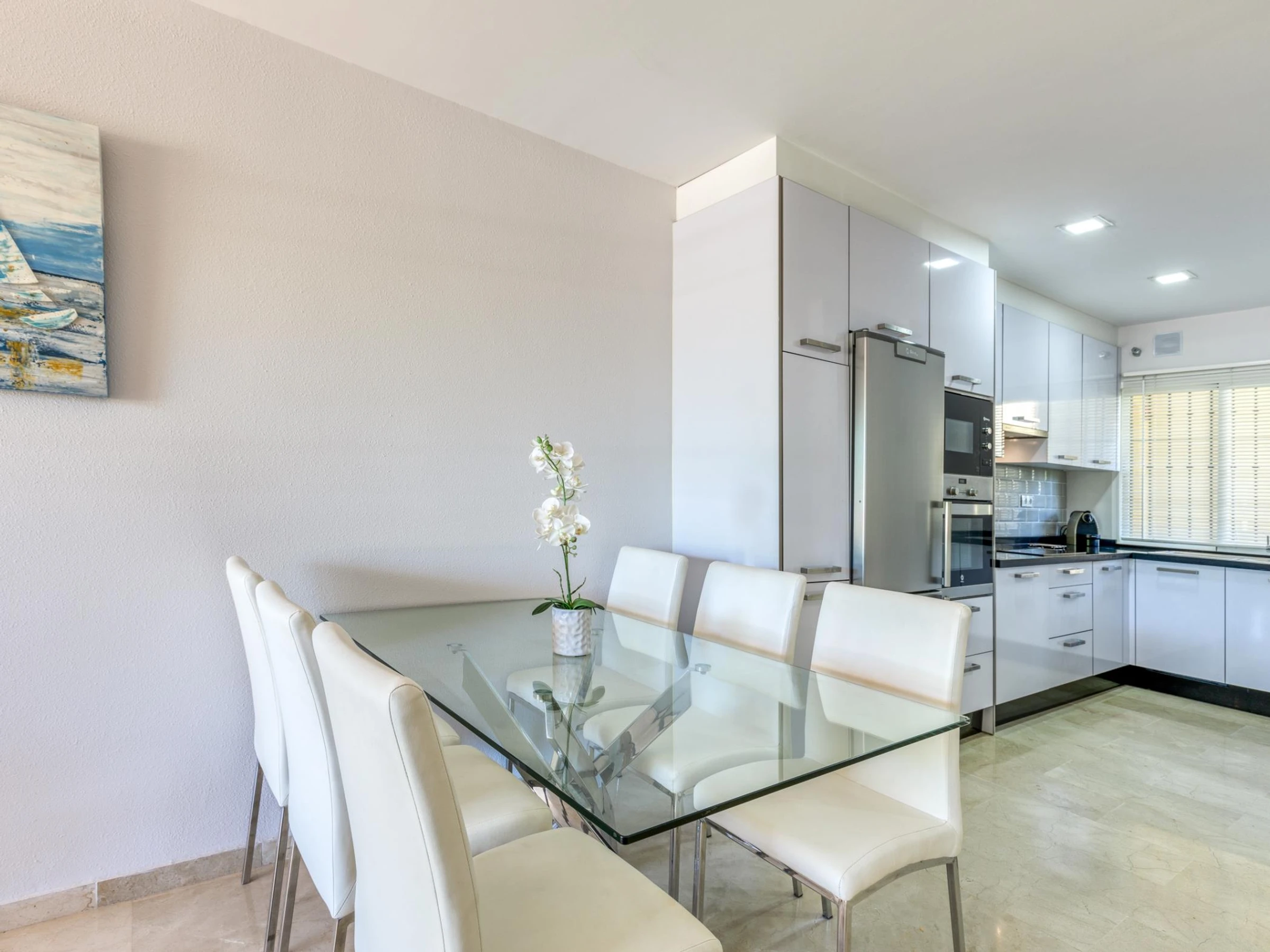 Esta elegante y moderna propiedad tiene 2 amplios dormitorios, 1 con cama doble y el otro con 2 camas individuales, 2 baños, con duchas, y una cocina de concepto abierto totalmente equipada con lavadora, cocina, microondas y nevera-congelador. Hay un salón comedor amplio y luminoso con suelos de mármol y un cómodo sofá en forma de L, y una terraza muy grande orientada al sur con amplios asientos, perfecta para disfrutar de las suaves tardes de verano.