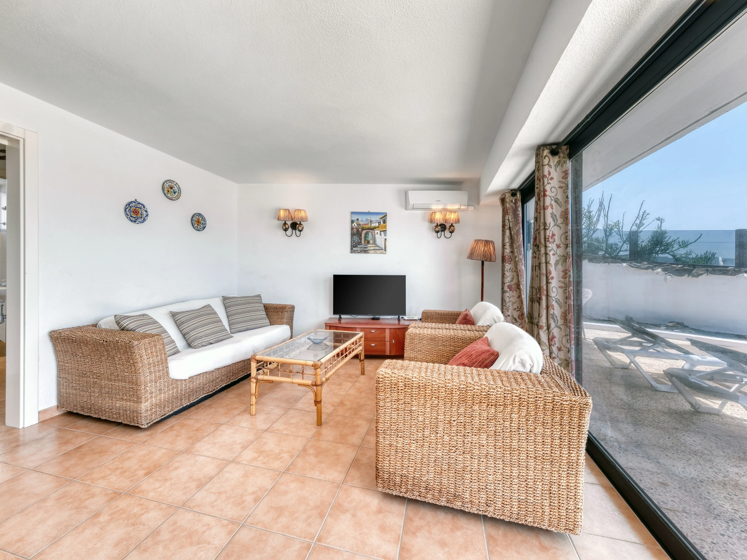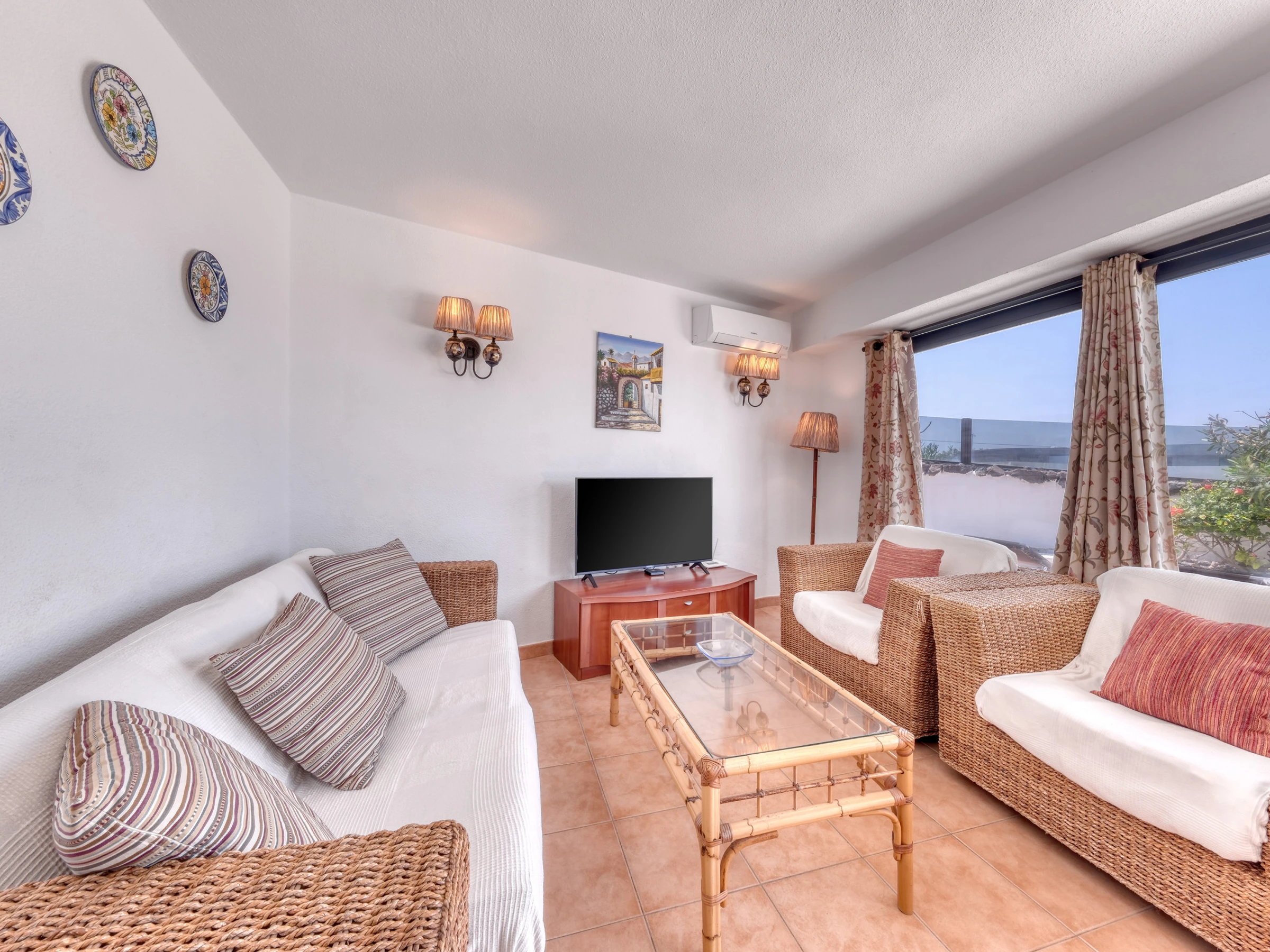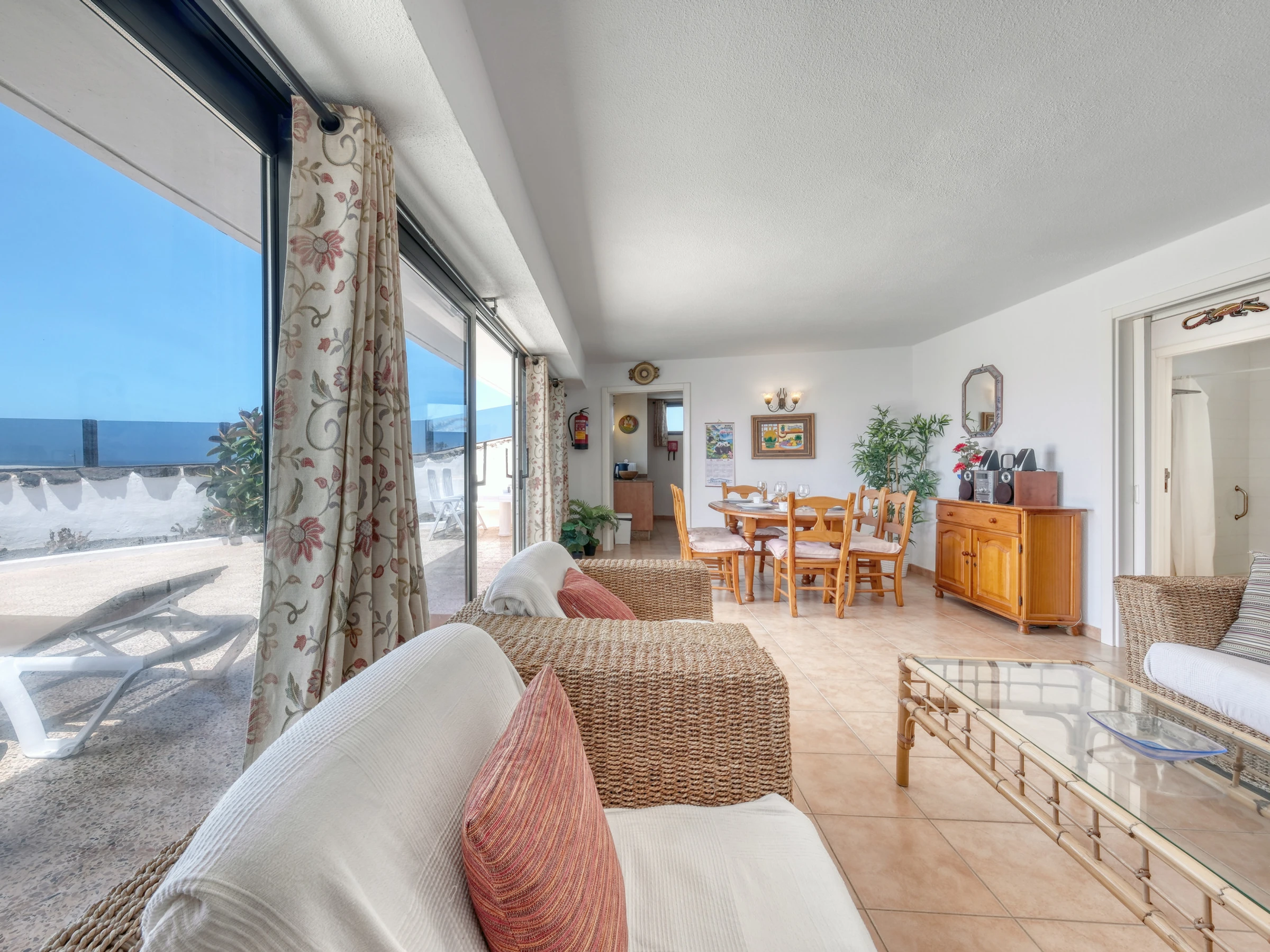 El bungalow dispone de un luminoso salón con zona de estar y comedor, diseñado para ofrecer confort y funcionalidad en un ambiente moderno y acogedor. Sus amplios ventanales permiten una agradable entrada de luz natural y conectan directamente con la terraza exterior con vistas al océano, creando un espacio ideal para relajarse después de un día de playa.