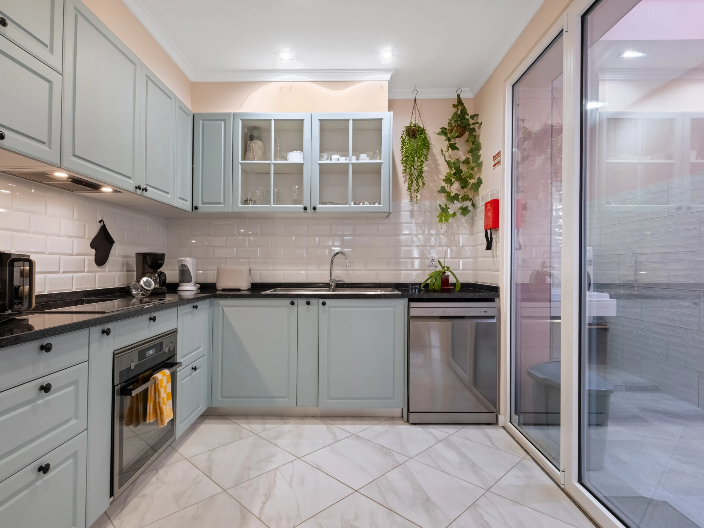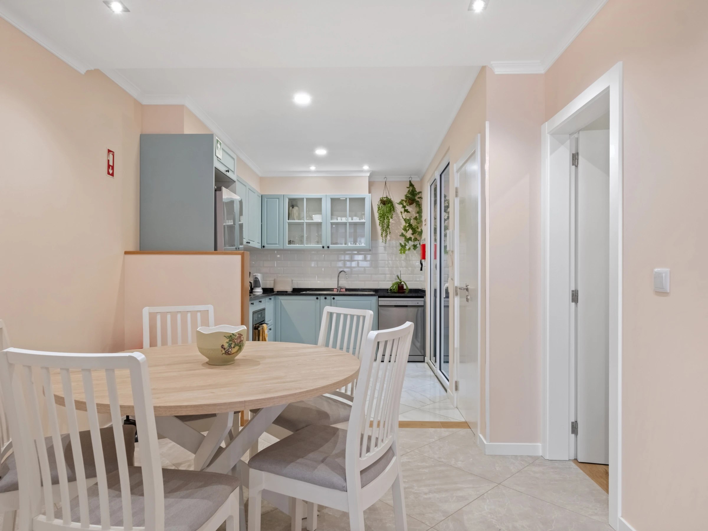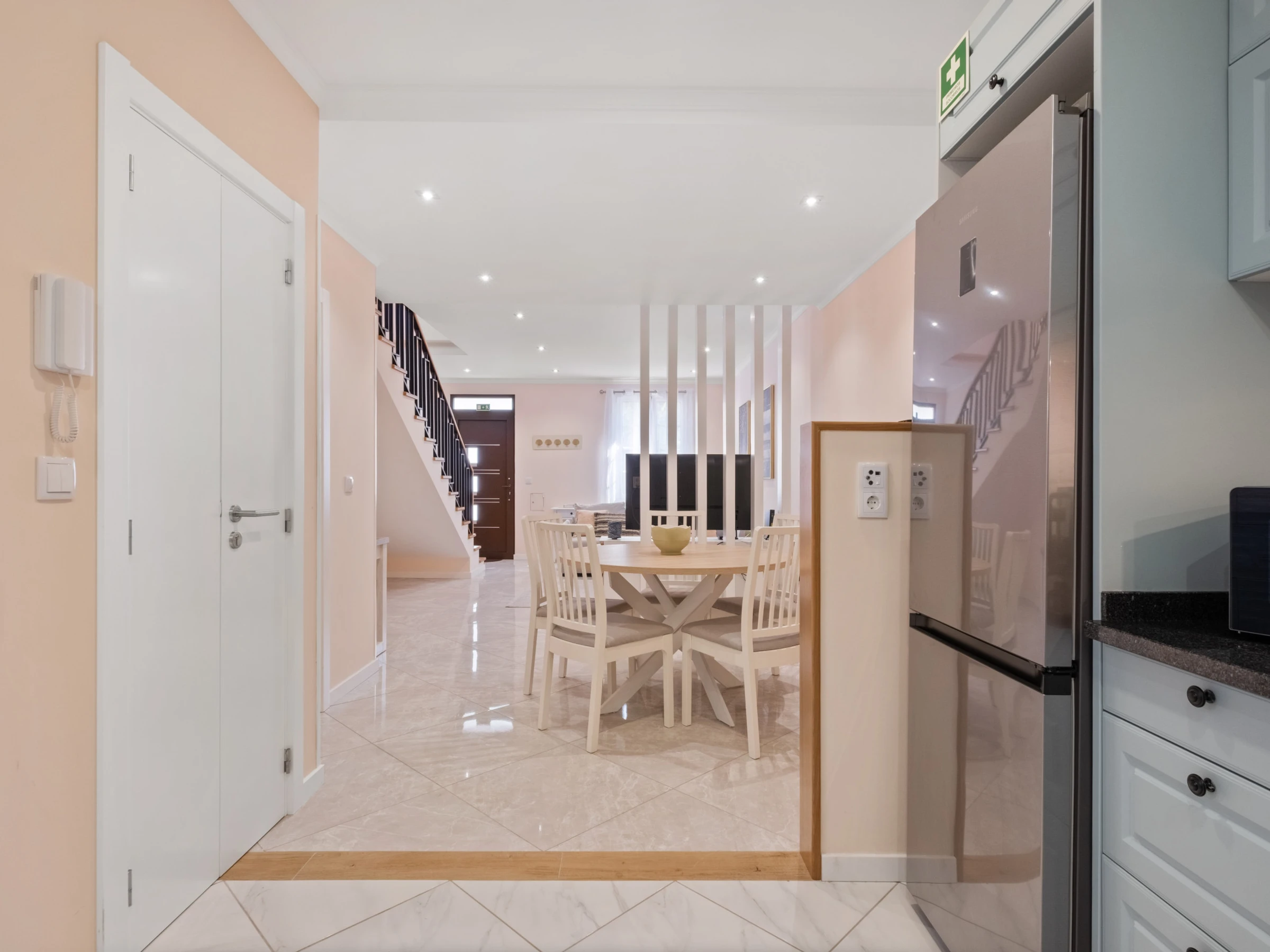 Al entrar en la propiedad, será recibido por una amplia sala en concepto open space, donde se integra un salón acogedor, una zona de comidas con mesa y sillas, y una cocina moderna totalmente equipada — ideal para preparar sus comidas con todo el confort disponiendo de todos los utensilios necesarios.