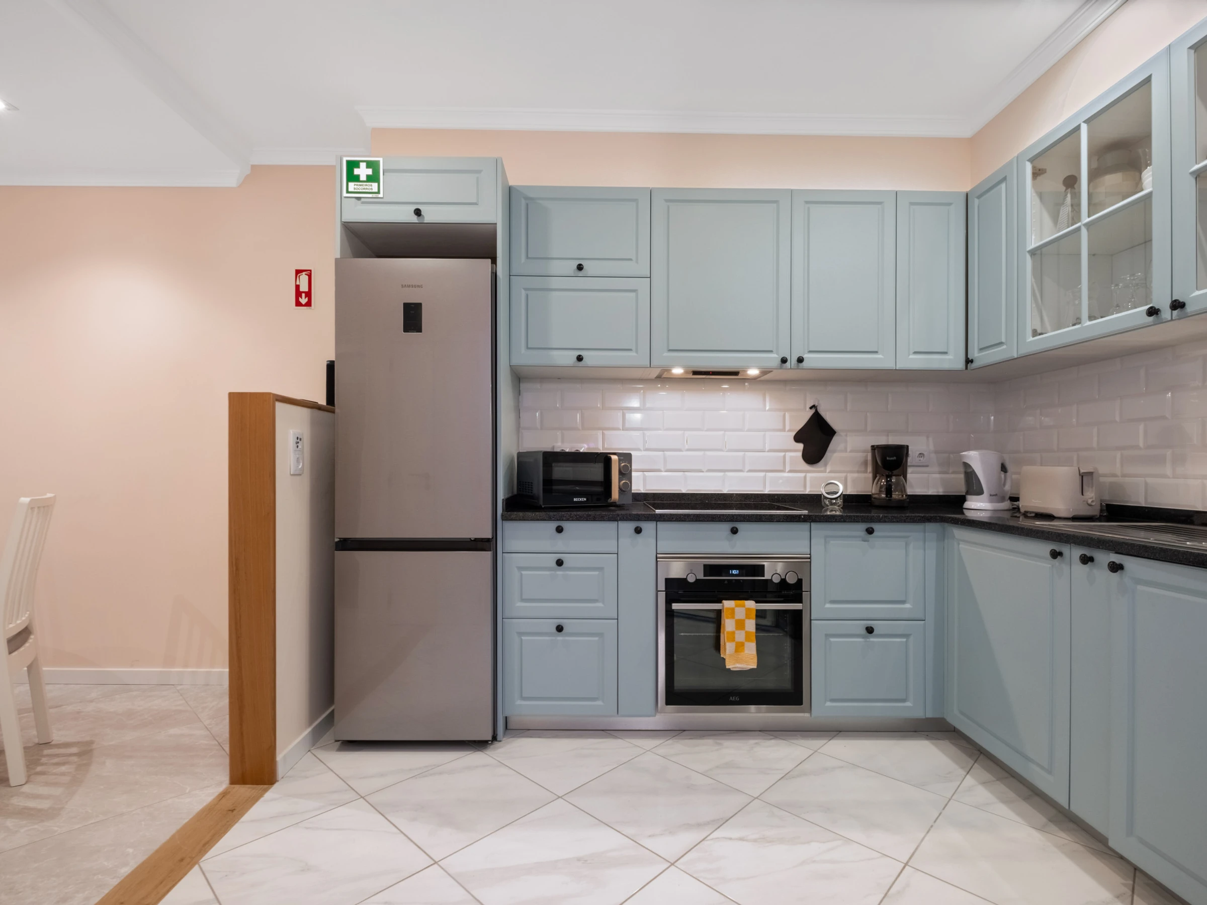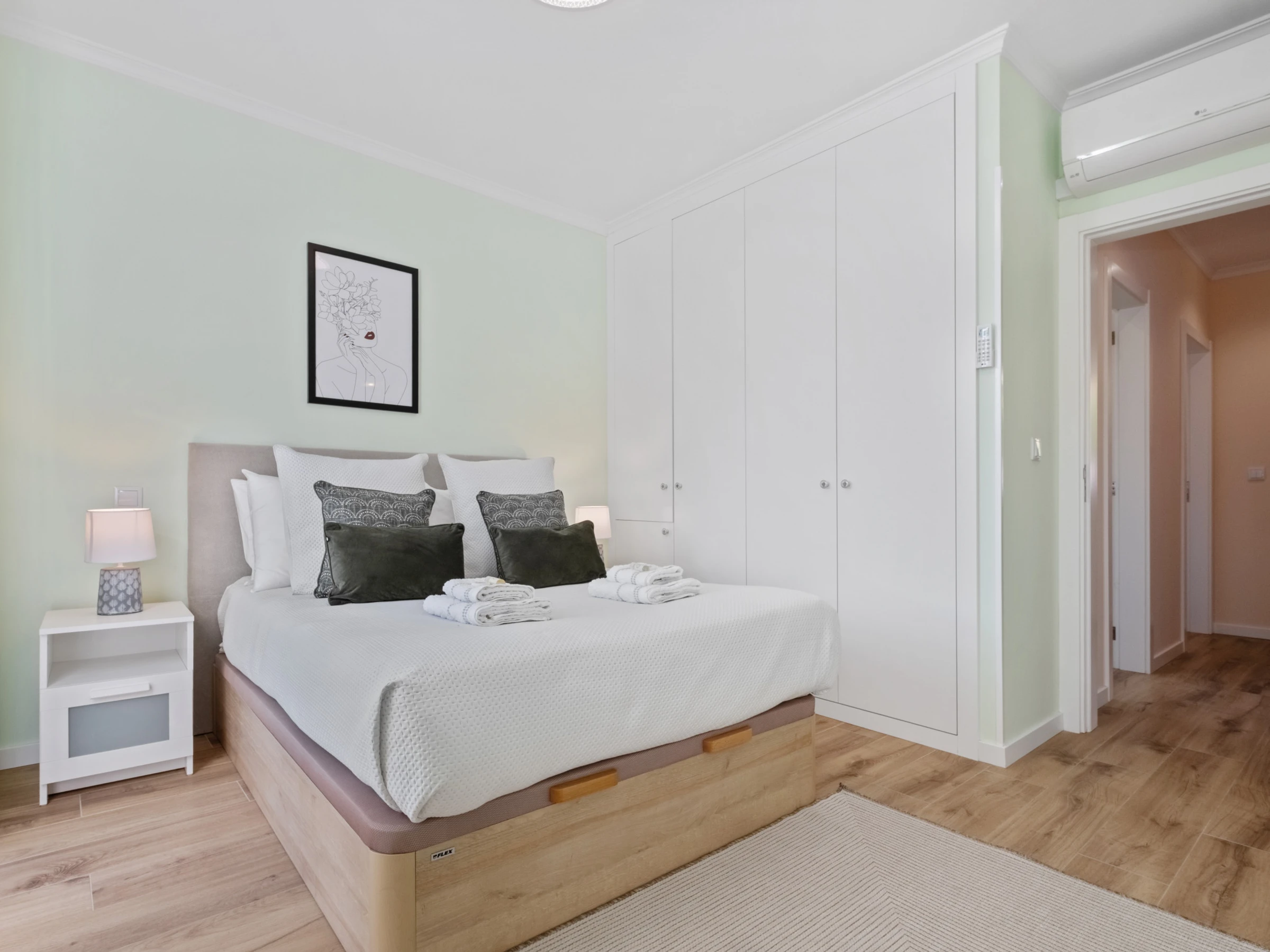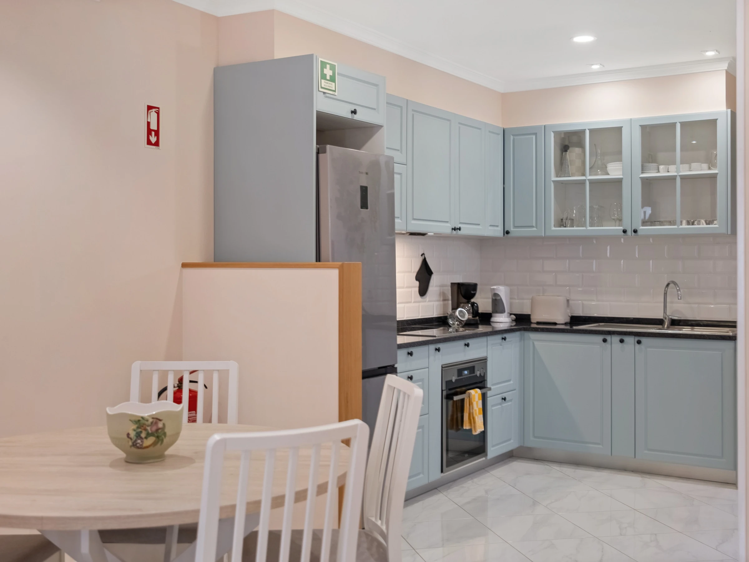 Al entrar en la propiedad, será recibido por una amplia sala en concepto open space, donde se integra un salón acogedor, una zona de comidas con mesa y sillas, y una cocina moderna totalmente equipada — ideal para preparar sus comidas con todo el confort disponiendo de todos los utensilios necesarios.
