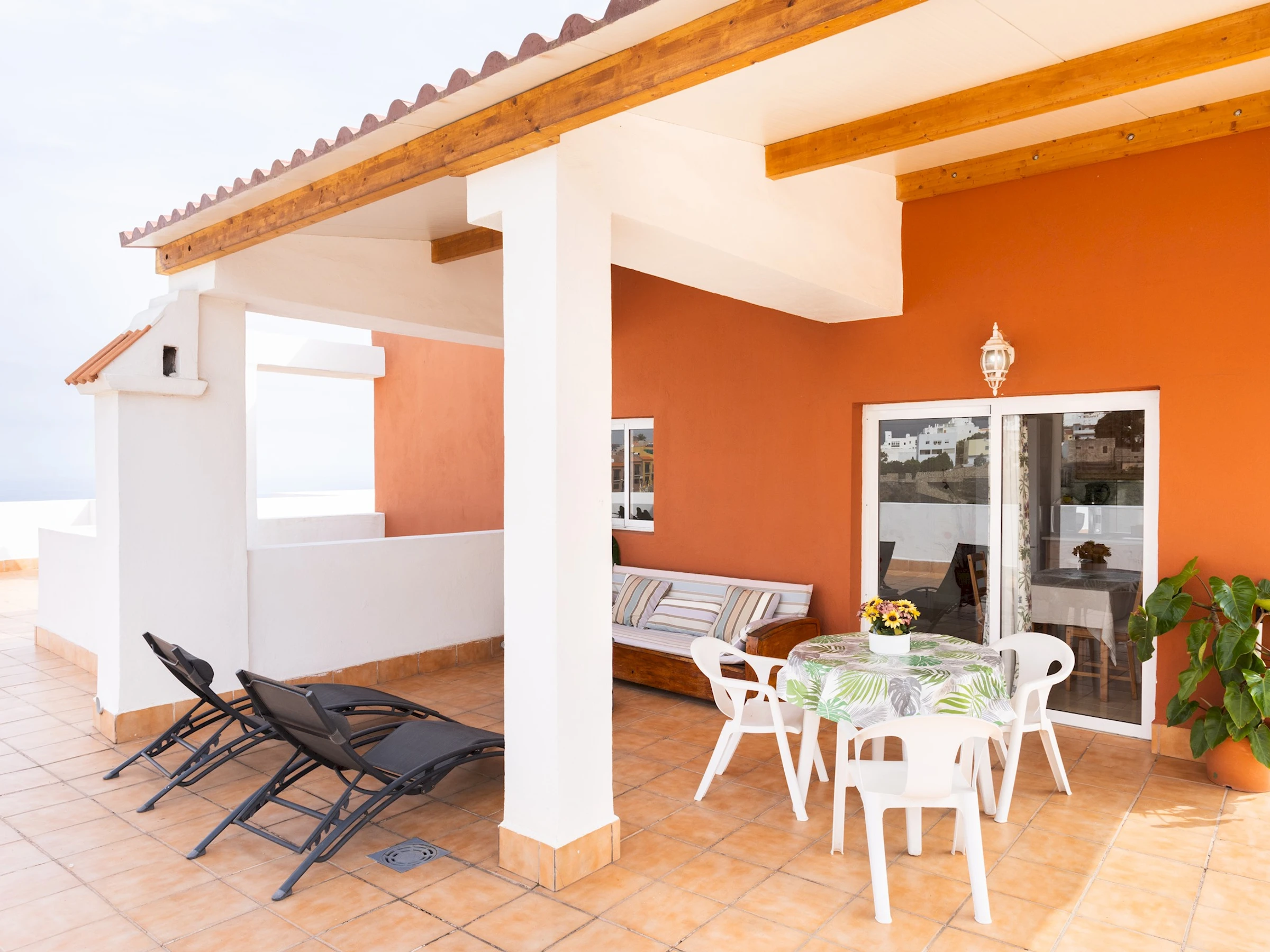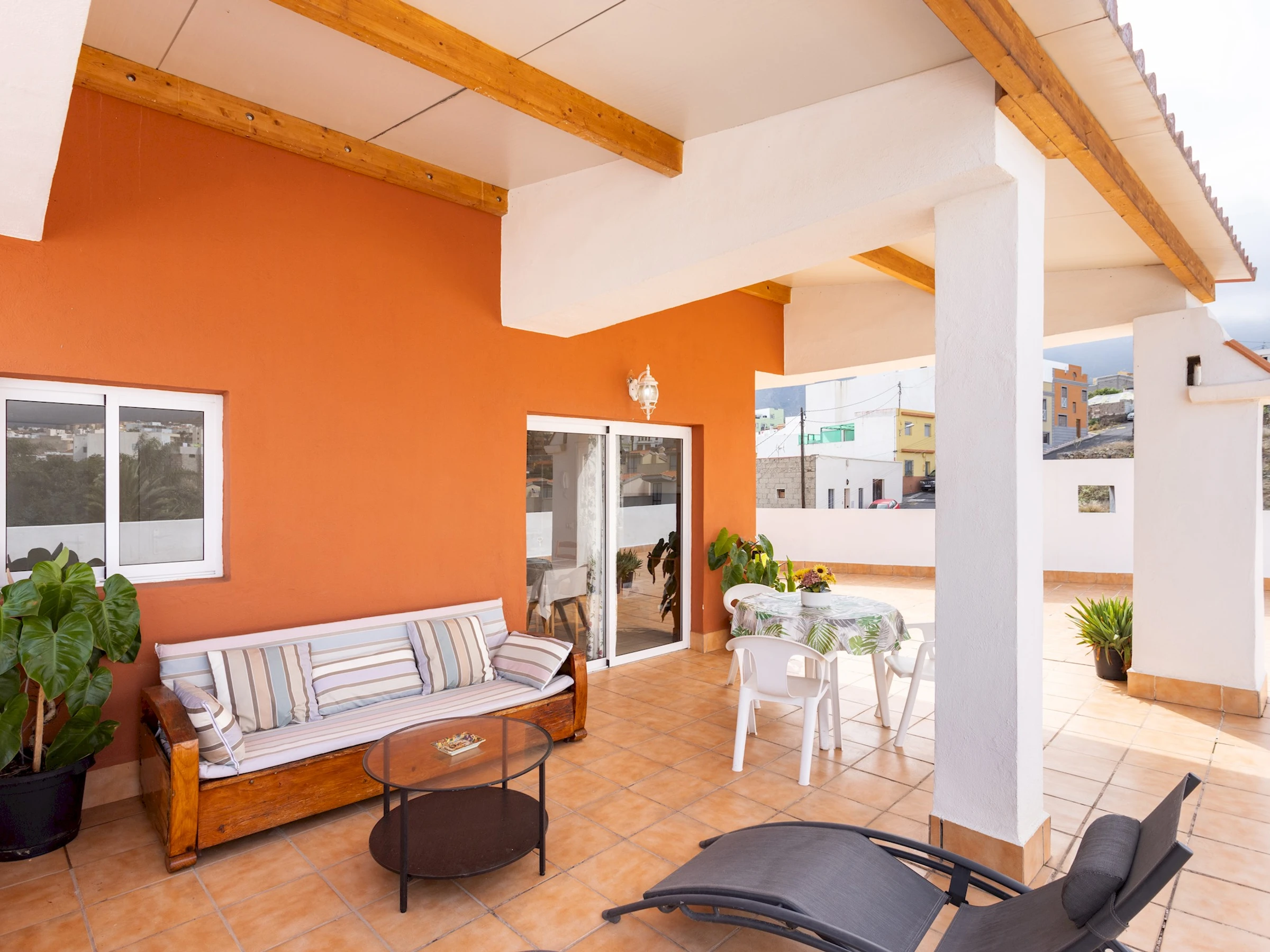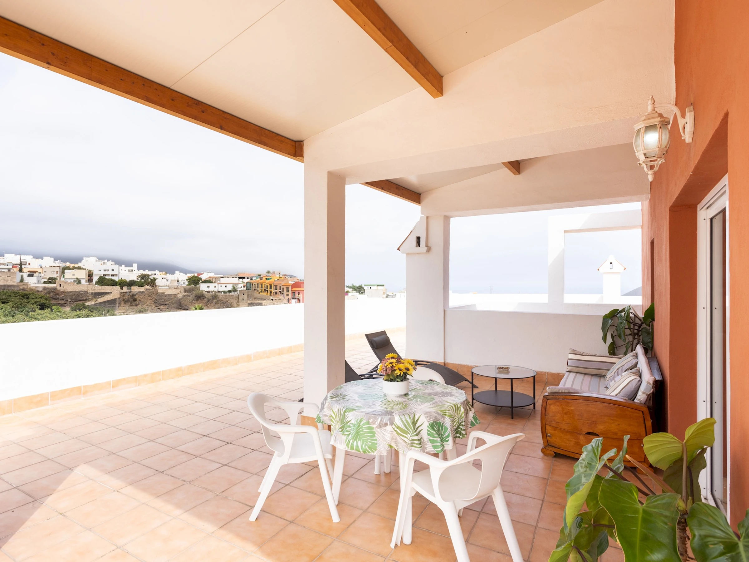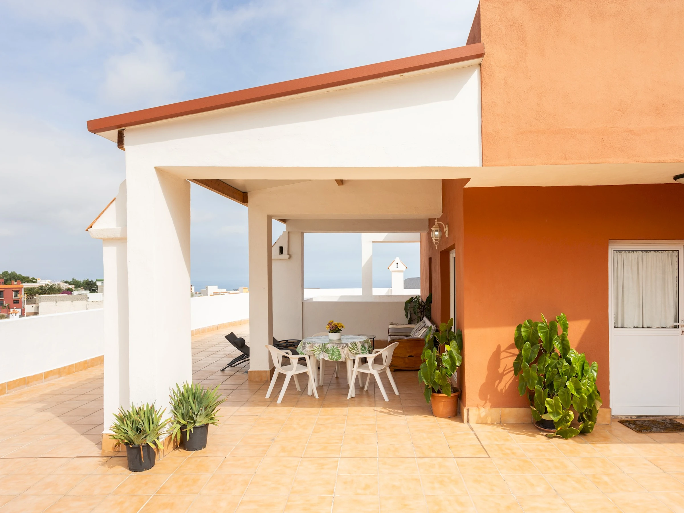 El dormitorio cuenta con una cama doble y un ambiente tranquilo, ideal para el descanso. El baño dispone de ducha y secador de pelo, además de todos los elementos básicos para el uso diario. Uno de los principales atractivos de la vivienda es su espaciosa terraza privada, equipada con mobiliario exterior, tumbonas y zona de comedor al aire libre. Es el espacio perfecto para desayunar bajo el sol, leer un libro o disfrutar de las suaves noches canarias.