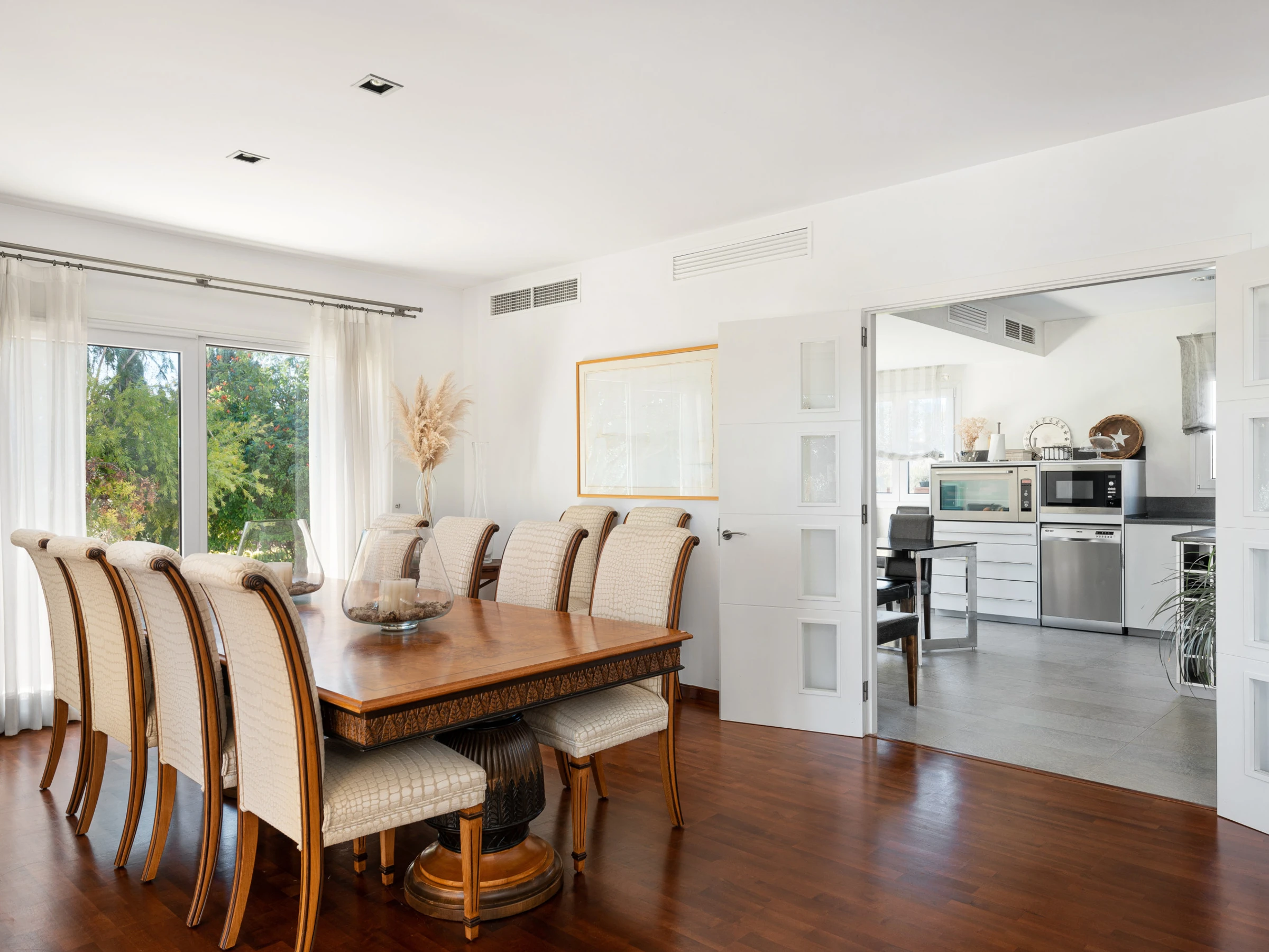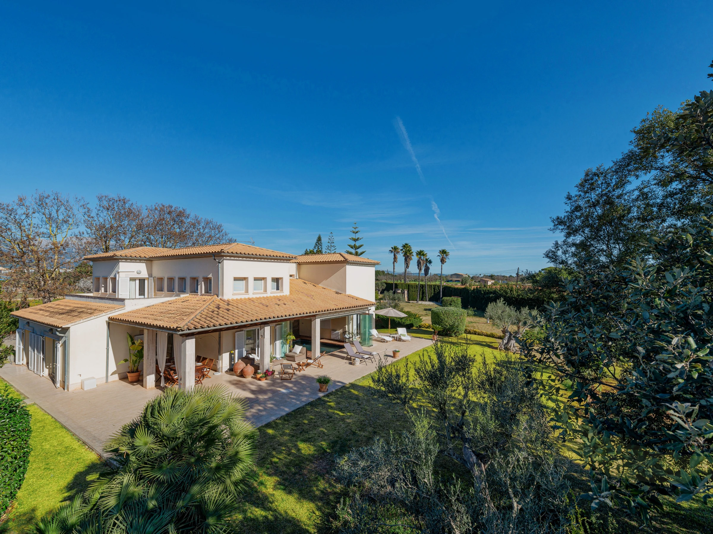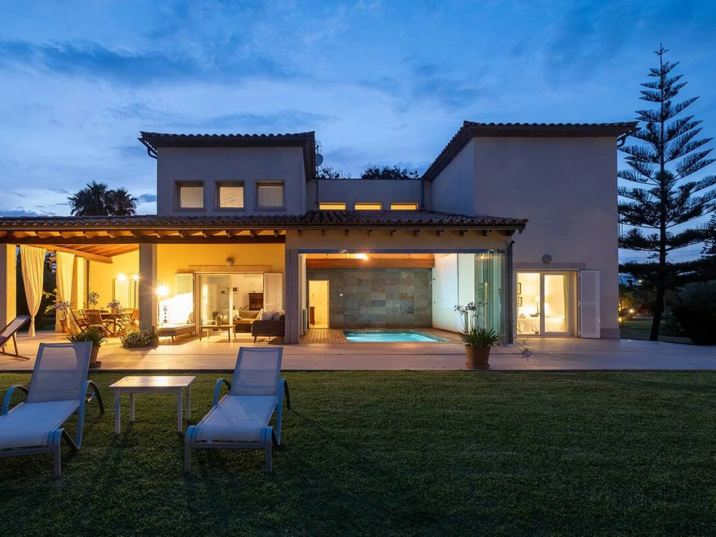 Con 300 m² distribuidos en 4 confortables habitaciones dobles y 4 baños (2 con bañera y 2 con ducha), esta villa te ofrece todo lo necesario para una estancia cómoda y relajante. La cocina, completamente equipada y con una moderna isla central, se abre a un acogedor salón y comedor pensados para compartir buenos momentos.