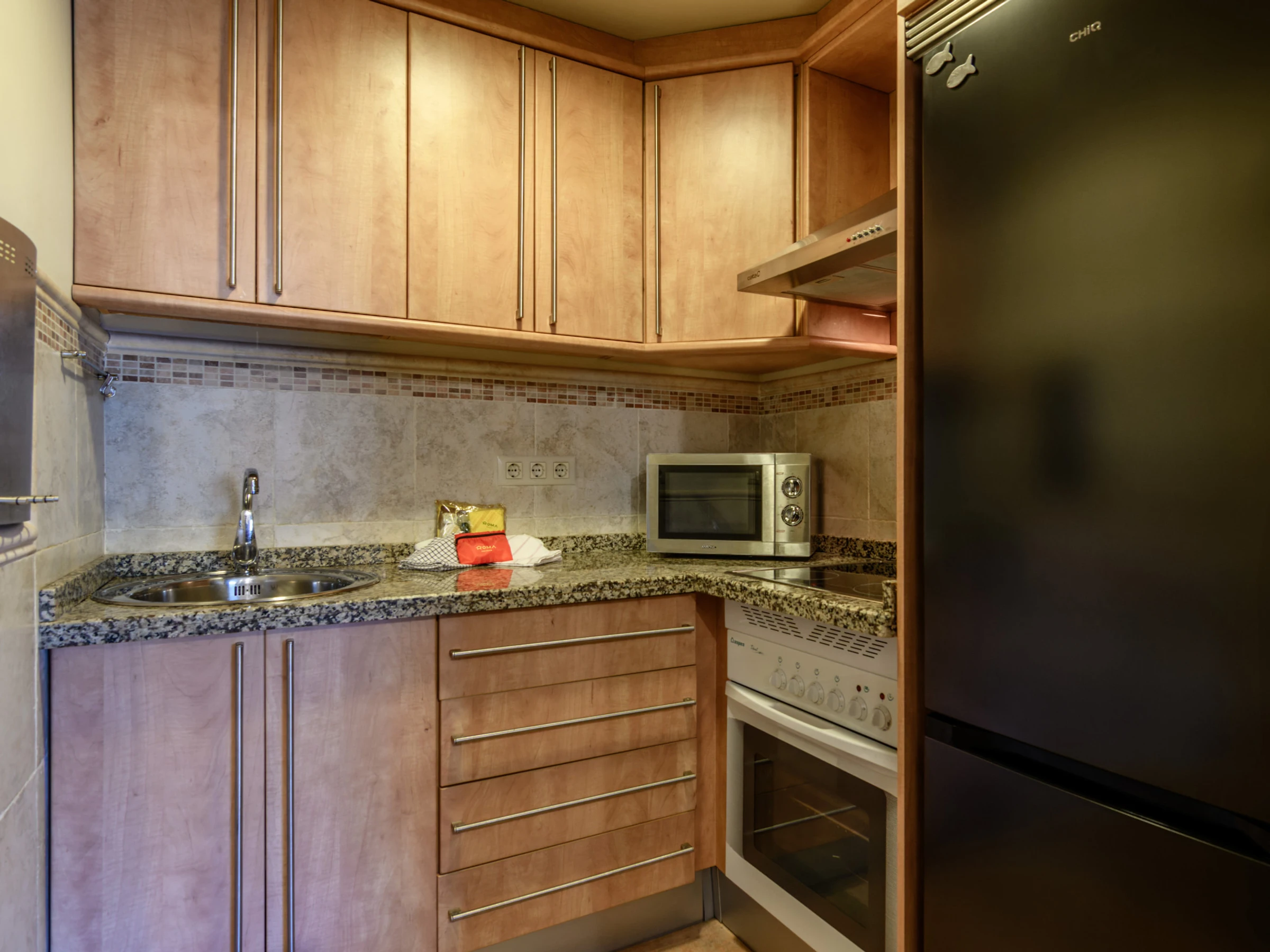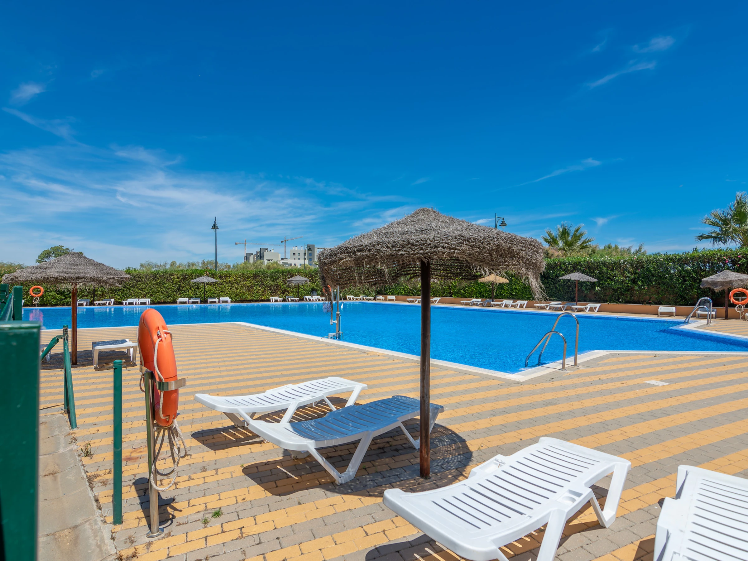 Cuenta con una terraza privada de 25 m², una piscina comunitaria y una infantil, una parcela vallada, un ascensor, una zona infantil, una pista de padel, una cocina independiente, una lavadora y un aire acondicionado en todo el alojamiento. Además, cuenta con un parking cubierto en el mismo edificio y acceso a Internet Wi-Fi. La cocina está totalmente equipada con nevera, microondas, horno, congelador, vajilla y utensilios de cocina. Este es el lugar perfecto para disfrutar de unas vacaciones relajantes junto al mar.
