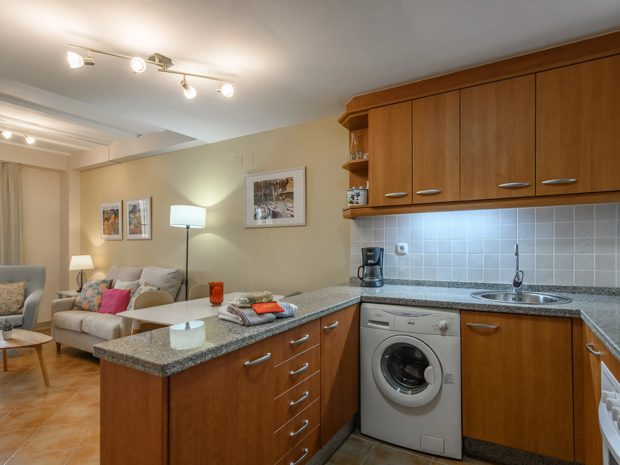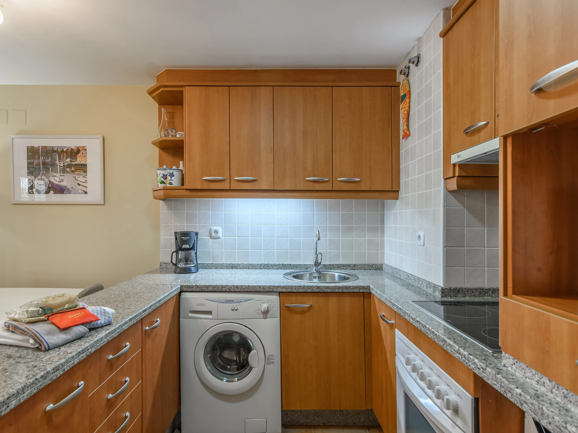 La cocina americana de vitrocerámica, está equipada con nevera, microondas, horno, congelador, lavadora, vajilla/cubertería, utensilios/cocina, cafetera, tostadora, hervidor de agua y exprimidor.