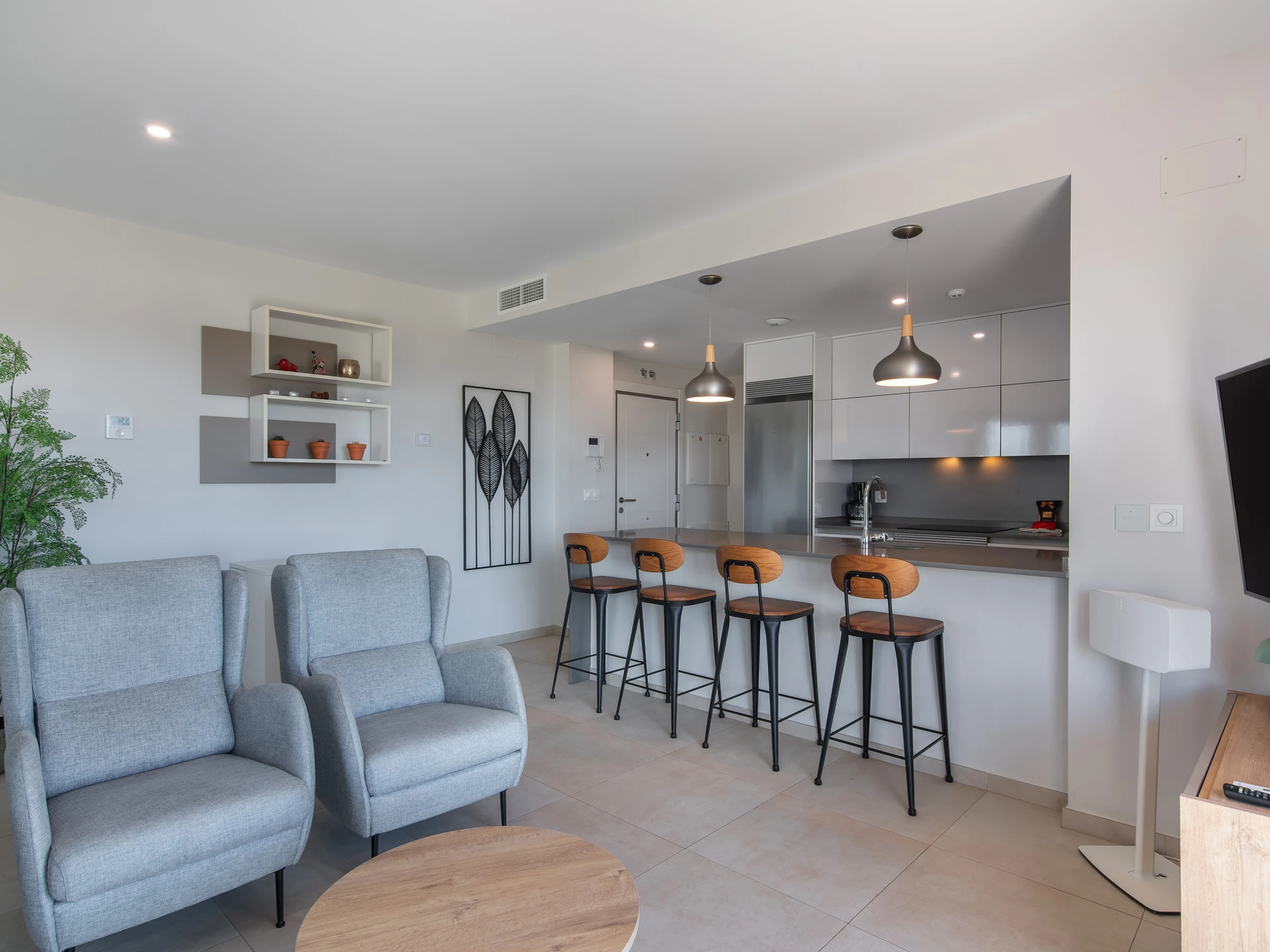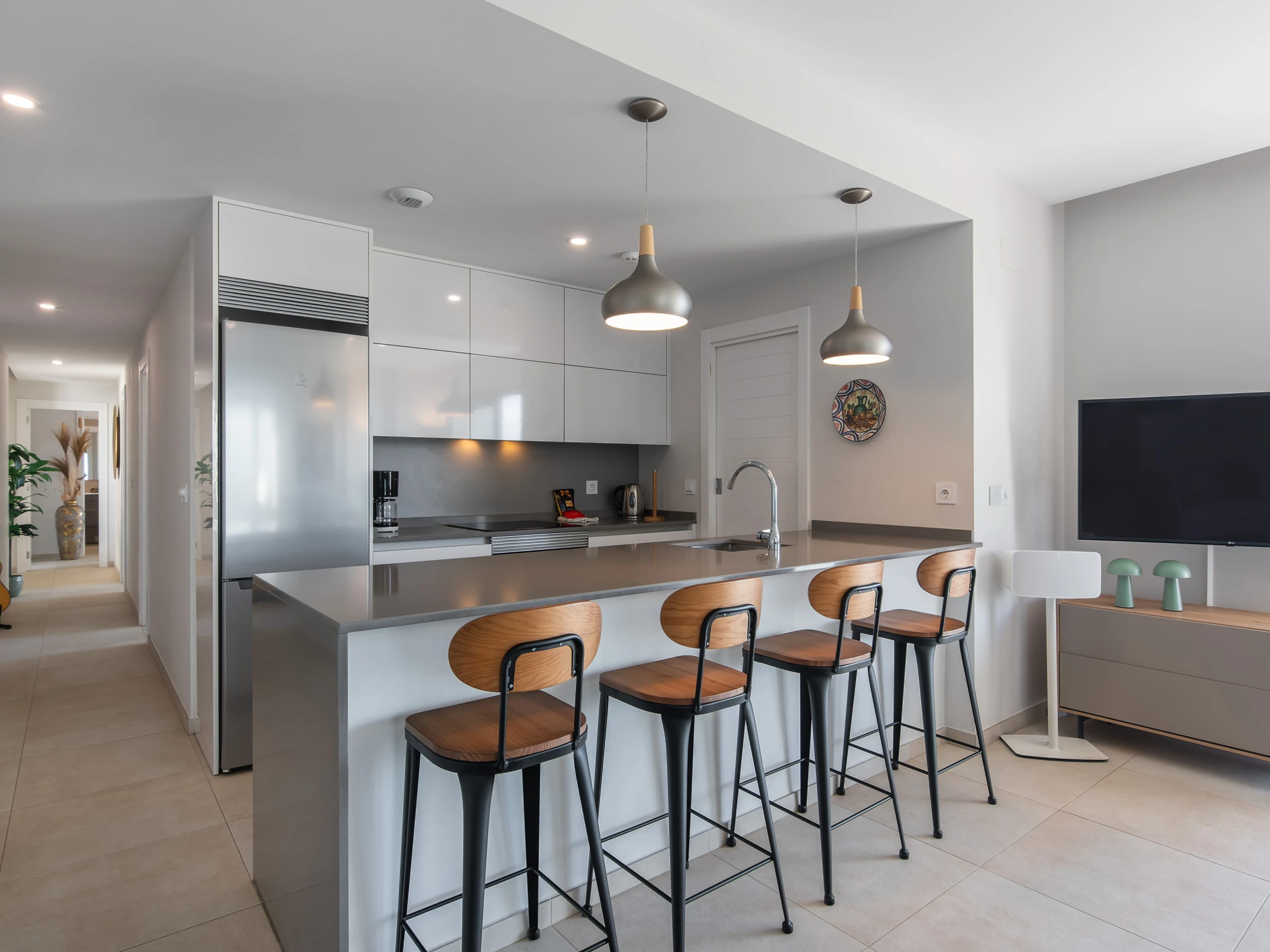 La cocina americana, de vitrocerámica, está equipada con nevera, microondas, horno, congelador, lavadora, lavavajillas, vajilla/cubertería, utensilios/cocina, cafetera, tostadora y exprimidor.