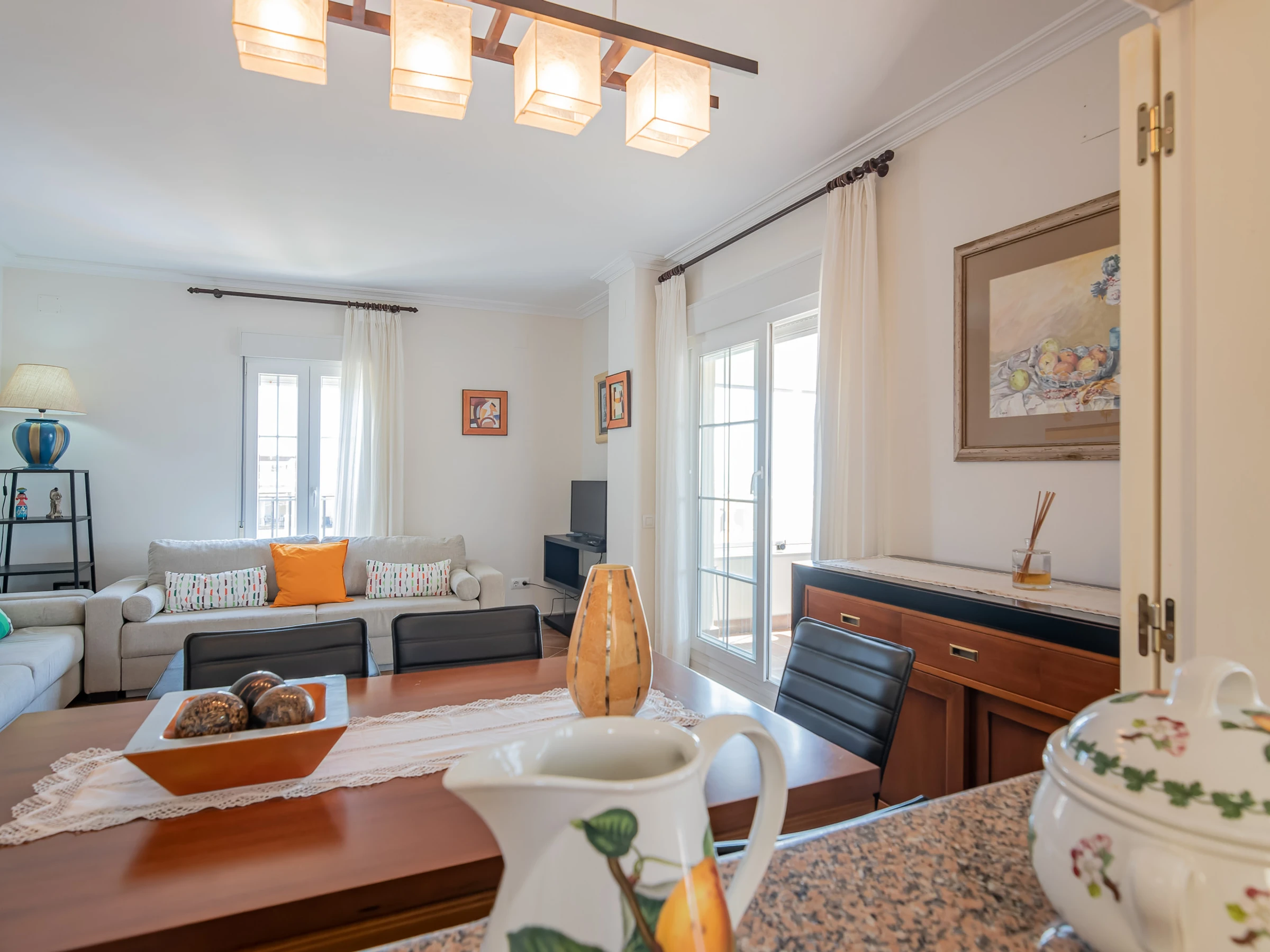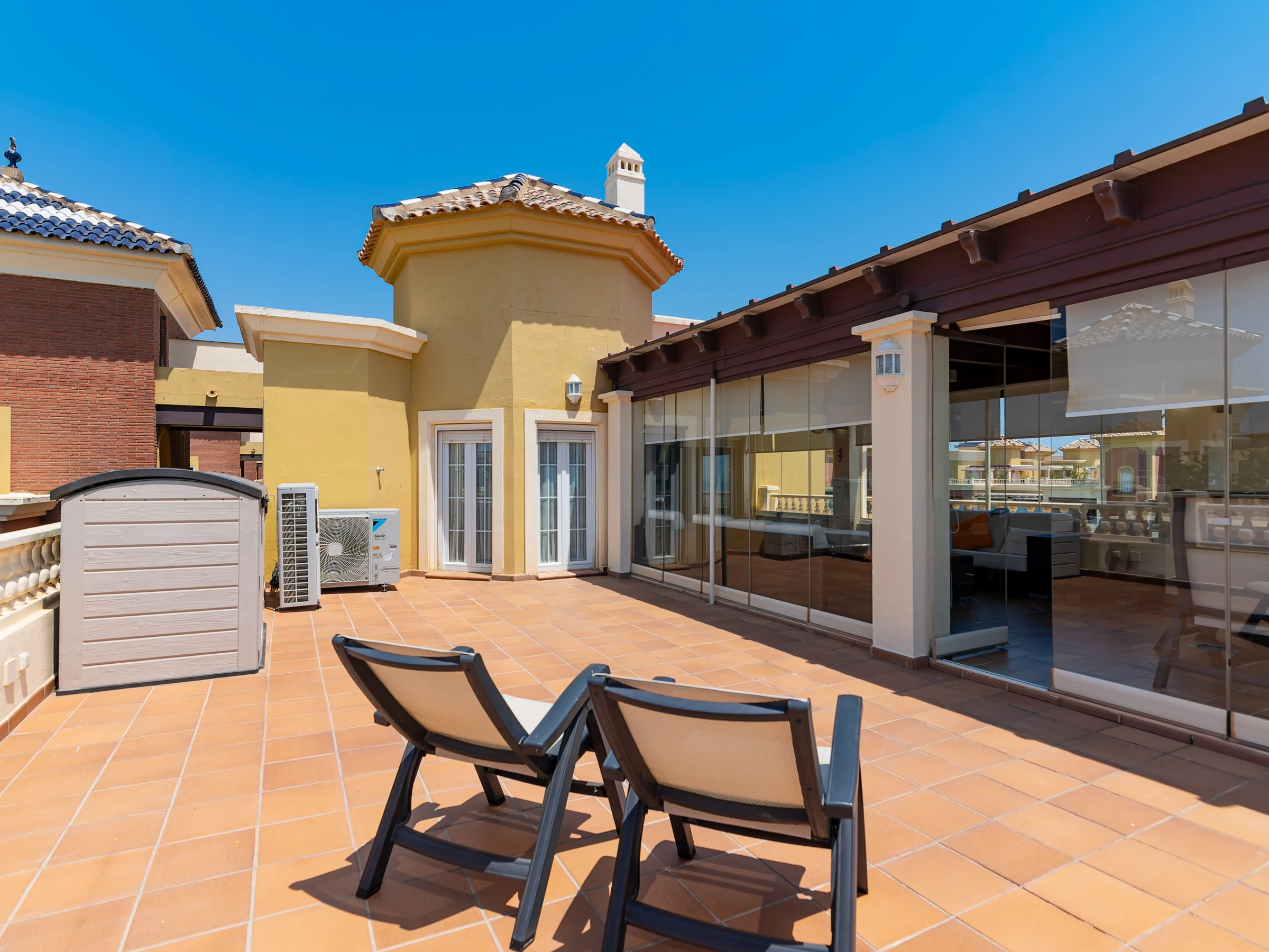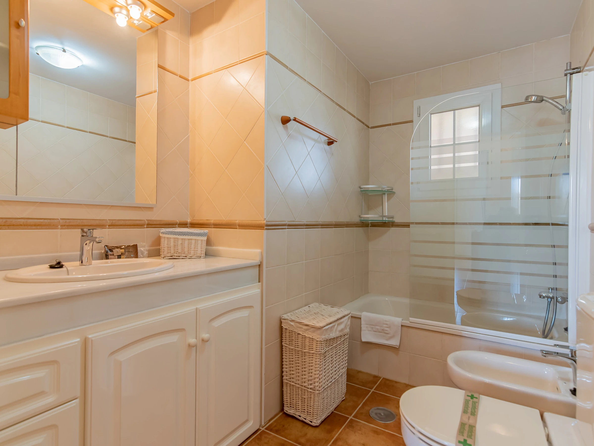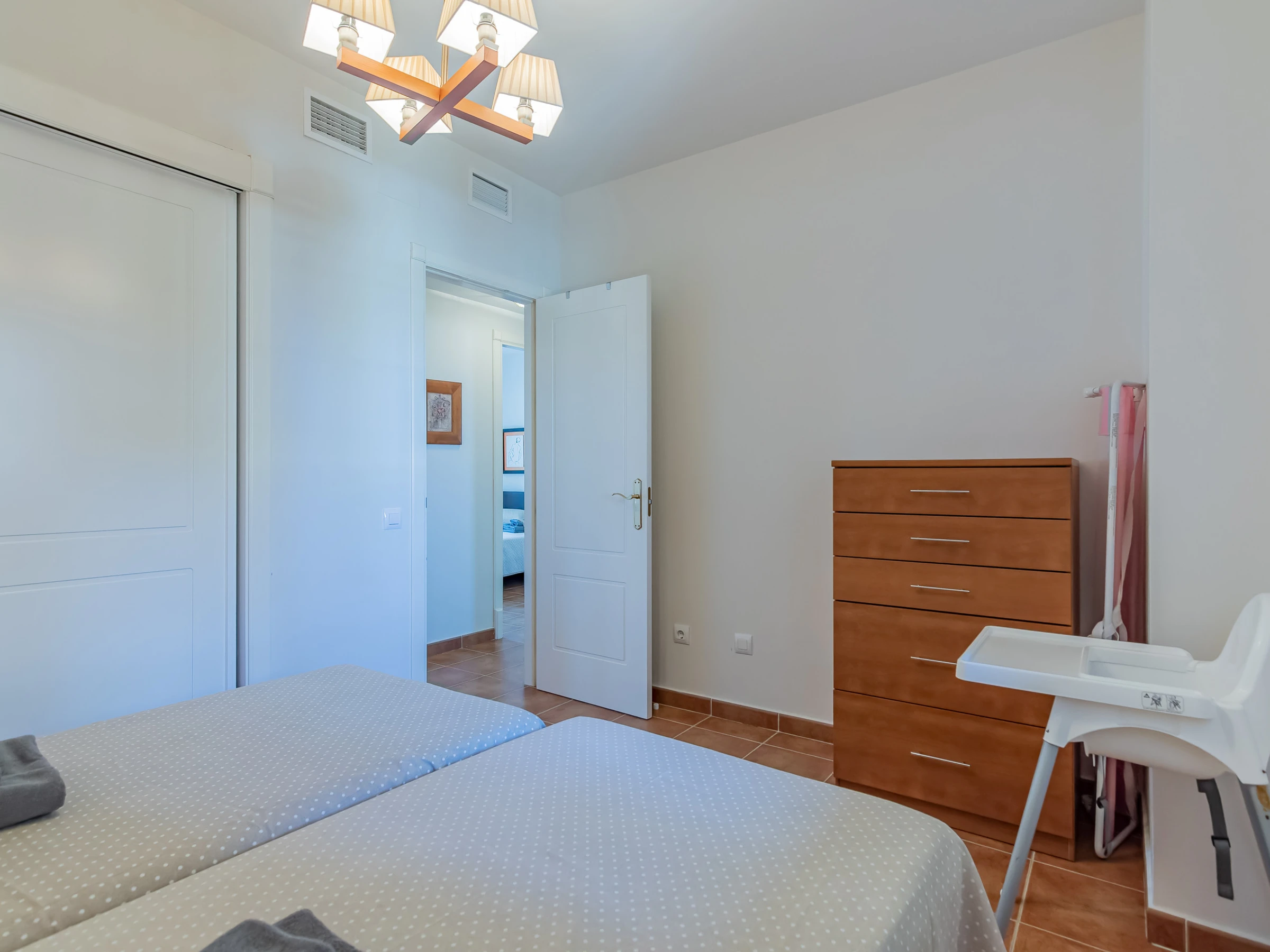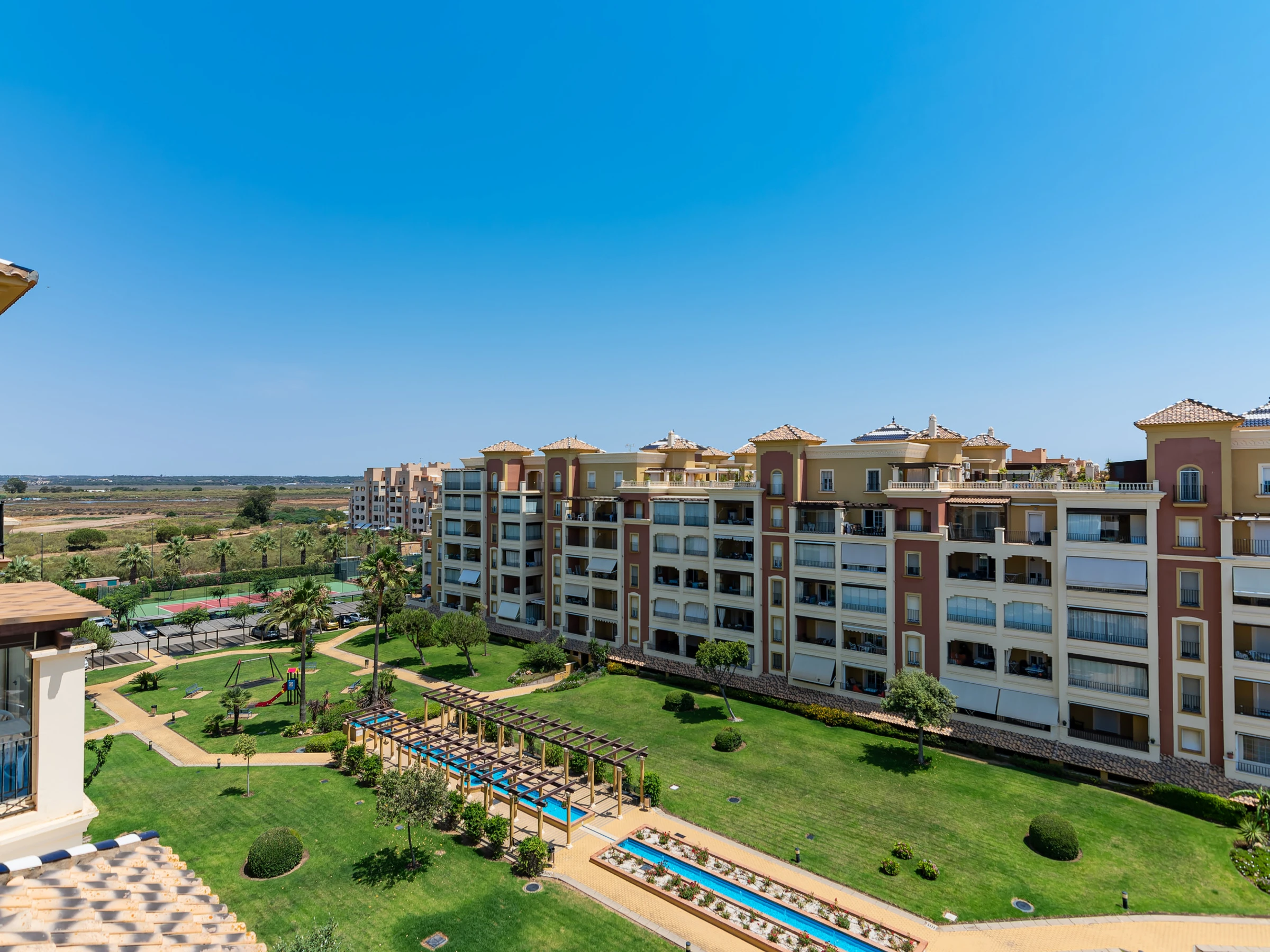 Dispone de ascensor, jardín, parcela vallada, 96 m² de terraza, plancha, acceso internet (wifi), secador, zona infantil, pista de tenis, pista de padel, calefacción bomba de calor, aire acondicionado en todo el alojamiento, piscina comunitaria+infantil, parking cubierto en mismo edificio, 1 Televisor.
