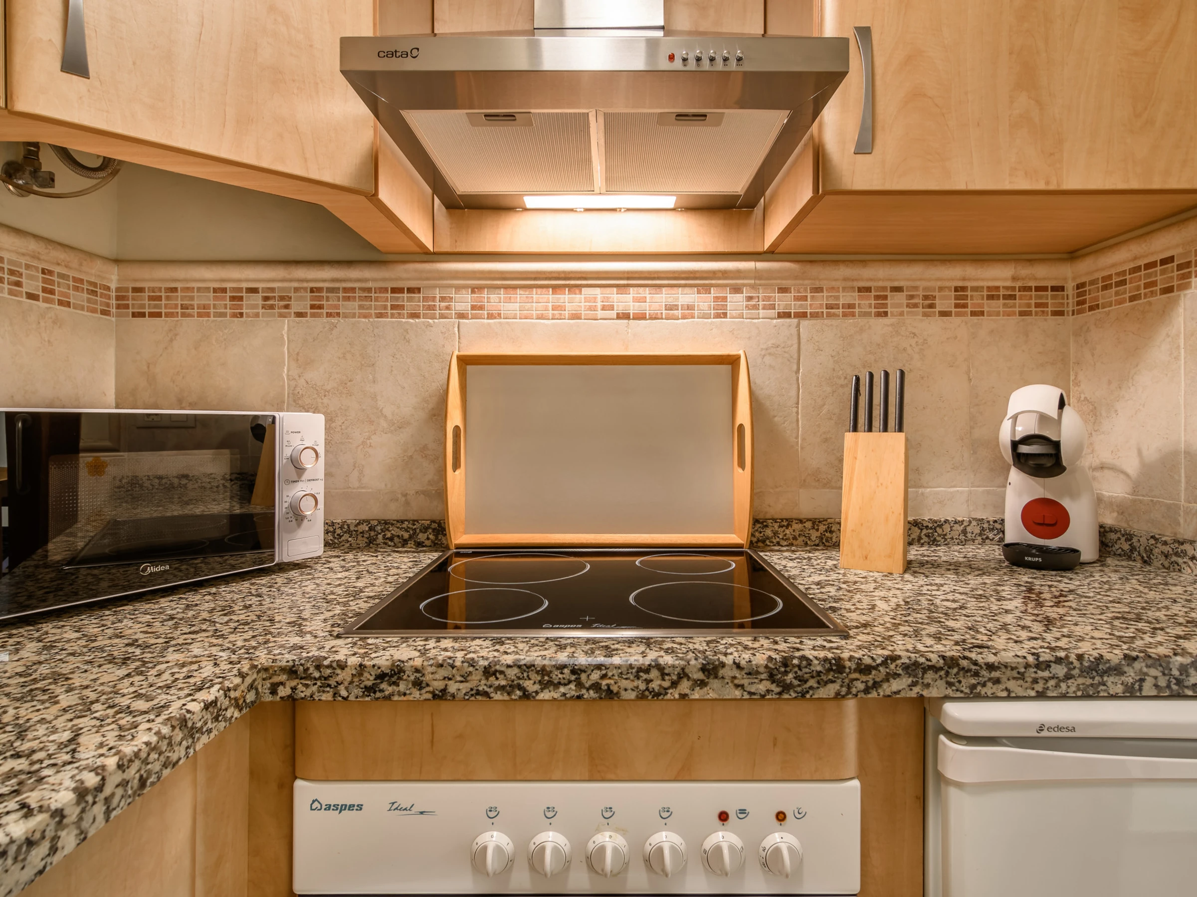 El apartamento cuenta con una habitación principal con una cama doble confortable y un sofá adicional, permitiendo alojar hasta 3 personas. Dispone de aire acondicionado y calefacción por bomba de calor para garantizar tu comodidad en cualquier época del año. La cocina independiente está totalmente equipada con electrodomésticos modernos como lavadora, lavavajillas, horno, máquina de café y todos los utensilios necesarios para preparar deliciosas comidas.