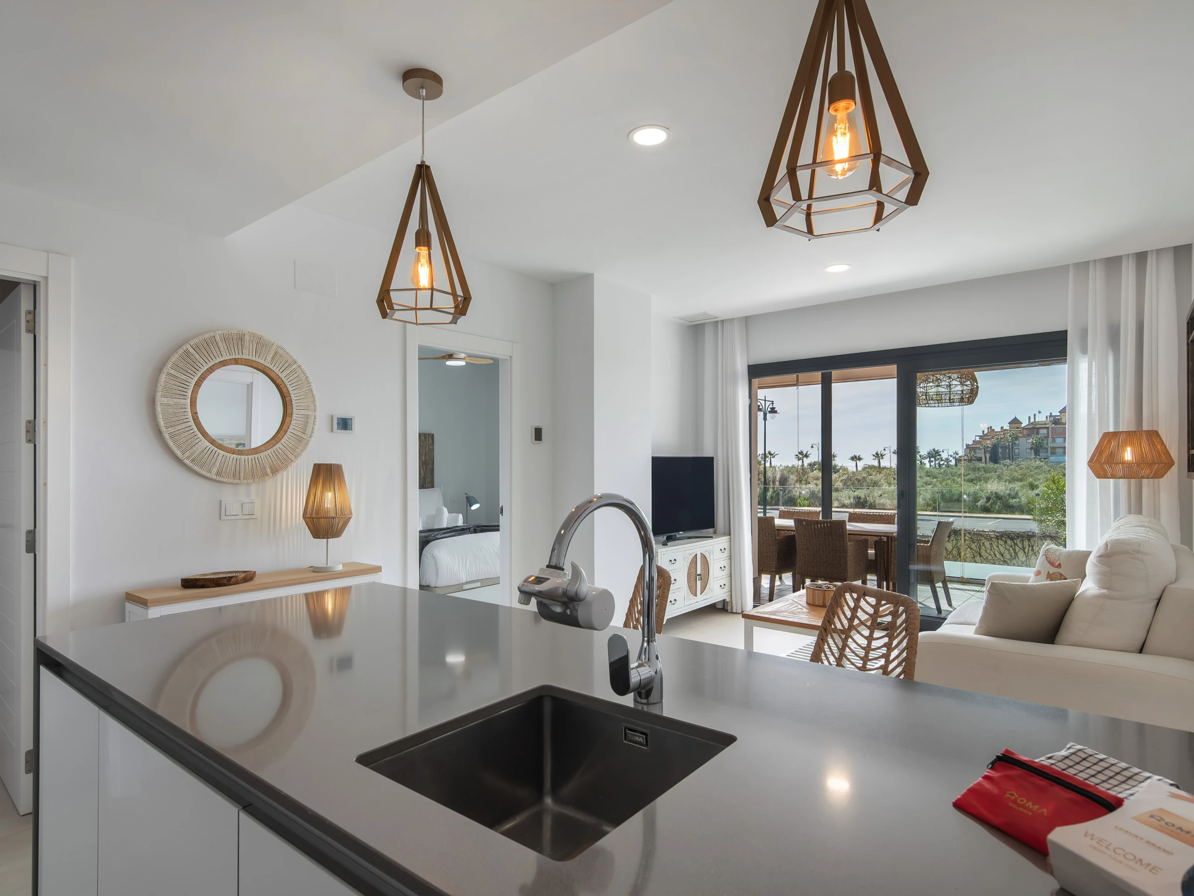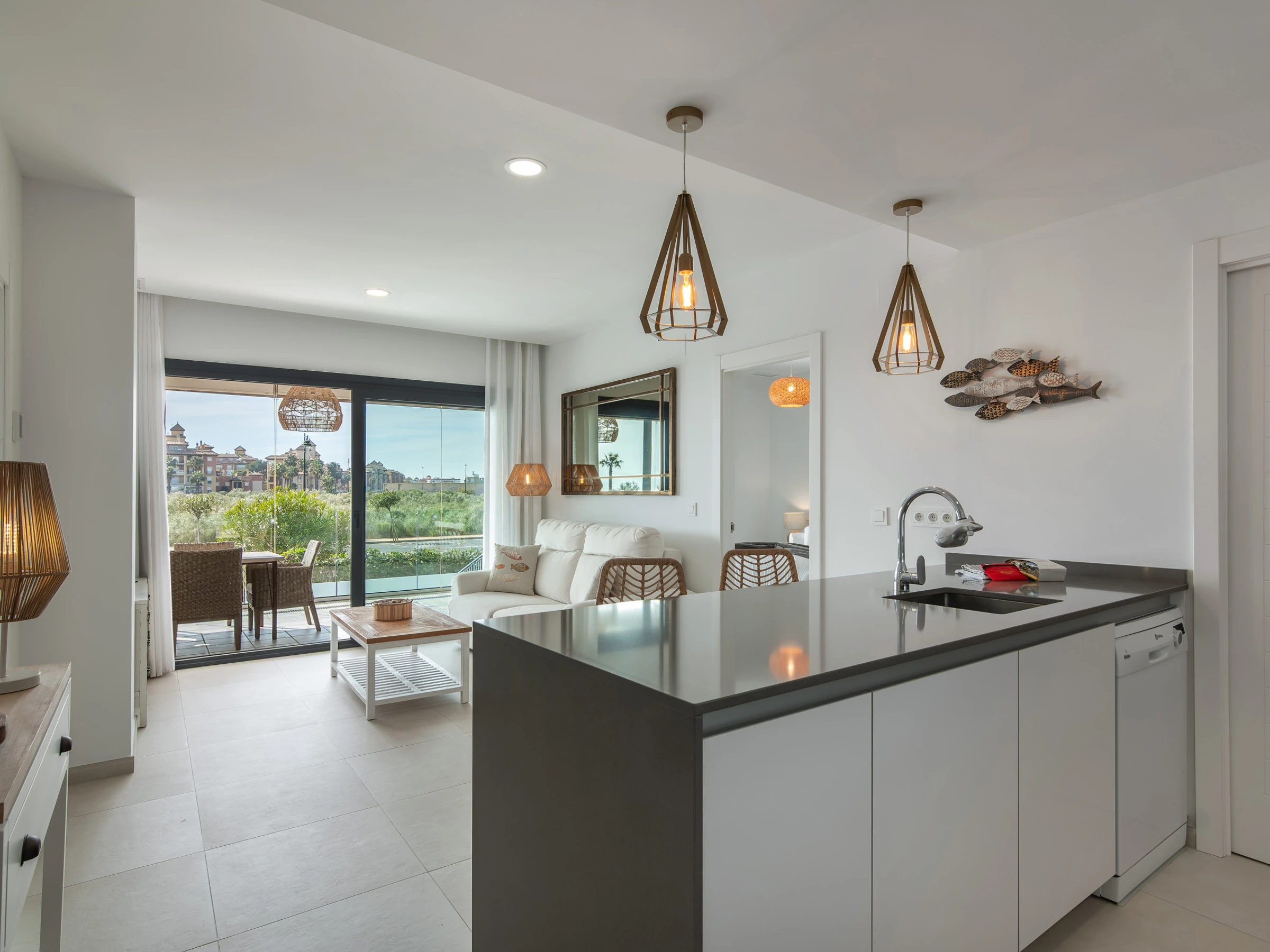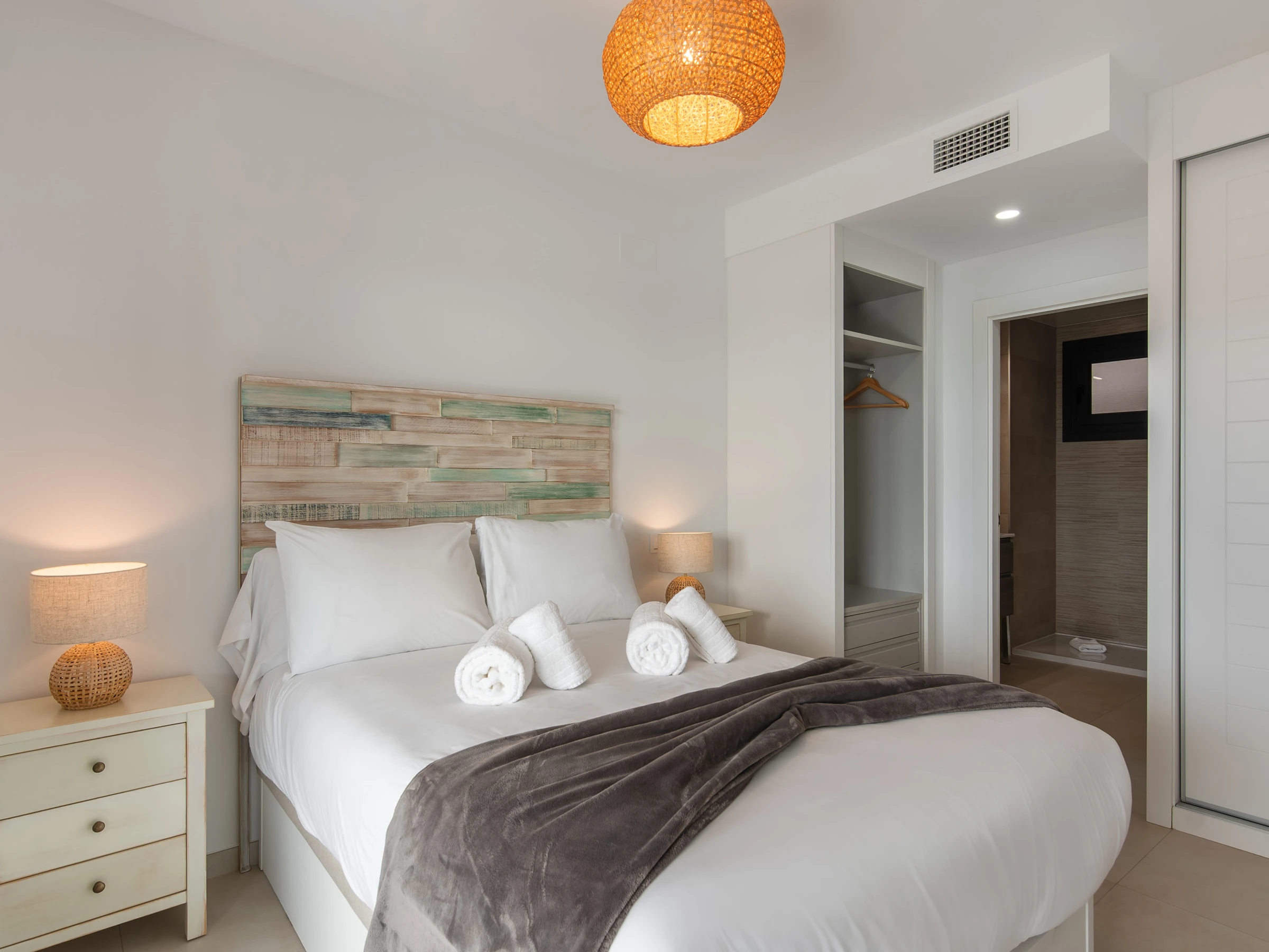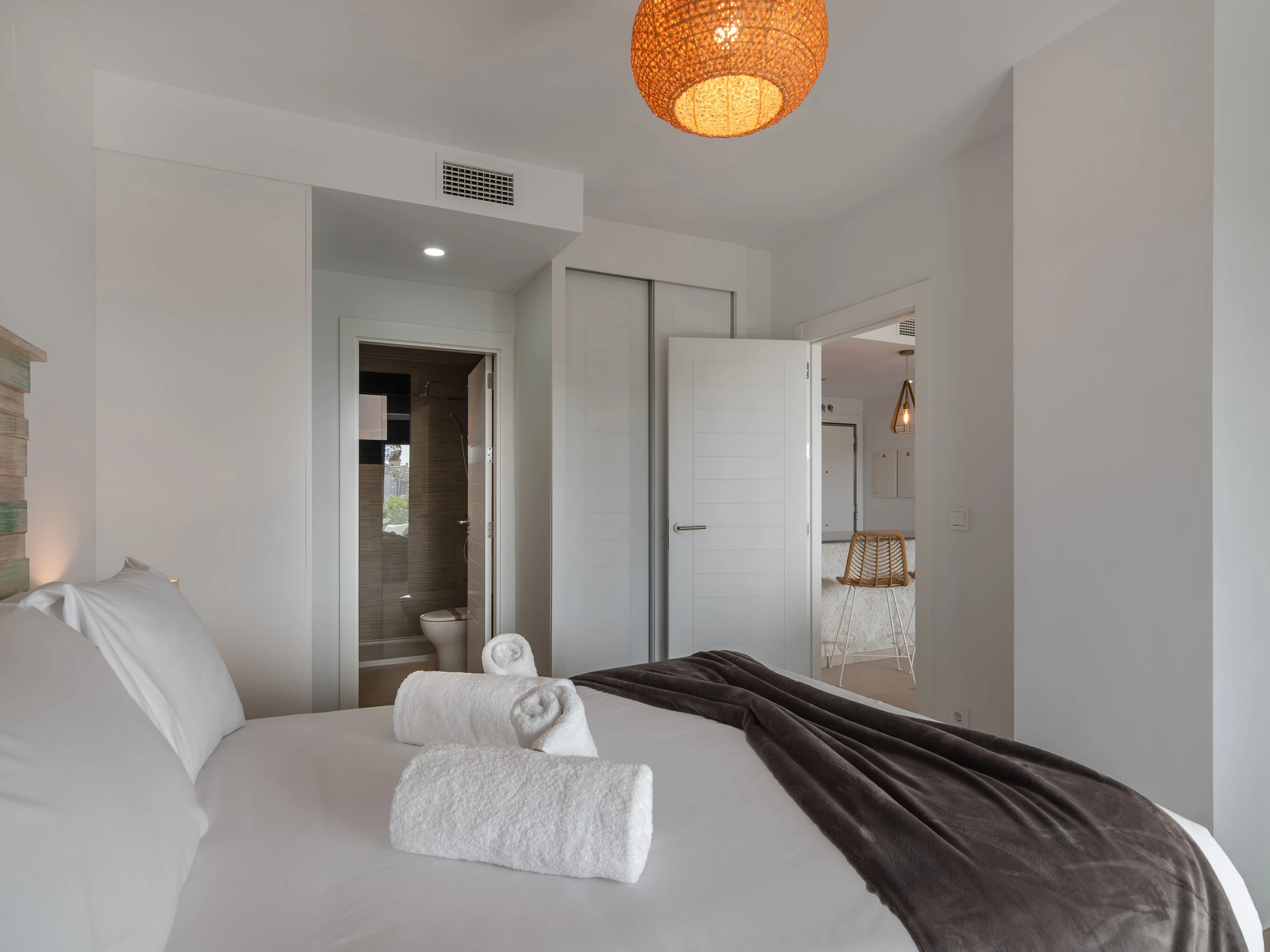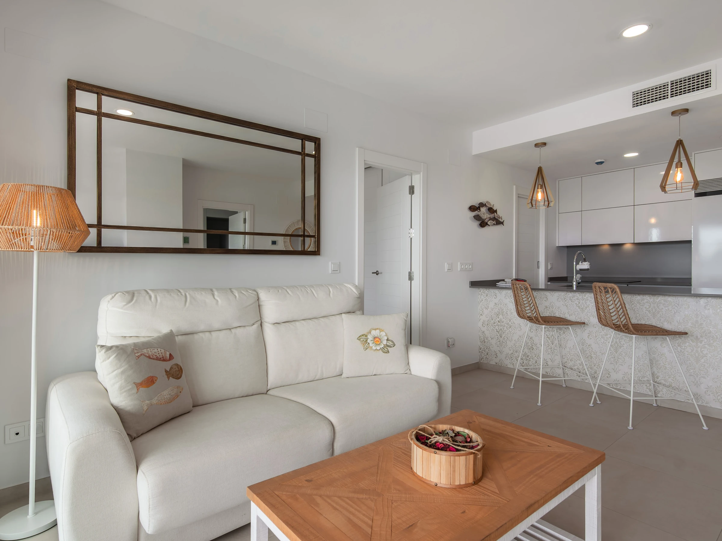 El apartamento cuenta con dos dormitorios con camas dobles, ideal para 4 personas, y ofrece todas las comodidades para hacer tu estancia inolvidable. Dispone de aire acondicionado y calefacción por bomba de calor para garantizar tu confort en cualquier época del año. La cocina americana está completamente equipada con electrodomésticos de última generación, incluyendo nevera, lavadora, lavavajillas, horno, microondas y máquina de café.
