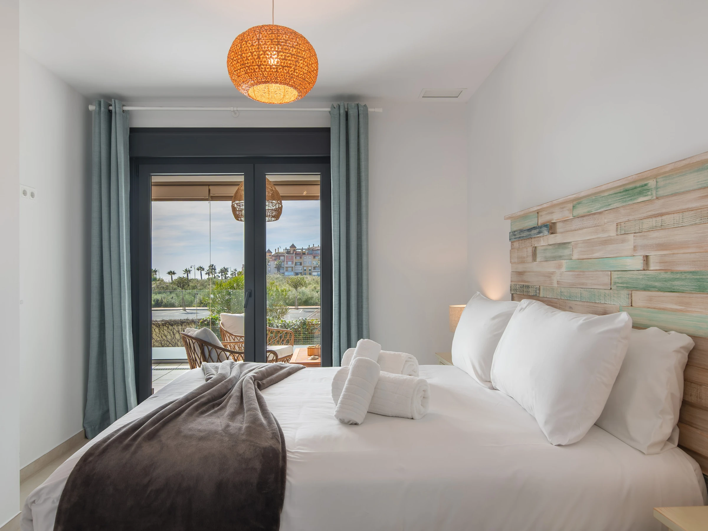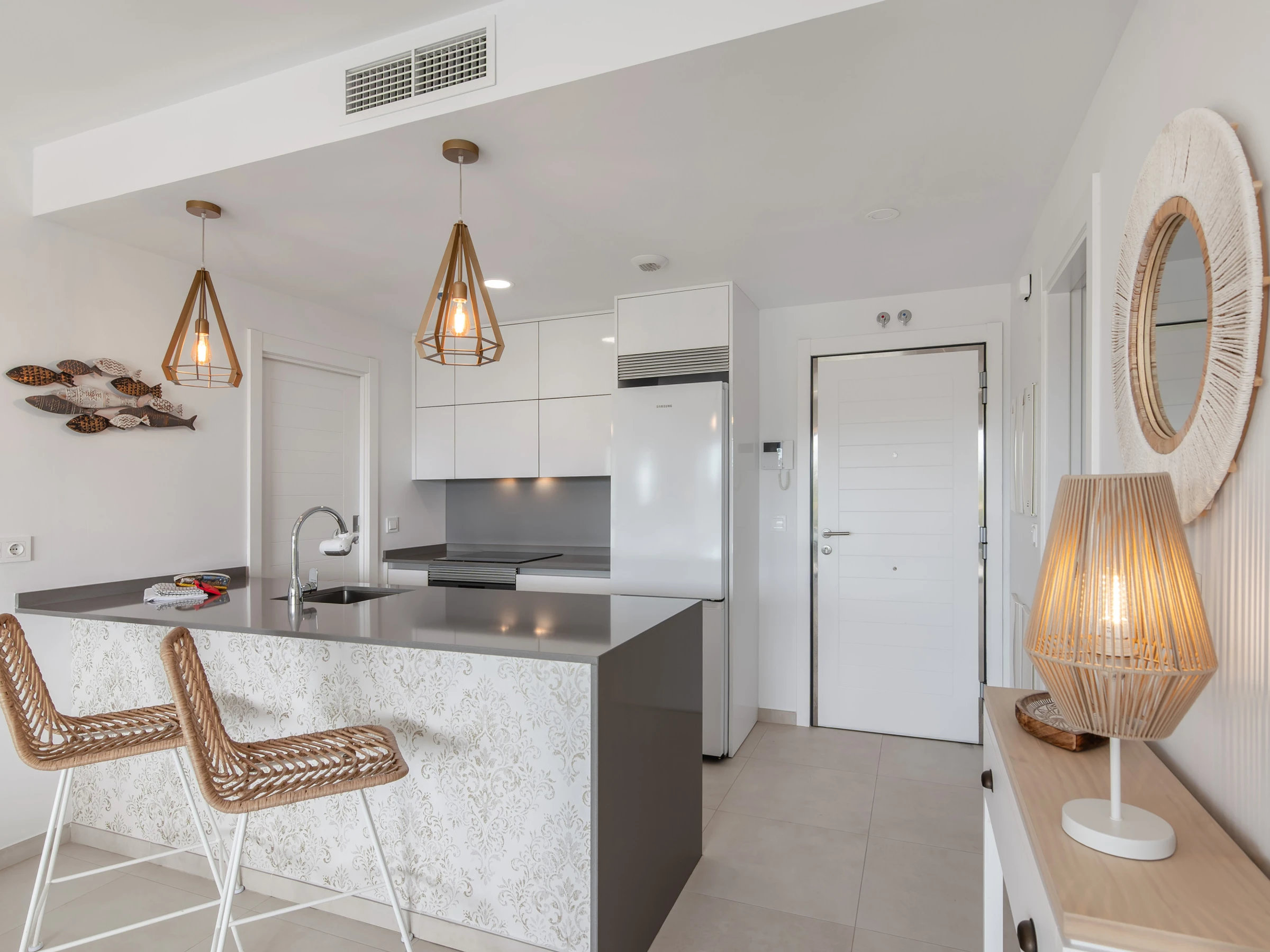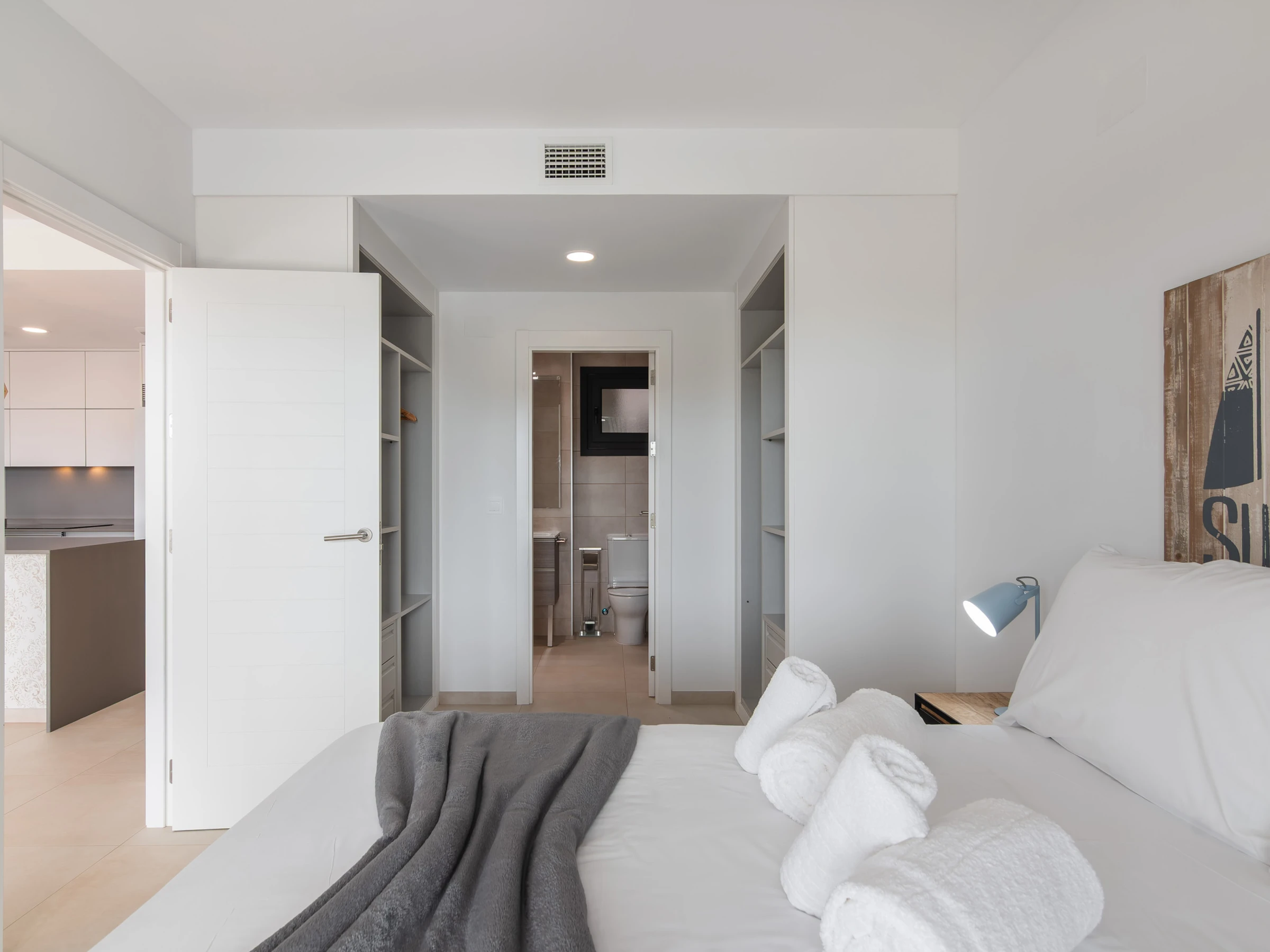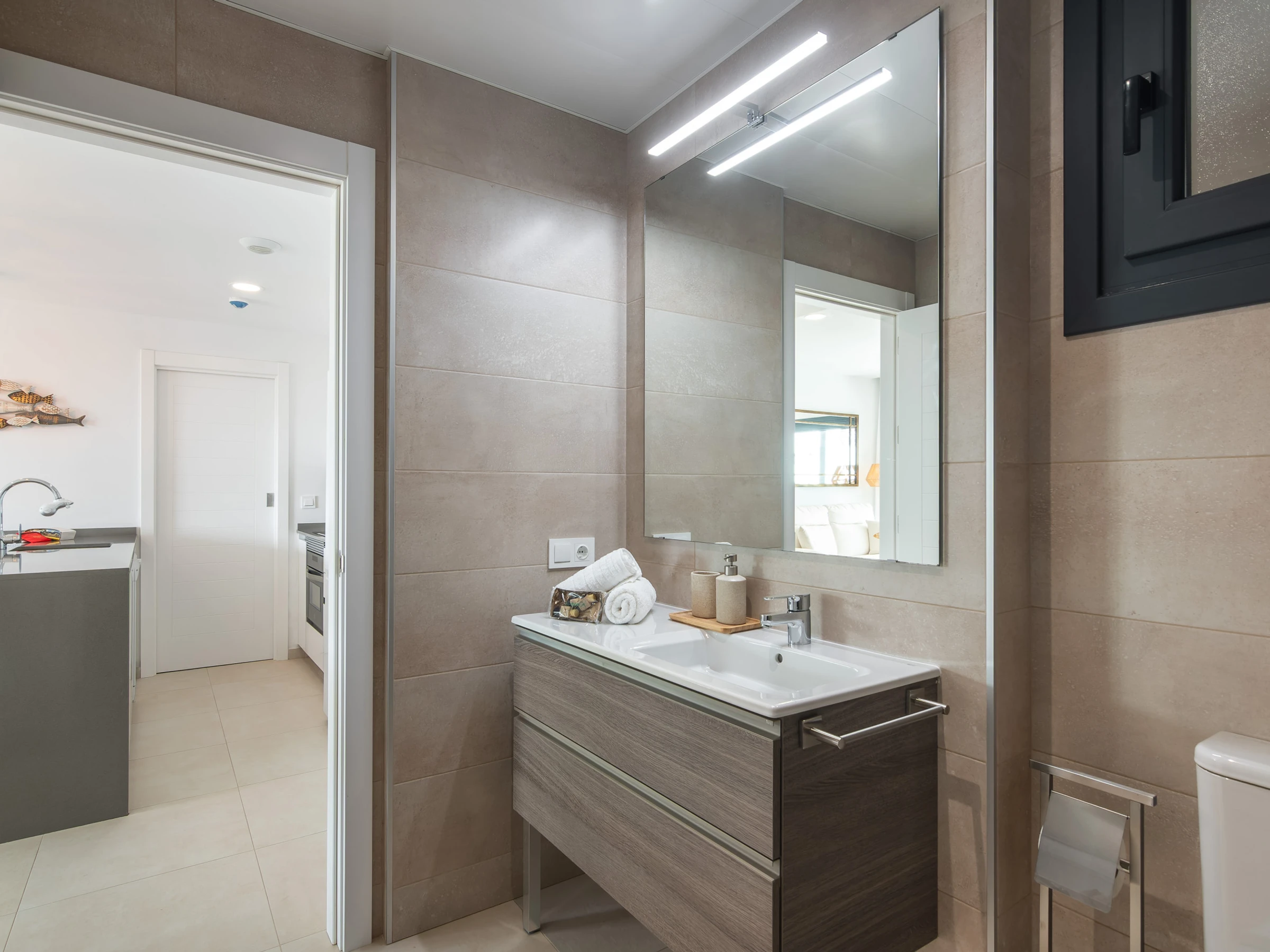 El apartamento cuenta con dos dormitorios con camas dobles, ideal para 4 personas, y ofrece todas las comodidades para hacer tu estancia inolvidable. Dispone de aire acondicionado y calefacción por bomba de calor para garantizar tu confort en cualquier época del año. La cocina americana está completamente equipada con electrodomésticos de última generación, incluyendo nevera, lavadora, lavavajillas, horno, microondas y máquina de café.
