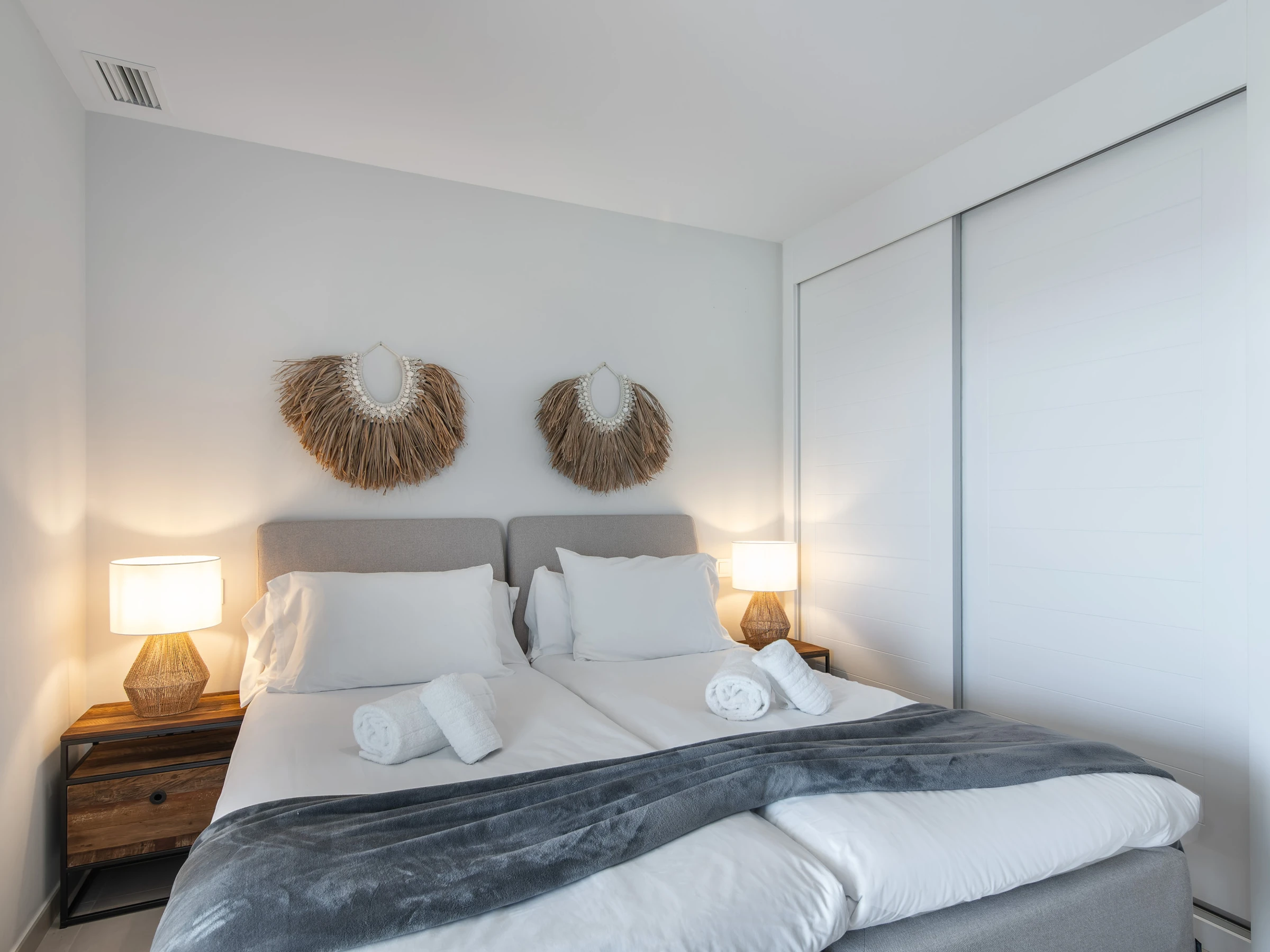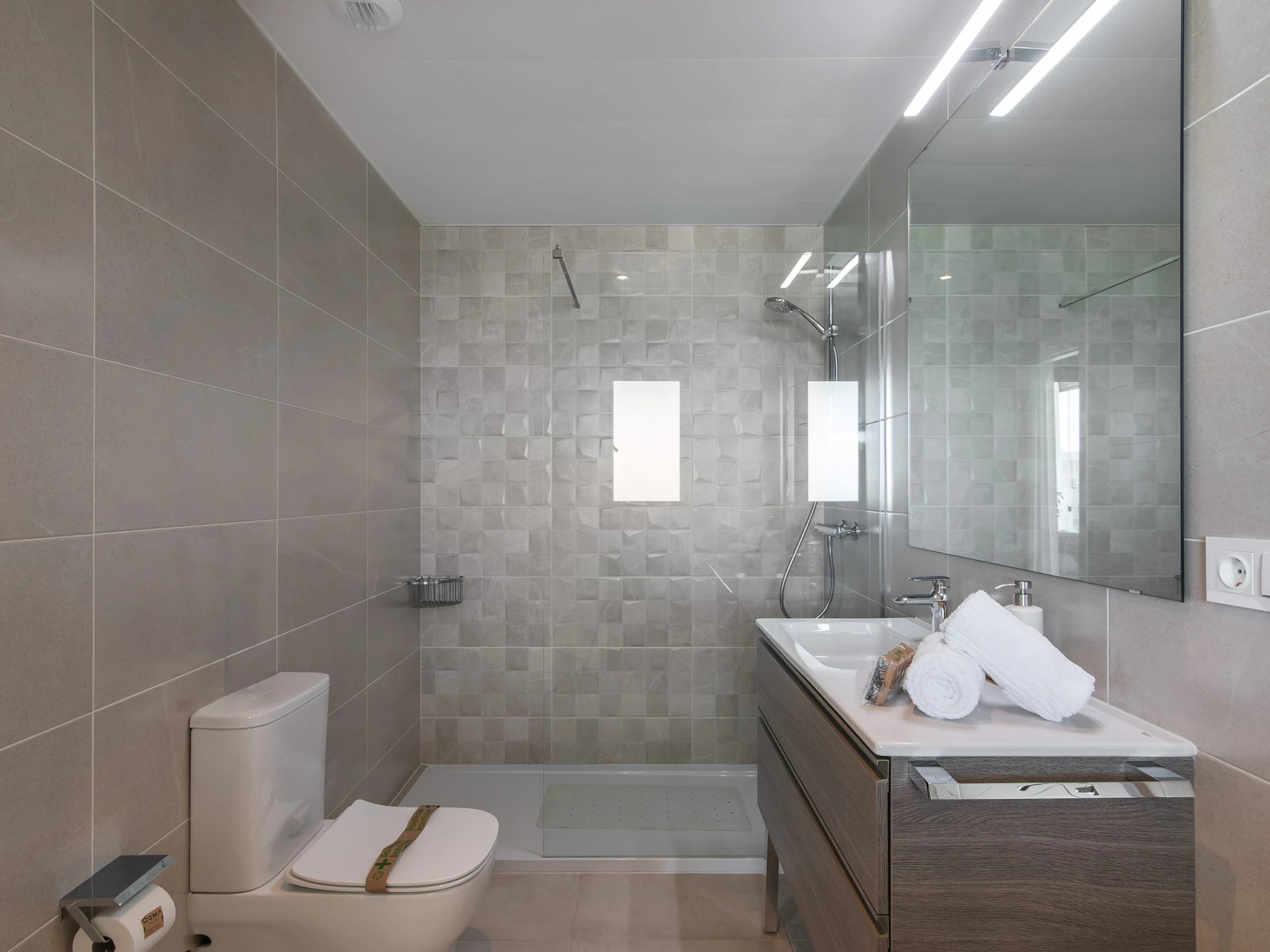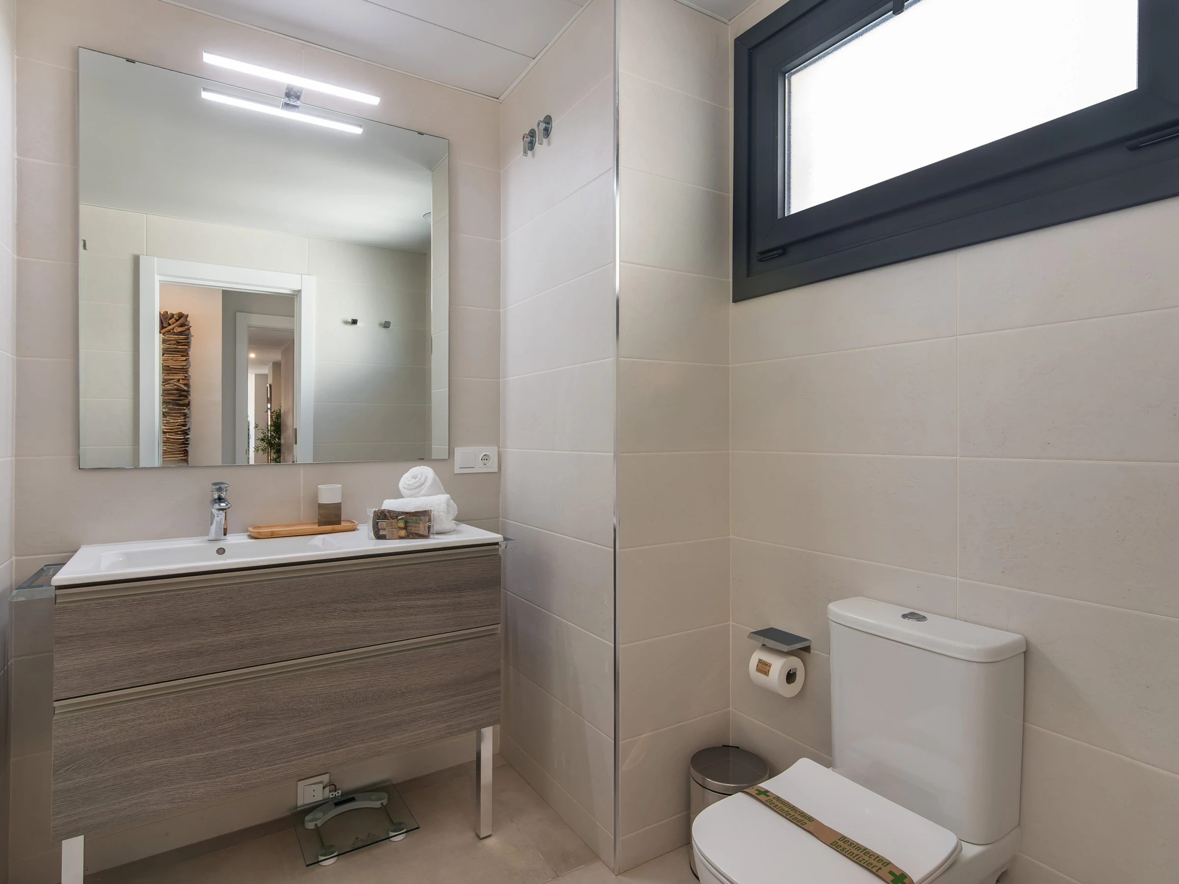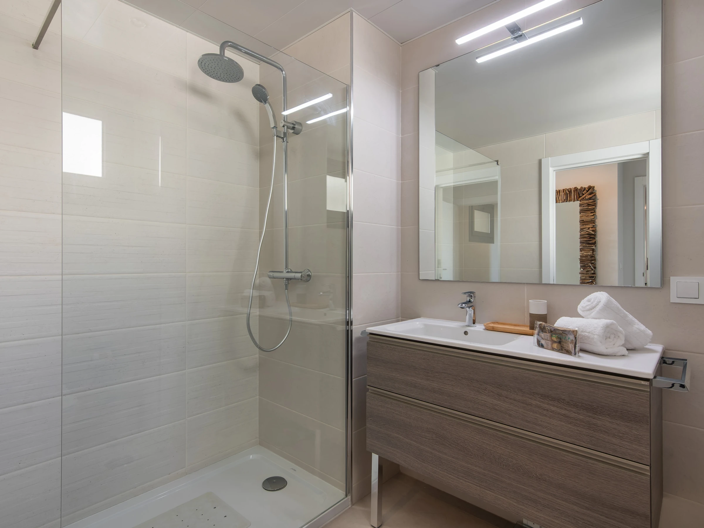 El apartamento cuenta con 3 dormitorios que pueden alojar hasta 6 personas cómodamente, con una distribución de 1 cama doble y 4 camas individuales. Dispone de 2 baños completos con ducha, ideales para familias que buscan comodidad y privacidad.