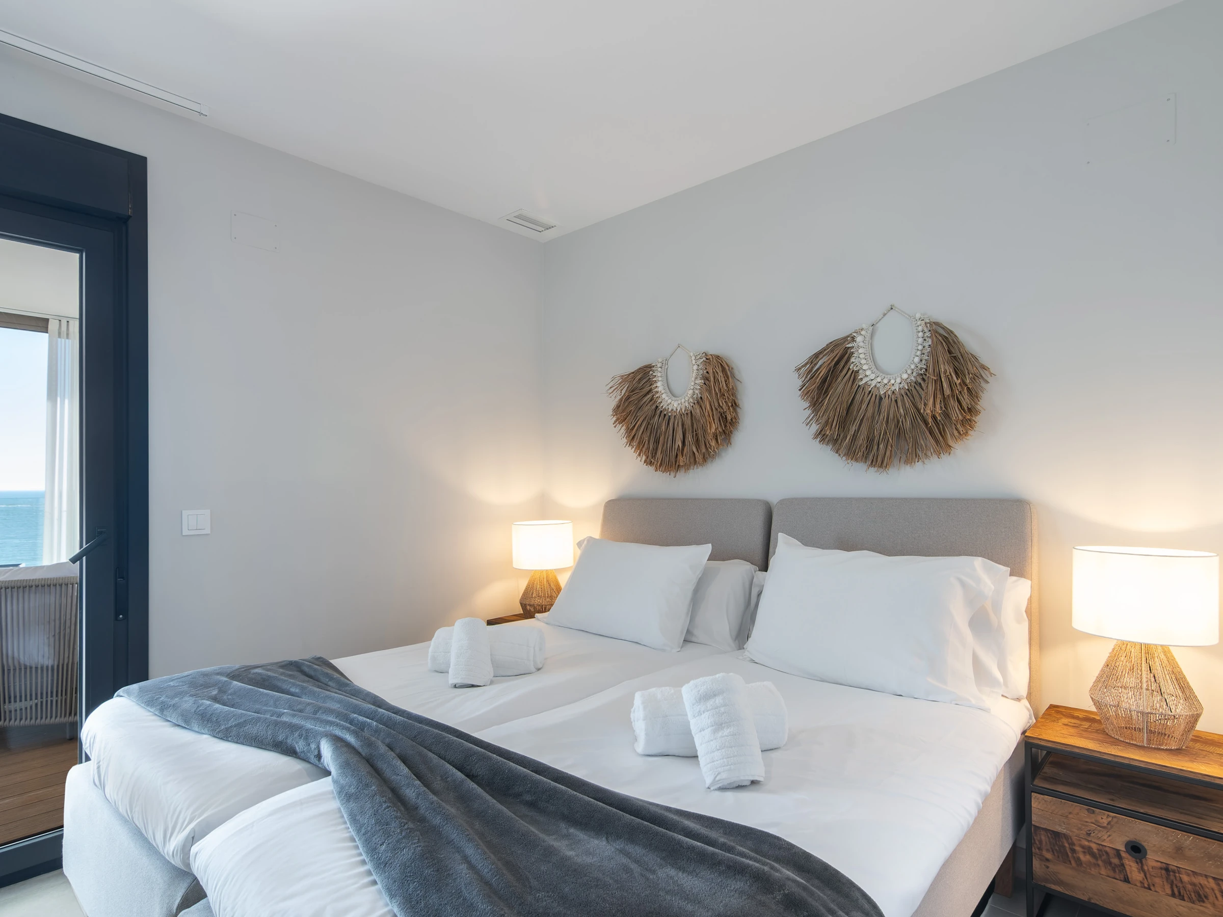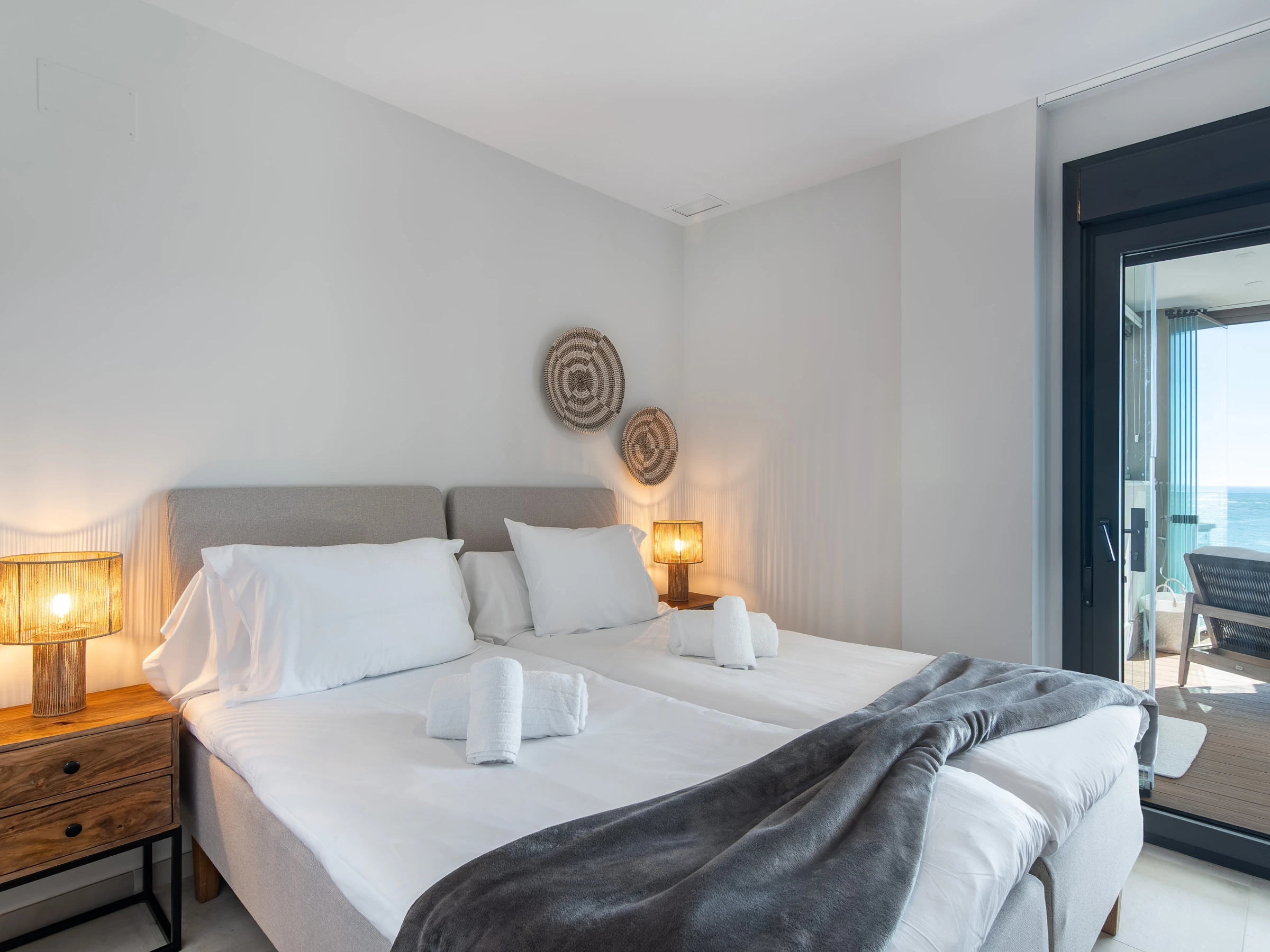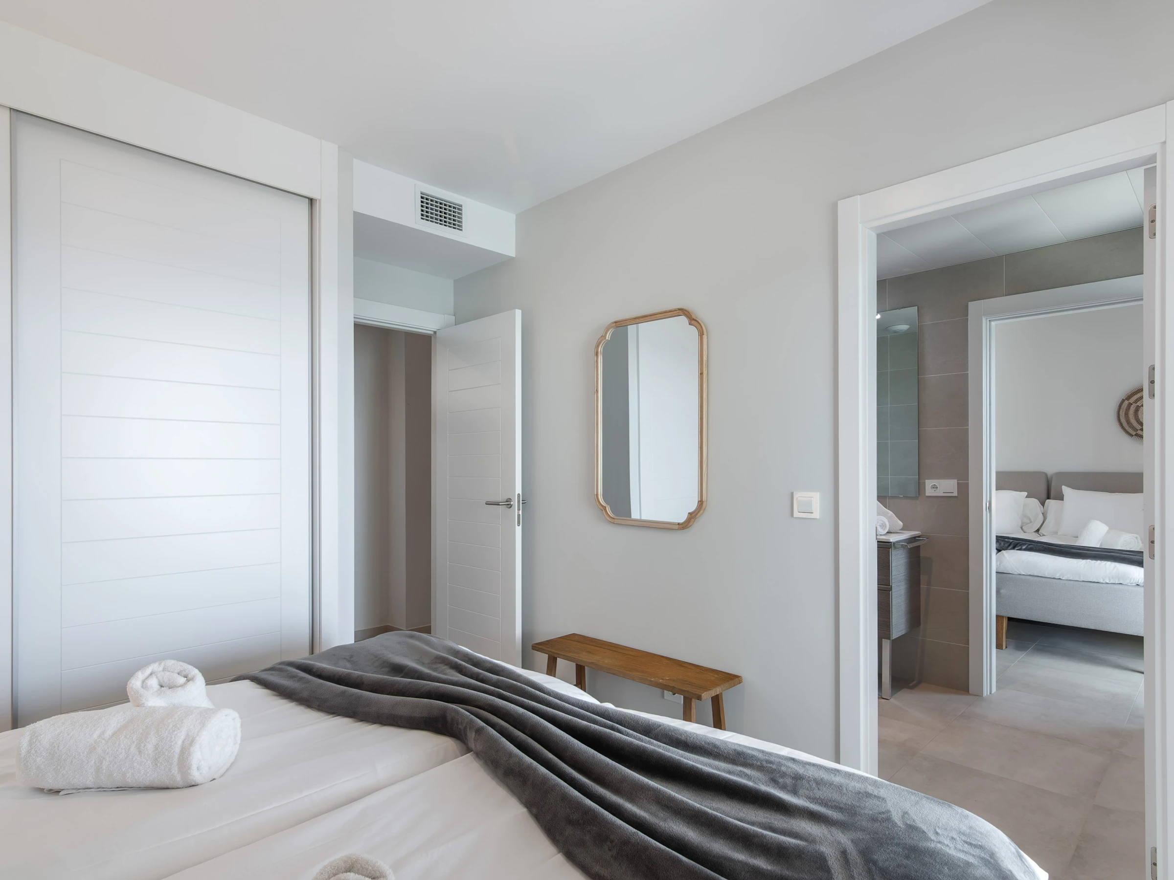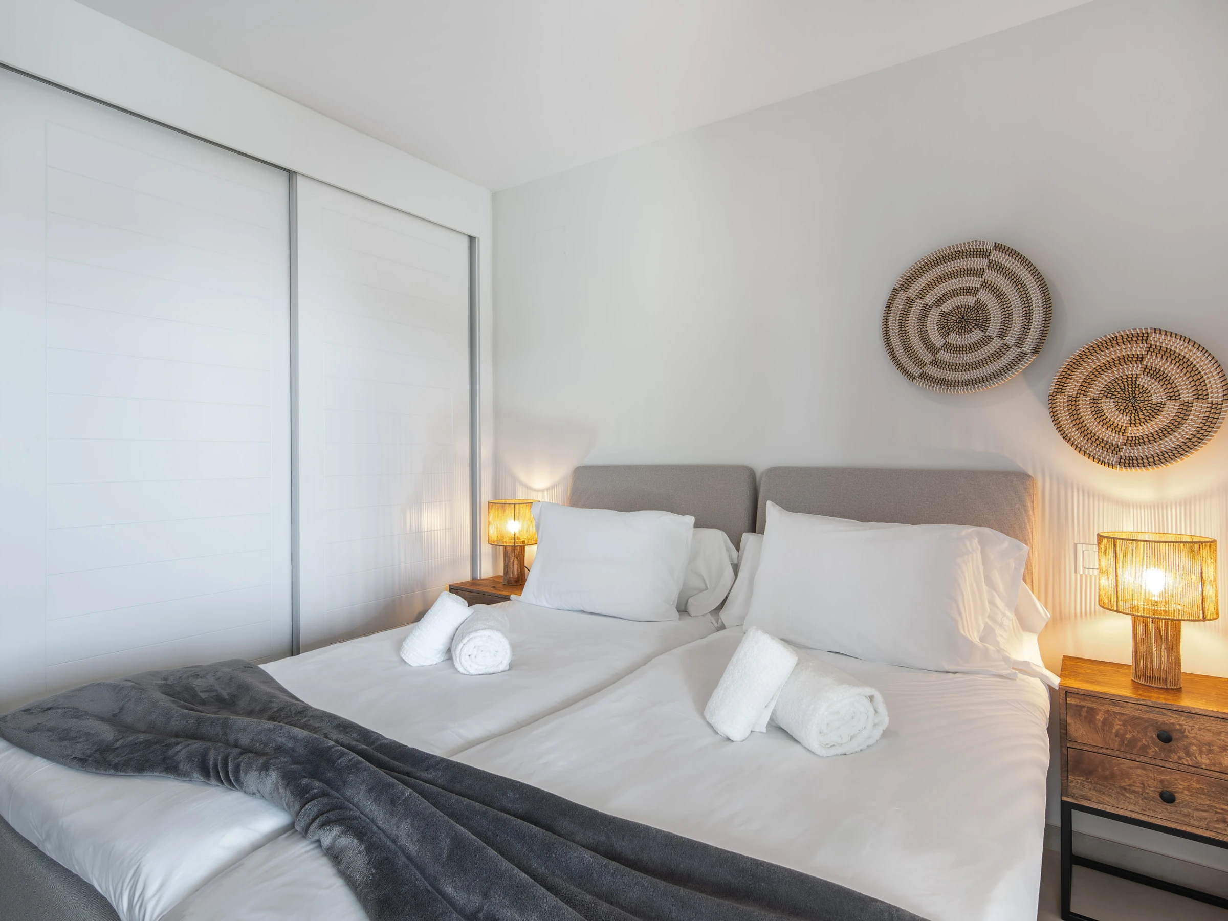 El apartamento cuenta con 3 dormitorios que pueden alojar hasta 6 personas cómodamente, con una distribución de 1 cama doble y 4 camas individuales. Dispone de 2 baños completos con ducha, ideales para familias que buscan comodidad y privacidad.