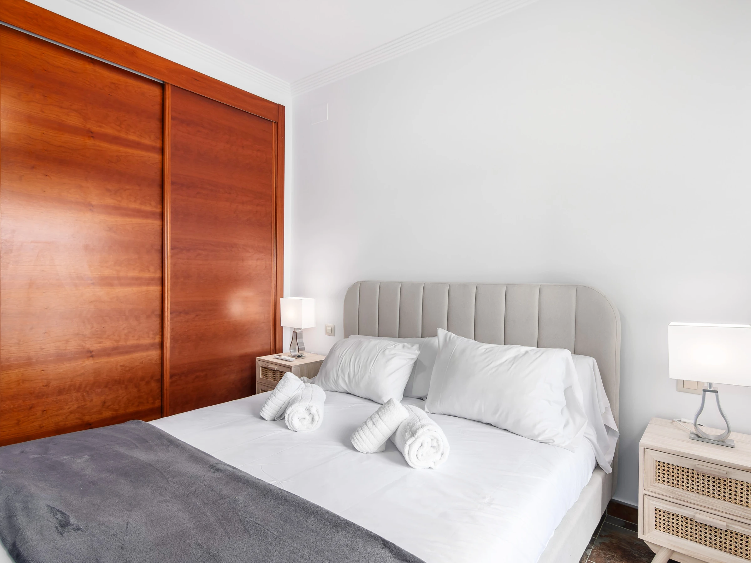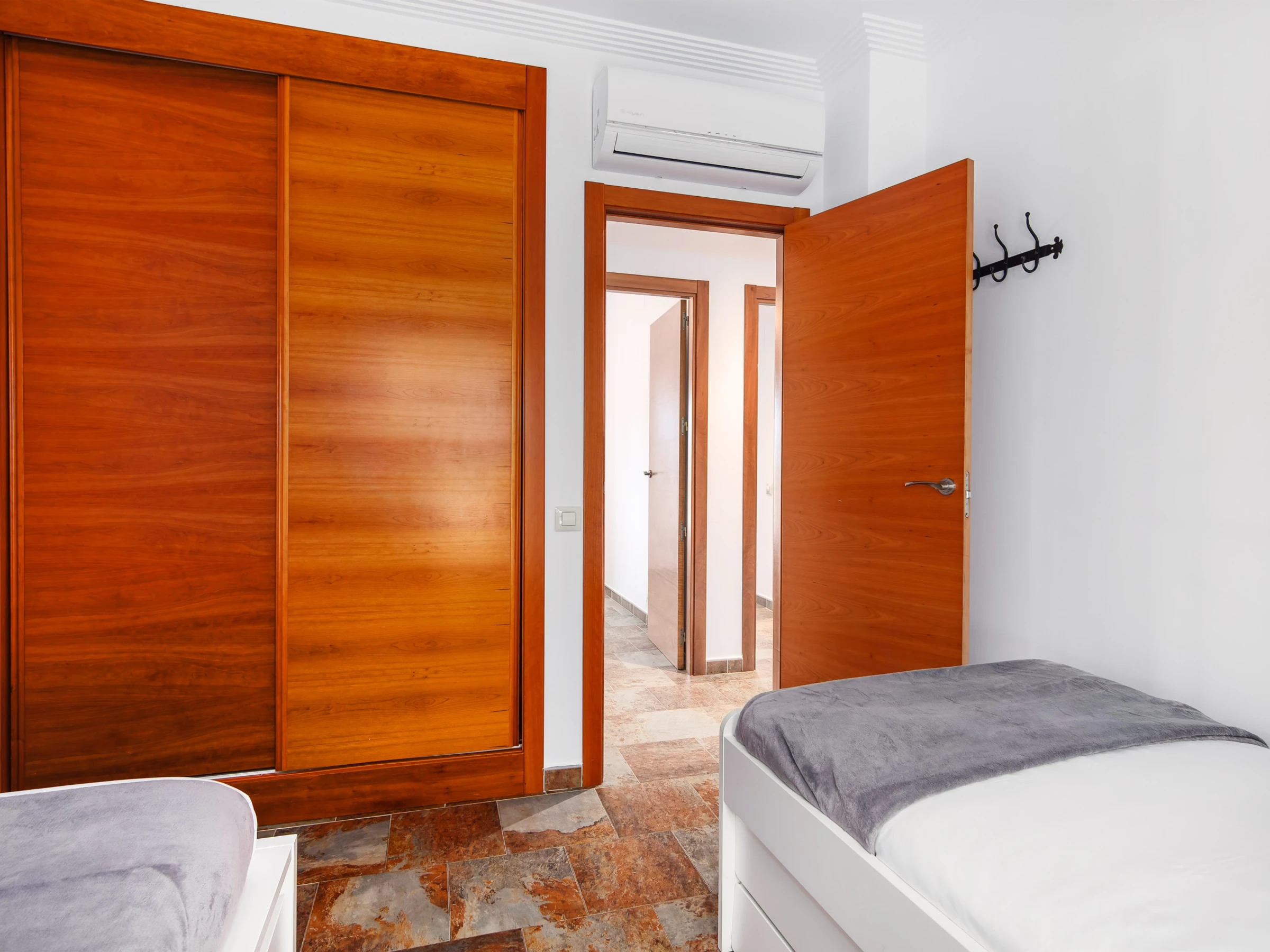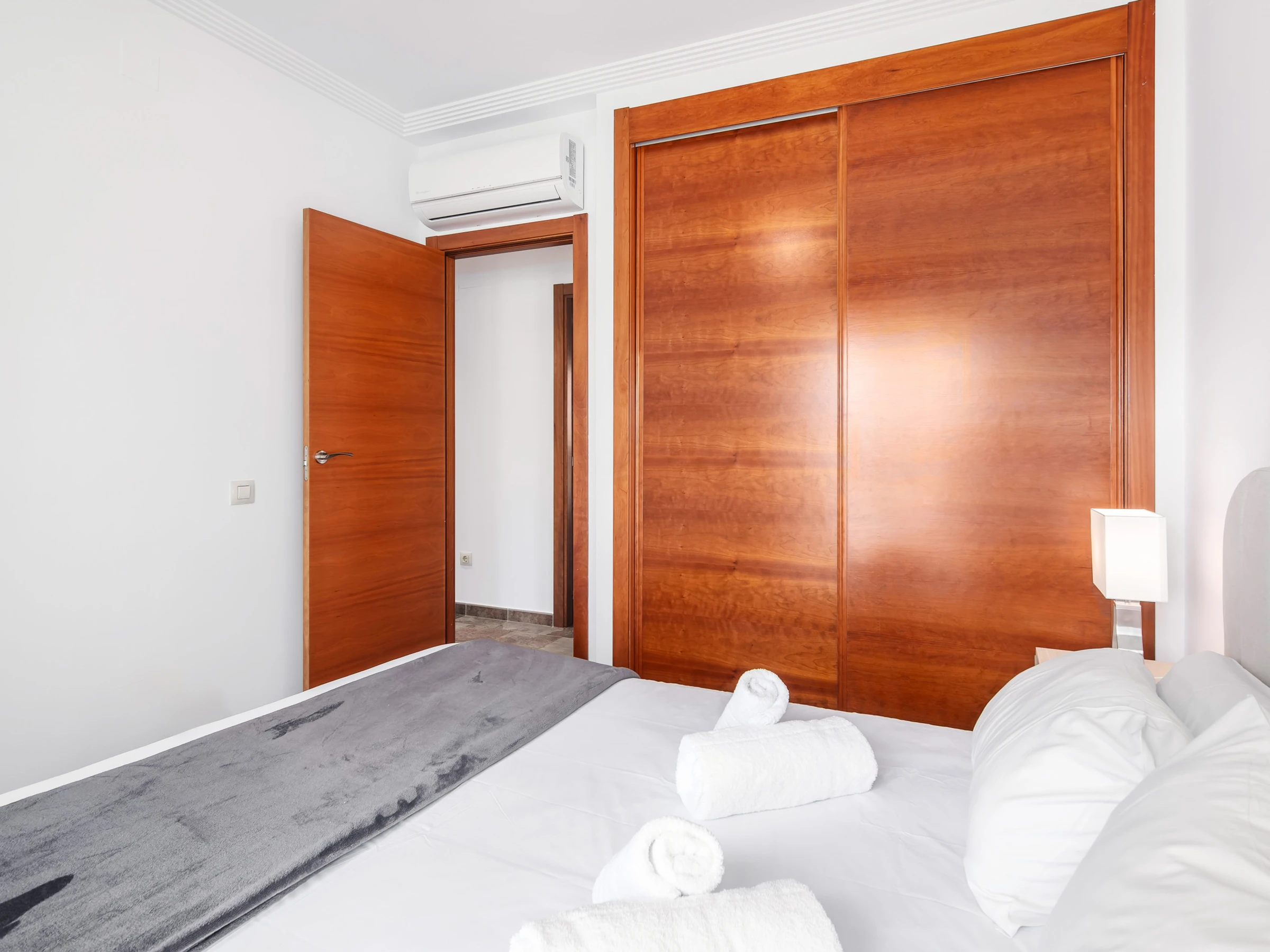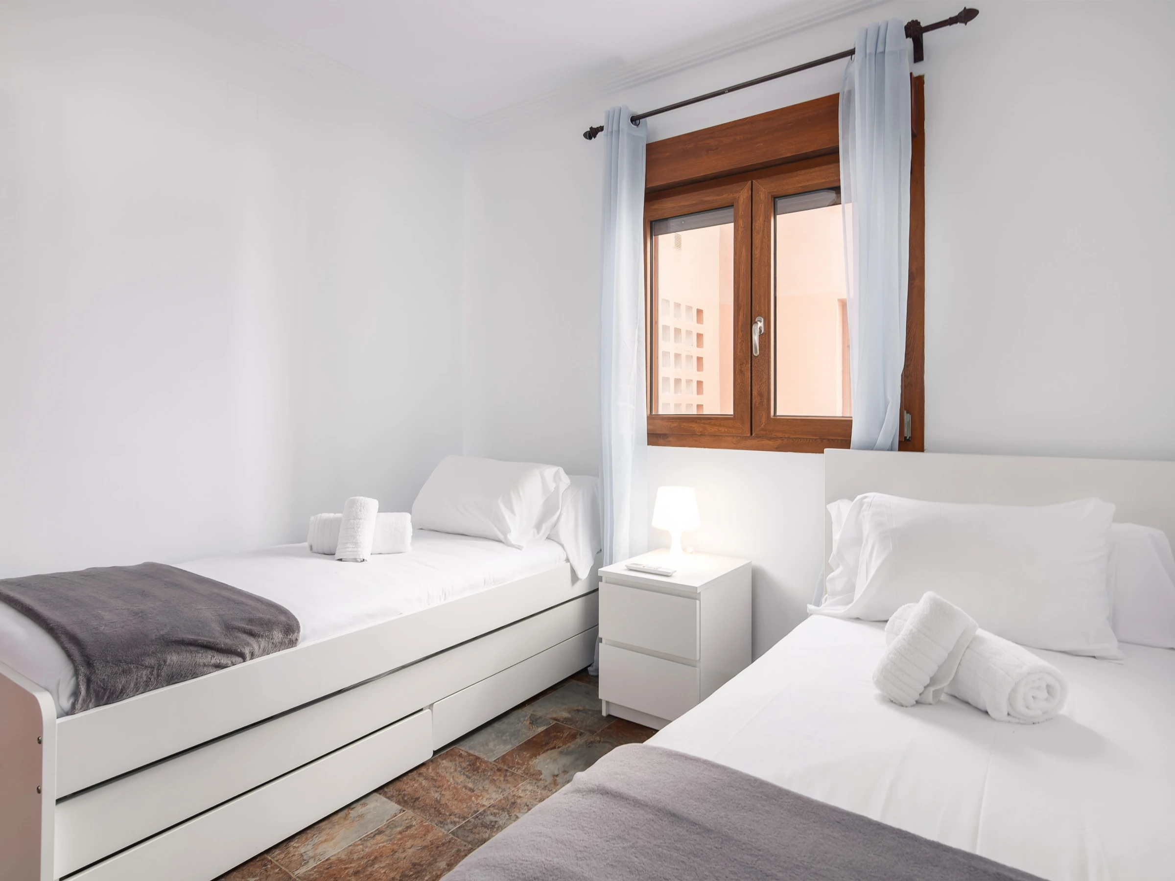El apartamento cuenta con tres dormitorios que pueden alojar hasta 6 adultos, con una distribución versátil de camas: una cama doble, una king size, dos individuales y una cama supletoria. Todos los espacios están climatizados con aire acondicionado y calefacción de bomba de calor para garantizar tu comodidad en cualquier época del año.