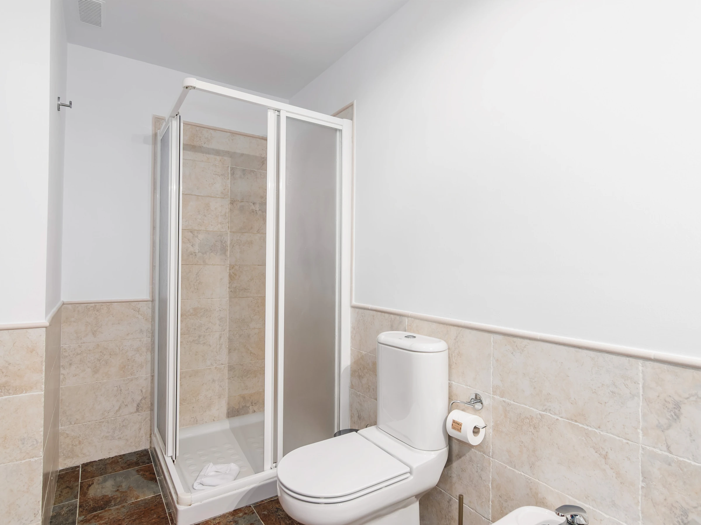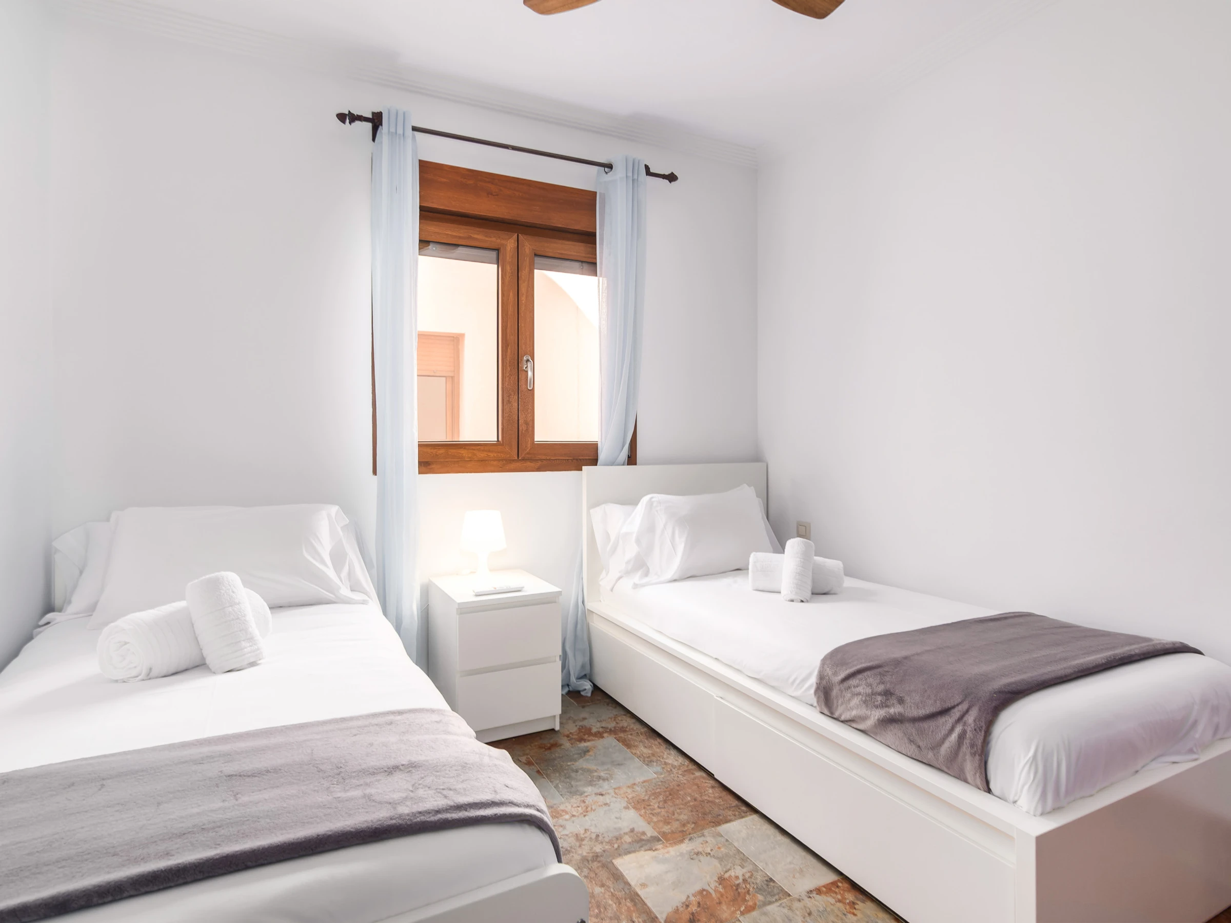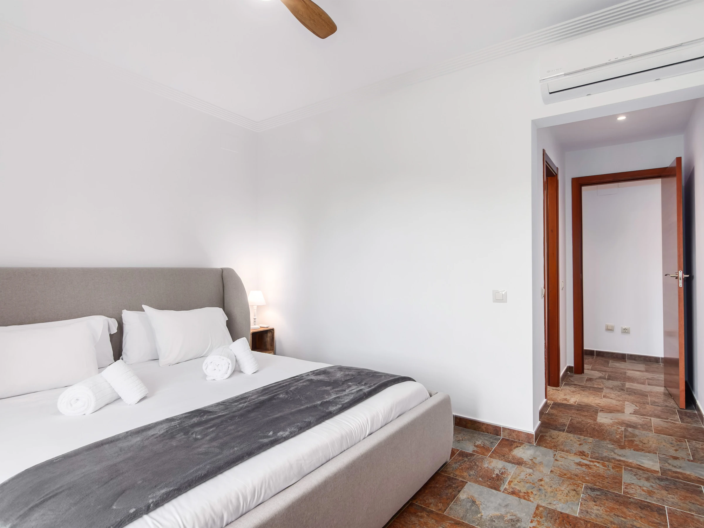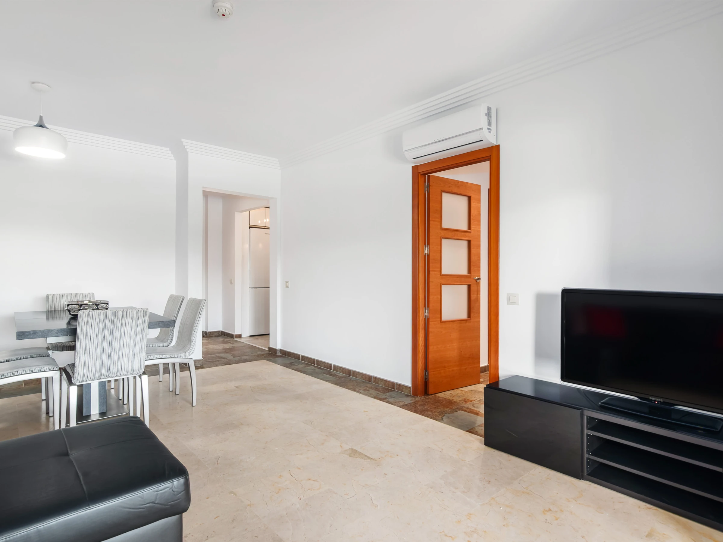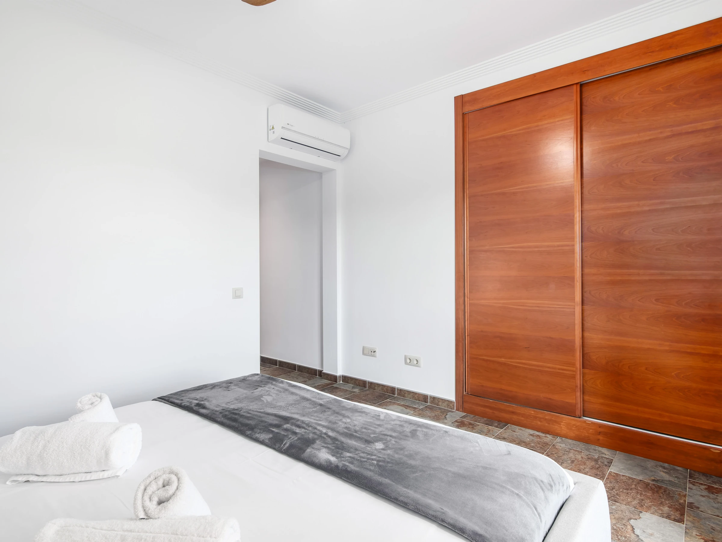 El apartamento cuenta con tres dormitorios que pueden alojar hasta 6 adultos, con una distribución versátil de camas: una cama doble, una king size, dos individuales y una cama supletoria. Todos los espacios están climatizados con aire acondicionado y calefacción de bomba de calor para garantizar tu comodidad en cualquier época del año.