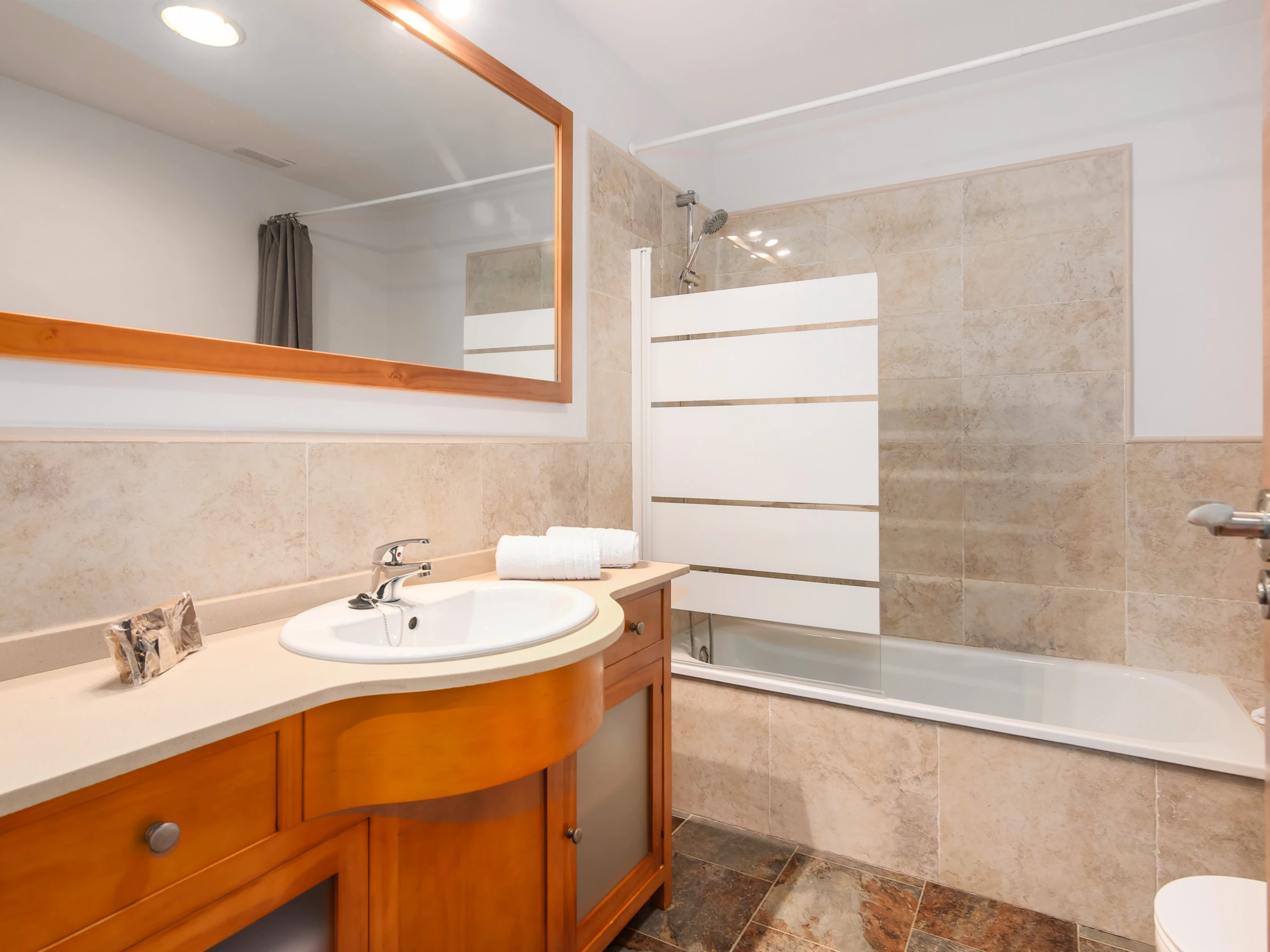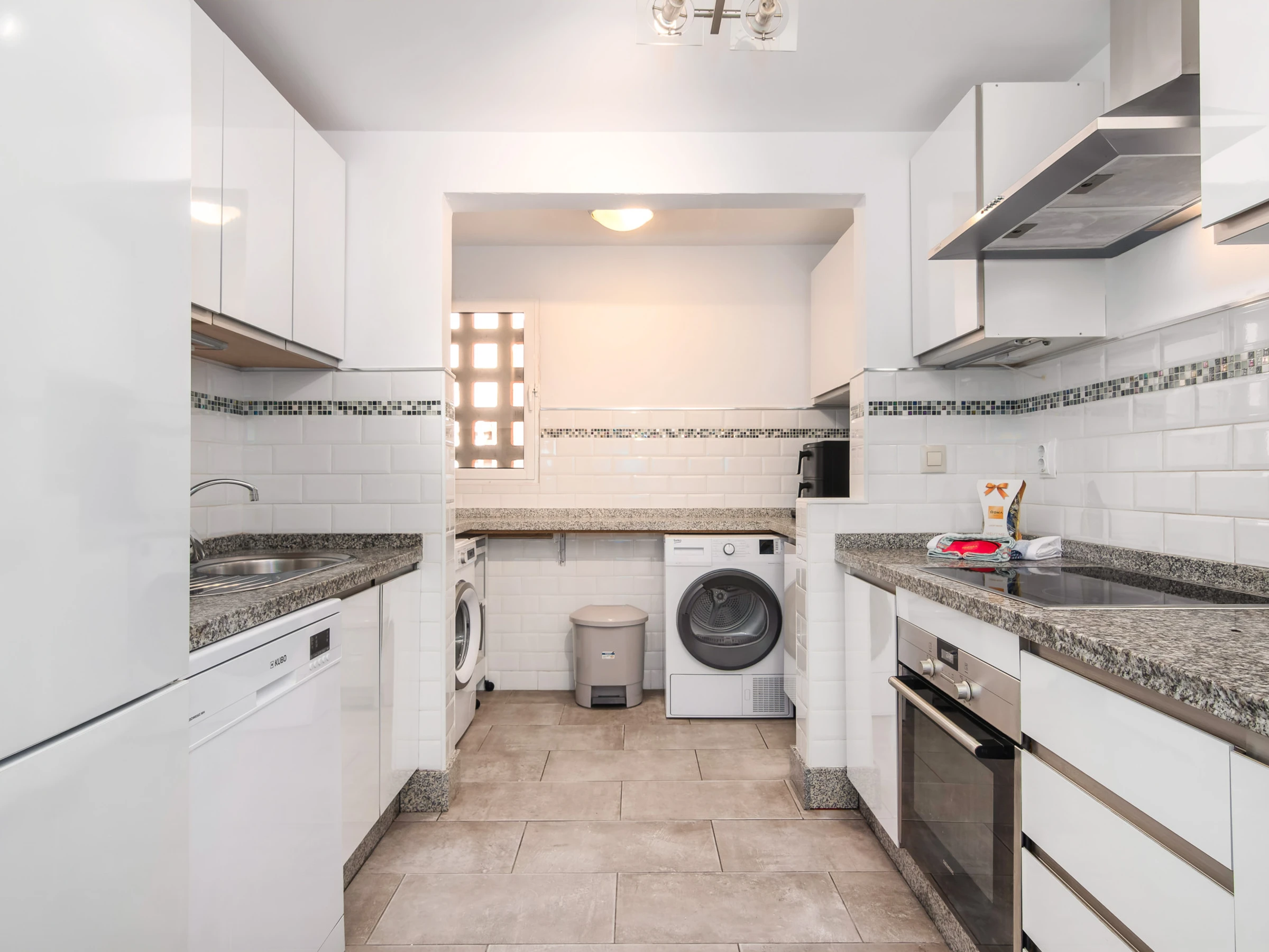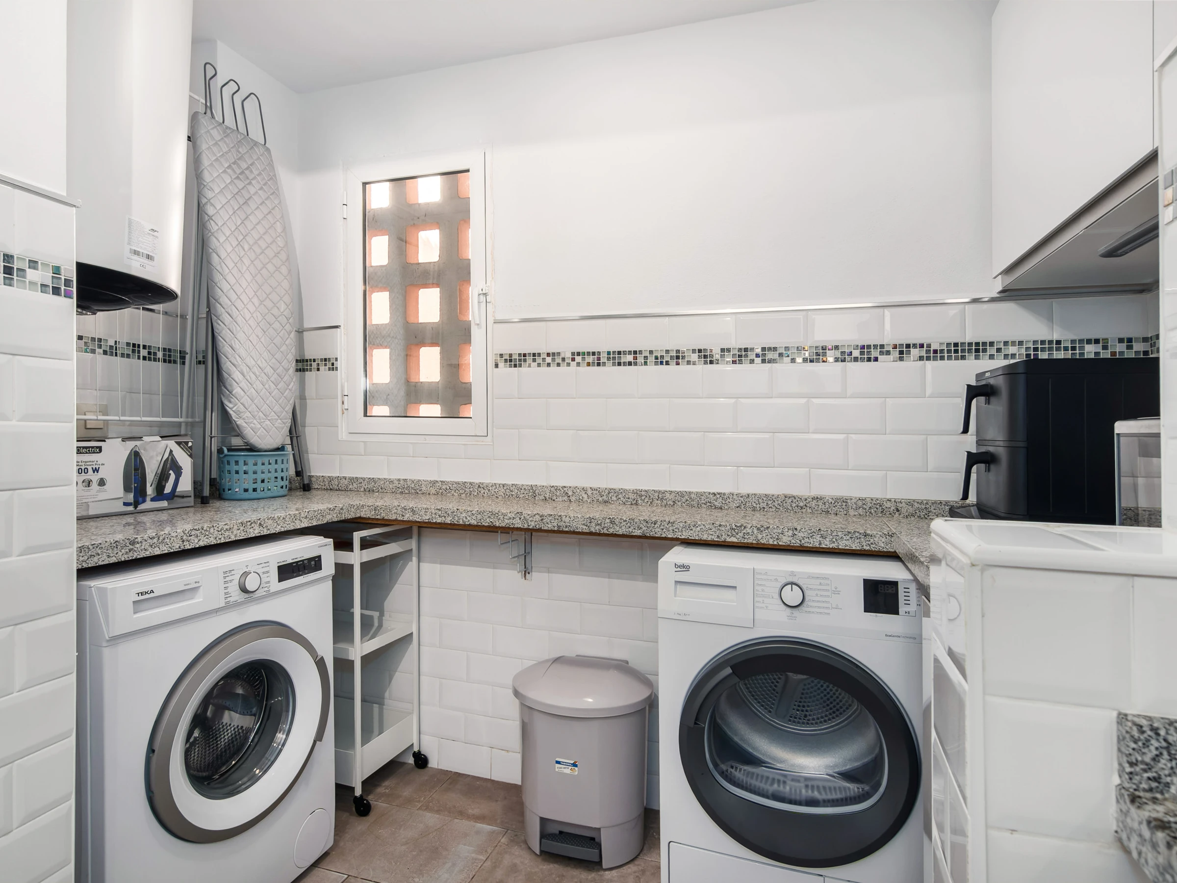 La cocina independiente está completamente equipada con electrodomésticos de última generación, incluyendo lavadora, lavavajillas, horno, microondas, cafetera, tostadora y exprimidor. Además, dispone de dos baños, uno con ducha y otro con bañera, lo que facilita la rutina familiar.